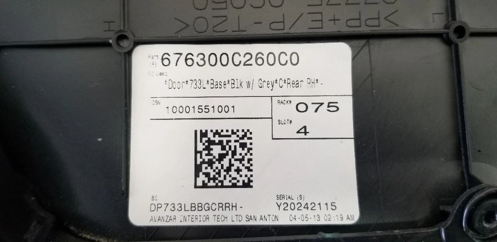 Hollander Welcome to our eBay store! 10-13 Toyota Tundra Rear Right Door Trim Panel Double Cab OEM 67630-0C260-C0 Description Donor Vehicle Model : TUNDRA Year : 2013 Mileage : 0 (0 = not available or unknown) Stock Number : 20-24 Notes : RH REAR DOOR TRIM PANEL/BLK/DBL CAB 67630-0C260-C0, 676300C260C0, 67630-0C260, 676300C260 This Part Will Fit These Makes And Models With These Options About Us Payment Shipping Returns Warranty About Us We are happy to verify fitment for you prior to purchase via your vehicle’s VIN (Vehicle Identification Number). Please contact us with any questions prior to purchasing. Orders are sent to the shipping department throughout the day therefore we cannot guarantee adjustments to orders after payment is received. Parts Grading A standard code system is used to communicate the condition and quality of a part between automotive recyclers, automotive repair shops, and insurers. Knowing how these codes are used will help you understand whether the part meets your expectations before you buy it and what you can expect from the part when you receive it. A Grade - The highest quality part. It is of low miles and/or exceptional condition for its age. B Grade - The second level quality part. It is of average miles and normal condition for its age. C Grade - The third level quality part. It has high miles and/or light damage. No Grade - A part that has not yet been graded. Payment All orders must be paid in full prior to shipment. Payments are processed through eBay. We accept credit card and cash for Local Pickup orders. If payment is not received, an Unpaid Item case will be opened for the sake of seller fee reimbursement. Shipping Items are shipped after receiving cleared payment. We ship to US addresses within the continental 48 states. Shipping to AK, HI, PO Box, APO, FPO & US Protectorates: please contact first as we may be able to arrange shipping for an additional charge (depending on the part). Freight items must have a commercial address and part fitment must be verified via VIN prior to shipment. International orders are shipped via eBay’s Global Shipping Program. Returns All parts must be returned in their original condition to receive full credit. Details regarding timeframe as well as payment for return shipping are outlined in the return section at the top of each individual eBay listing. Please message us with questions. Warranty All parts come with a standard warranty, please contact us for details prior to ordering. Timeframe is listed within the Warranty section of the listing for each part. Warranty claims must be made with our warranty department, details will be included with the packing slip for each order. Labor and costs associated with part installation are not included in the warranty, parts only. Copyright © 2022, All Rights Reserved. Template Design & Developed By: Copyright © 2022, All rights reserved. Design & Developed By : eFusionWorld