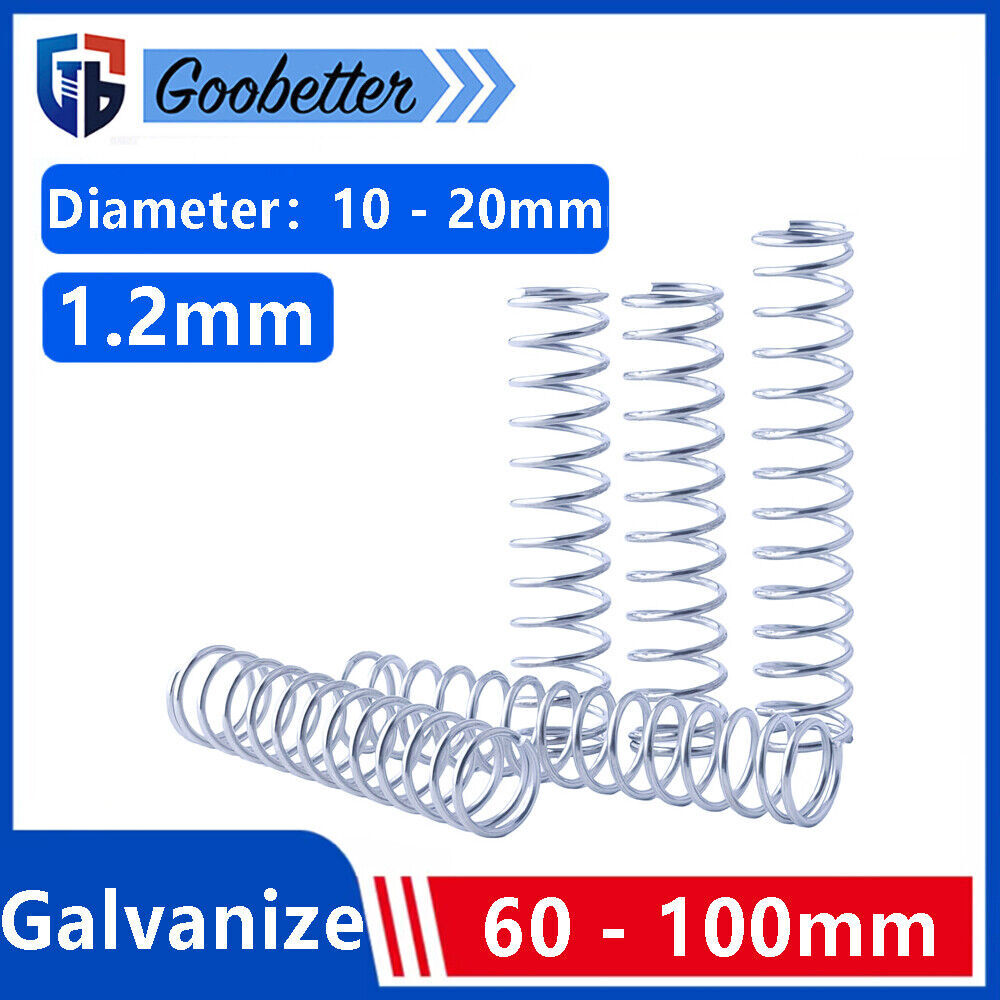 Product description Specifications: 【Features】- Springs occupy an important position in various markets. Stainless steel spiral compression spring, waterproof, rust-proof, durable. 【Application】- Widely used in shipbuilding, computer, electronics, automobile, chemical industry, aerospace, railway, wind power, thermal power, construction machinery, mining machinery, construction machinery, elevators and other fields. Wire diameter:1.2mm Diameter:10 - 20mm Length:60 - 100mm Material:Spring Stee Surface Treatment:Galvanize