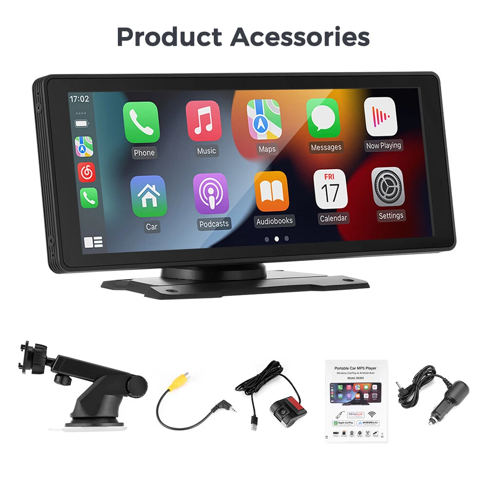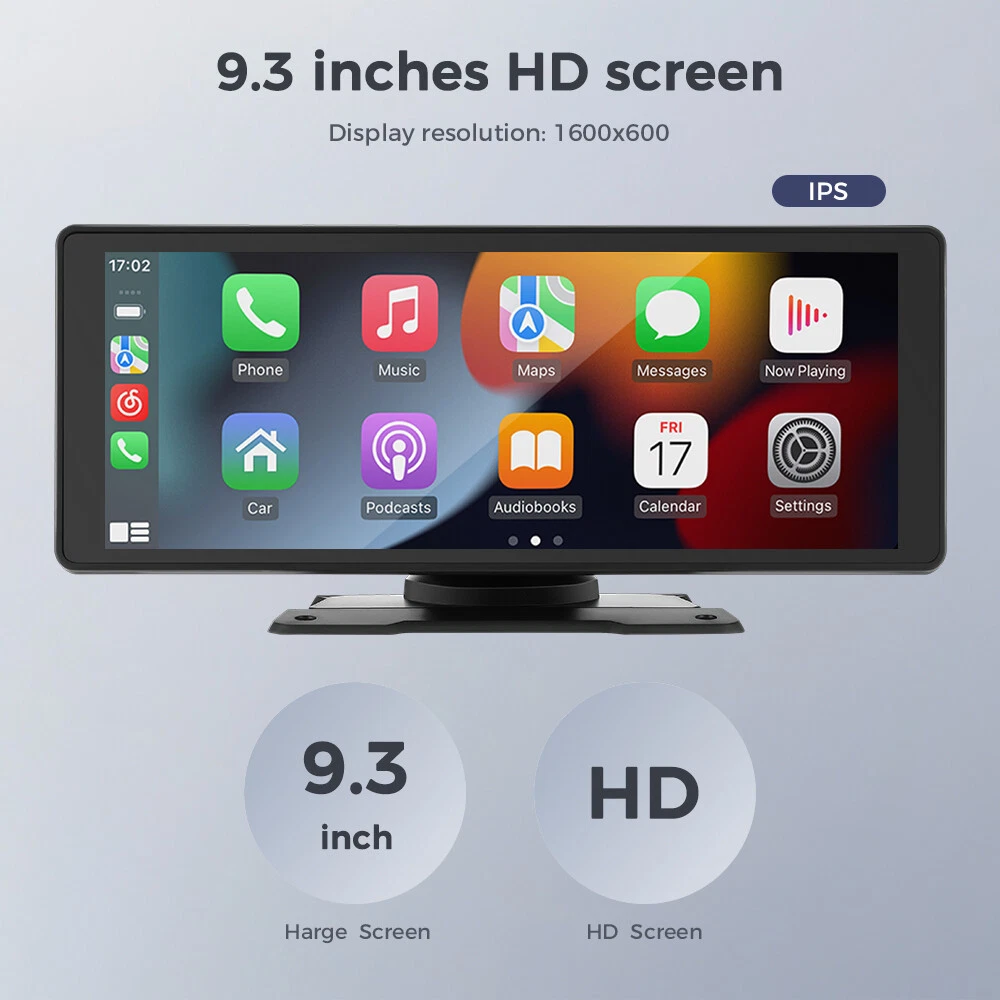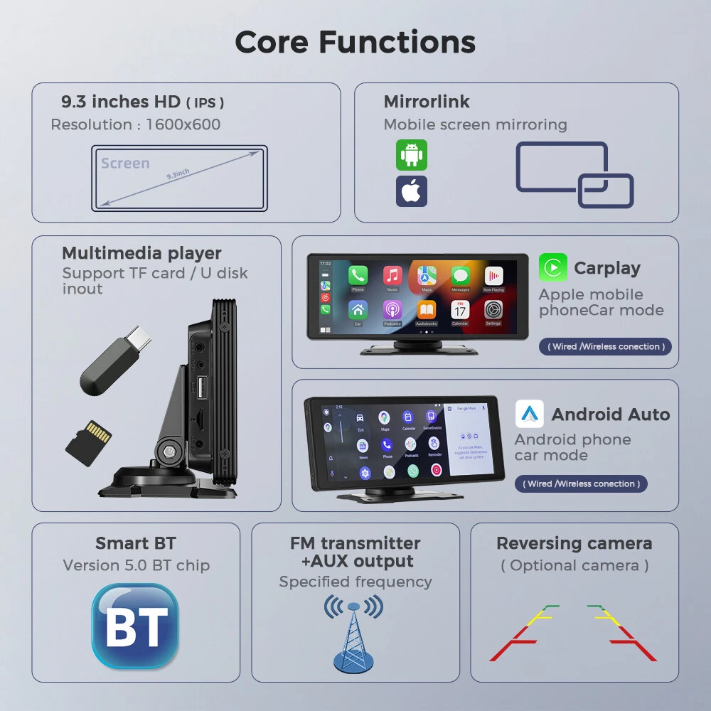 Portable Apple CarPlay & Android Auto 9.3" Touch Screen 2.5K Car Stereo Radio Feature: π FM transmitter function π Supports reading TF cards and USB flash drives (audio/video/picture) π Bluetooth function π Wired phone screen mirroring function; wired and wireless Android Auto/CarPlay π Rear view camera input function π AUX audio output function Specification: Model: B5303 Screen size: 9.3 inches HD (IPS) Screen resolution: 1600x600 OS: Allwinner melis Software solution: F133 Radio transmission frequency: 88.60/89.20/89.50/89.80/91.50/91.80/93.00/93.60/93.90/94.50/95.10/95.70MHz (you can choose one of the preset 12 frequencies to transmit FM signal output audio) Radio transmitter IC: AB5301B Amplifier IC: CS8571E Output power: Built-in 1W speaker Working voltage: DC 12V Working temperature: -10~60β Bluetooth version: 5.0 (default name: CarPlay) WiFi frequency: 2.4GHz/5GHz dual band GPS signal: not supported GPS navigation: not supported RAM: 1Gbit DRAM Shell size: 245x97mm Phone screen mirroring: supports (for iPhone/Android phones) Android Auto: supports (wired and wireless) CarPlay: supports (wired and wireless) Reverse camera input: supports (camera not included) Steering wheel control: not supported Video output: not supported USB interface: USB 2.0 TF card: supports Reset button: not supported Audio output: supports Audio format: MP3/AAC/APE/OGG/M4A/RA/WAV Video format: H263/H264/H265/DIVX HD/AVI/FLV/MKV/MPEG/MP4/WMV9/VC/ASF/TS/QT Picture format: JPEG/PNG/BMP/GIF/TIFF Language: English, Chinese, Spanish, Portuguese, Russian, German, French, Polish, Turkish, Arabic, Hebrew, Italian, Czech, Japanese, Korean, Thai Factory setting password: 113266 Note: 1. When you use the screen mirroring function, the machine cannot display the full screen. If this troubles you, please do not purchase this product. 2. This product has no memory function and cannot save the data set by the machine, such as time, sound effects. 3. The machine does not support night mode selection. 4. To use Android Auto, you need a phone running Android 6.0 or later and usable USB cable connection. Only available if the phone has full Google Framework services and can connect to Google sites. 5. This machine only has FM transmitting function, no FM radio function. What's included: 1 X Car Radio 1 X 720P Dash Cam 1 X Power Cable (Cigar Lighter Plug) 1 X Reverse Video Cable 1 X Stand 1 X Manual Payment Delivery details Return Feedback Contact us Payment * We accept PayPal only * Please verify your address during checkout. We are not responsible for any wrong or undeliverable addresses. * If there is anything wrong with the checkout or you need us to combine the shipping, please kindly feel free to contact us. Delivery details 1. Items are generally shipped out the next business day after your payment has been cleared (Sat. Sun. excluded.) 2. The shipment usually takes 3-5 business days (Saturday and Sunday excluded), if you need the item urgently, please contact us for detail before purchase. * We Ship to Payment address ONLY. So please confirm shipping Address prior to your payment. We are not responsible for any wrong or undeliverable addresses. Return Products with quality problem in 30 days can be returned and refund /replaced (Item in resalable condition) Products with quality problem in 1 year can be returned and repaired. (For more details, please read our warranty policy). Feedback Contact us if you have any question, please give us a chance to serve you, negative feedback couldnβt solve anything, communication Please! Contact us Welcome back to our store! Customers satisfaction is our top priority.