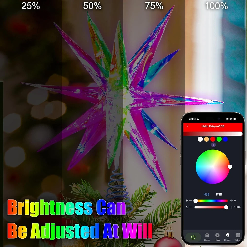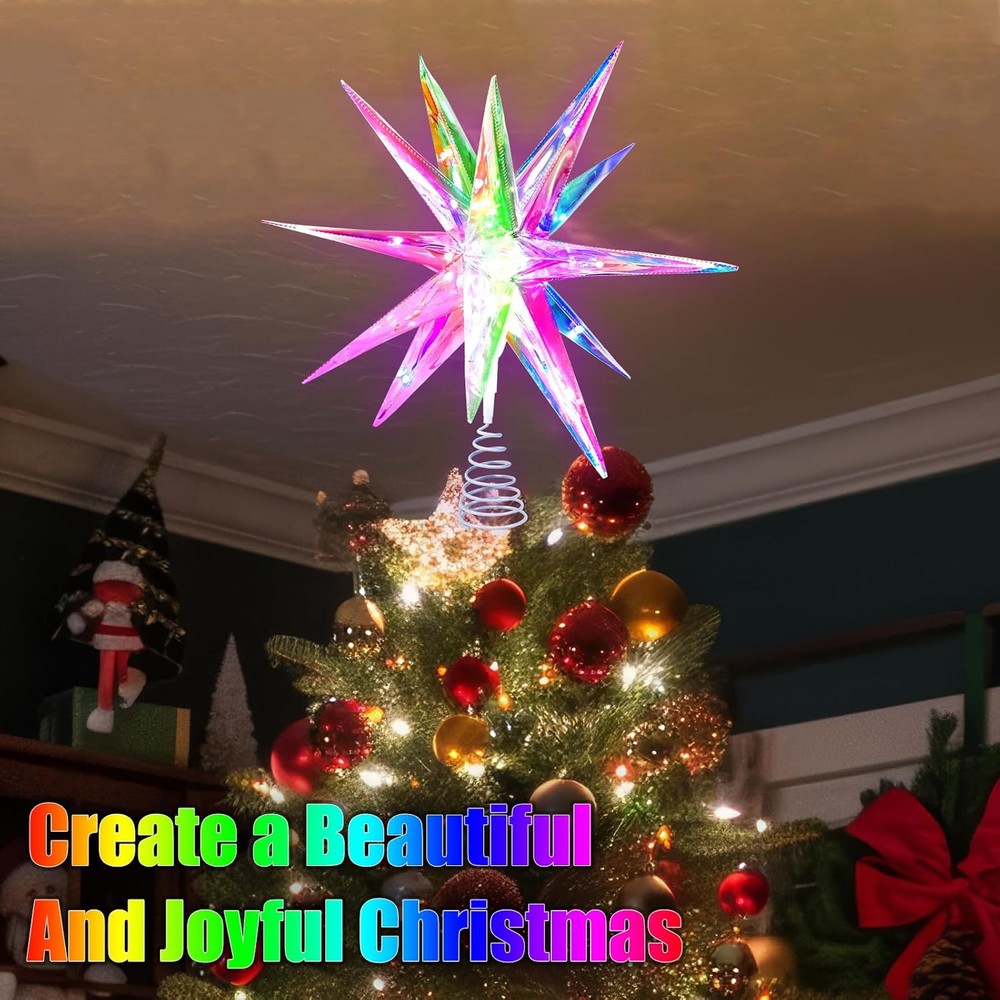 Christmas Star Tree Topper, 10.6" Smart Top of 18 Lights, Color Product Details Color: Color Material: Plastic Brand: TAOQQI Size: 18 Lights Occasion: Christmas Batteries Required?: Yes Theme: Christmas Product Dimensions: 8.6"D x 3.1"W x 8.6"H Recommended Uses For Product: Decorating Christmas tree Manufacturer: TAOQQI Item Weight: 9.1 ounces Item model number: 18 lights Batteries: 1 Lithium Polymer batteries required. (included) 【Best Decoration for Christmas】Our Christmas star tree topper is the perfect Christmas decor. The PET Magic Color Film and bright LEDs create a spectacular display. The film works wonders with light, producing a beautiful, shimmering effect. The LEDs are high-quality, giving strong illumination. The Christmas tree top star fits any tree size. They add elegance and festivity, making your tree the centerpiece. They fill your home with the Christmas spirit, making your holiday season more magical. 【APP and Remote Control】Our Xmas tree star is the best of both worlds with the App and remote control. The app, accessible within the Wi-Fi range, has an intuitive interface for easy adjustments. You can manage over 16 million colors, 80 scenes, and DIY mode. The remote allows quick on-the-spot changes. Whether you're on the couch or near the tree, you can control the lighting to create the perfect ambiance. 【Four Music Modes】Smart Christmas tree star topper has four music modes, these Xmas tree toppers are a delight. The lights sync with holiday melodies, creating a magical harmony. They dance and flicker rhythmically, adding an immersive touch to celebrations. Be it a slow carol or an upbeat tune, the Christmas tree topper the musical experience, becoming an entertainment focal point. 【High-Quality LED Lights & Timer Switch】The LED lights in our Christmas star toppers are premium. They're bright and energy-efficient, reducing your energy bill. Their long lifespan saves on replacement costs. With consistent brightness, the look is uniform. With this star lighted tree topper, you can adjust brightness for different occasions. Plus, there's a handy timing switch. Set on/off times for energy-saving and added user-friendliness. 【Easy to Install and Use】Installation is easy with clear instructions, and no special tools are needed. The controls, via app or remote, are user-friendly. You can quickly change settings. After the holidays, disassemble and store the toppers easily in a small space, protecting them for future use.