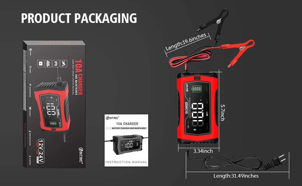 HTRC 12V 10A 24V5A 7-Stage Smart Battery Fast Charging for Car Auto Moto Lithium LiFePO4 AGM GEL Lead-Acid Battery Pulse Repair Features: 1. With repair function to repair old, weak and idle batteries. 2. Supports Lithium,Lead-acid(AGM,GEL,SLA,Flooded,WET,EFB,etc.) and LiFePo4 battery. 3. The charger has auto-memory function and will return to the last mode when connected. 4. Charging voltage automatically adapts to temperature to prevent over-or under-charging. 5. With overcharge protection, reverse polarity protection, short circuit protection, sparks free contact, etc. 6. Fully automatic microprocessor control. 7-stage charging program provides the best and most efficient battery charging. Specification: Product model:10A Charger Color:Red AC Input Voltage:100-240V~50/60Hz Input Power with Load: Max:120W Output Voltage :12V/24V Output Current:12V Max:10A / 24V Max:5A Suit for Battery Type :Lithium,LiFePO4,Lead-acid[AGM,GEL,SLA, Flooded,WET,EFB,etc..] What you Get: 1x 10A Charger 1x User Manner 1x Clip line 1x AC Cable( US OPtional) Payment Delivery details Terms of sales About us Contact us Payment We accept all common forms of payment such as Credit cards、Debit card、Google Pay ect. Immediate payment is required. Otherwise a Unpaid Item case will be opened to you. We are not responsible for buyers’ local taxes. Please include your special requests in eBay note if there is any. Delivery details Order will be shipped within 1-3 business days after payment confirmed. We have warehouse in USA, Australia and China warehouse. Notice: For USA Buyer, we have warehouse located in California and New Jersey , parcel will be shipped from the nearest warehouse according to Buyer's address. From our US warehouse via UPS/USPS or DHL eCommerce shipping. Delivery time varies from 2 to 6 business days. Delivery time varies from 3 to 8 business days. From our AU warehouse Via AU Post shipping ( Delivery time varies from 6 to 12 business days. 3. From our China warehouse For CA buyers, we use SpeedPAK (Delivery time is 10-25 business days) or express delivery(Delivery time is 10 - 20 business days) . We will ship according to your eBay address. Please make sure it is correct and include phone number for delivery. If you do not receive your order in the estimated time, please contact us, we would do our best to serve you solve the problem. Please include your special requests in eBay note if there is any. Terms of sales We are original distributor, our all items are 100% original and Our devices have warranty 6 months free repair for the devices. 3 months for the accessories. Please contact us firstly when you need warranty service. In case an item arrives faulty, please contact us in 30 days and keep it unused . We will instruct you on how to return and get refund or replacement. If after 30 days, or the item has been used, we have the right to decline your claim. Items should be returned on buyers’ cost for repair or replacement. About us Who We Are? We are original factory of On-automotive electronics for more than 10 years. What Do We Have? We have office of China to ensure fast shipment and after-sale service. We have more than 100 employees devoting to customer satisfaction. Terms of tax: We are not responsible for buyer's local taxes, please consult your local Customs for tax details. Contact us Our customer-oriented service strives for positive feedbacks with all 5 star selling ratings . Please feel free to contact us via eBay message once you have any question before you giving us negative feedback or open case. We will reply in 24 business hours . Business time: GMT8 (9:00-18:00) from Monday to Friday.