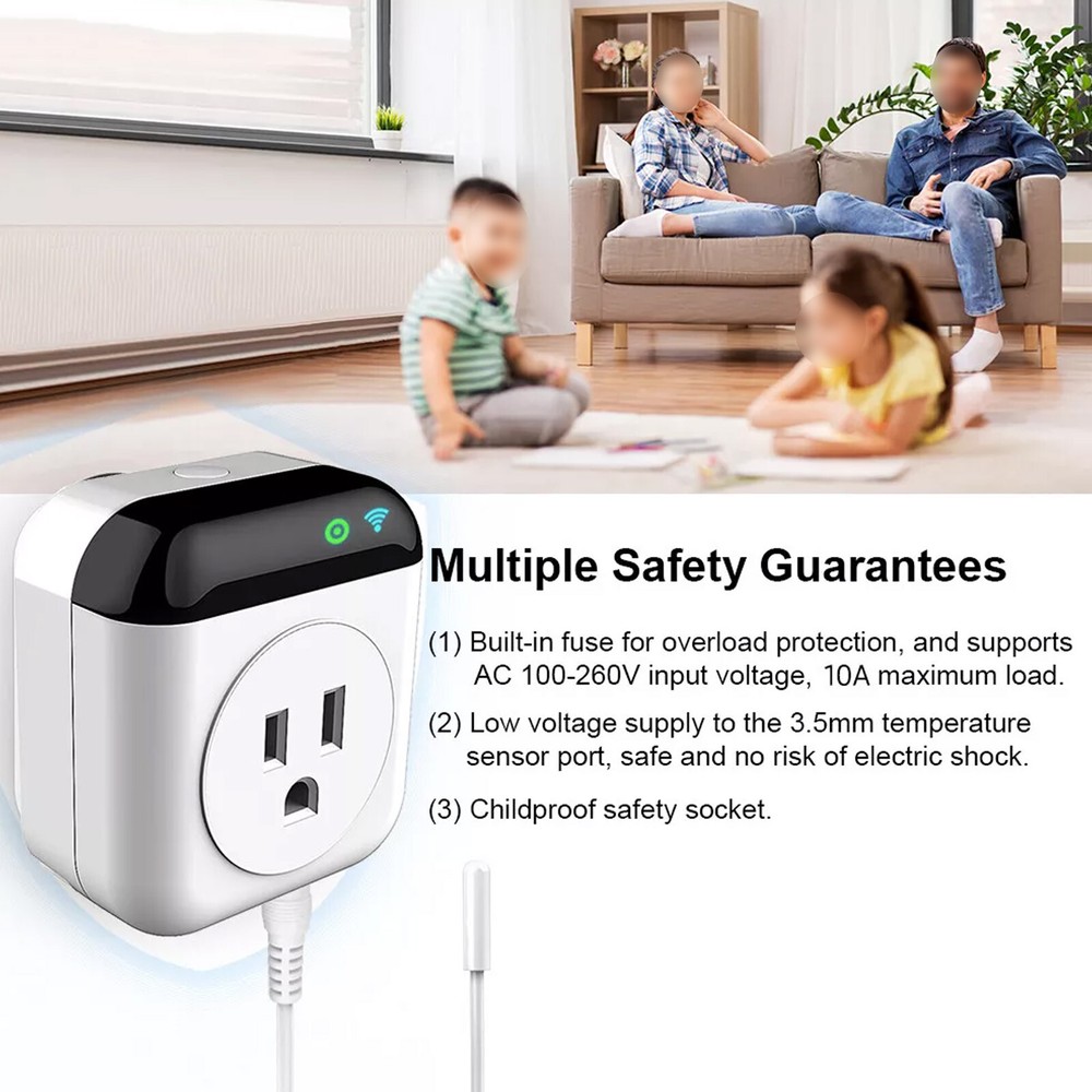 The product is an app-controlled, smart, programmable thermostat that helps you save energy and stay comfortable. It's compatible with most heating or cooling applications with a plug, convenient and practical to use, bringing you smart daily life. Features: APP Remote Control: You can control the smart plug through APP in your smartphone via 2.4GHz Wi-Fi connection. Control it from anytime anywhere. Programmable Thermostat: Easy to set schedules, temperature (-20~100℃/ -4~212℉), and countdown timer with your smartphone. Hands-free Voice Control: Compatible with Alexa/ Google Assistant, allowing you to control connected devices with simple voice commands. Multiple Safety Guarantees: (1) Built-in fuse for overload protection, and supports AC 100-260V input voltage, 10A maximum load. (2) Low voltage supply to the 3.5mm temperature sensor port, safe and no risk of electric shock. (3) Childproof safety socket. Wide Use: Applicable to portable space heaters, infrared heaters, oil-filled radiators, electric fireplace heaters, window air conditioners, evaporative coolers, swamp coolers, etc. Mini Size & High Quality: Compact and lightweight, easy to use and carry, space-saving whether or not it's in use. Made of high-quality and safe material, High quality to use. Note:Size and color may be slightly different due to manual measurement and different light conditions. Thanks for understanding. Specifications: Color: Black & White Plug Type: US Plug and UK Plug Material:ABS Input Voltage: AC 120V, 60Hz Max. Load: 10A Max. Power: 1200W Temperature Measurement Range: -20~100℃/ -4~212℉ Temperature Sensor Length: 50cm / 19.7in Wi-Fi Requirement: 2.4GHz Wi-Fi APP: Compatible with 'Smart Life' Support System: Compatible with Android/ iOS Item Size: 70 * 64 * 35mm / 2.76 * 1.38in Package Size: 10.5 * 7.5 * 10.8cm / 4.13 * 2.95 * 4.25in Package Weight: 180g / 6.35oz Package List: 1 * Smart Socket 1 * User Manual (English) Your satisfaction is our eternal pursuit Payment: The buyer is responsible for any applicable import duties and local taxes. Usually there's not any charges for small parcel. But please verify with your customs before making your purchase. Return: If you are not completely satisfied with your purchase, simply return the item to us in its original condition within 14 days of receipt. We will issue a full refund on receipt, excluding the return delivery charge. About US: We are a professional foreign trade e-commerce company, mainly engaged in foreign trade B2C platform business. Our foucs includes instrument meters and accessories, household items, car accessories, Led lighting etc. Our company is energetic and creative and wish to bring you great service and amazing experience.