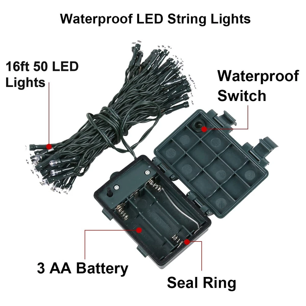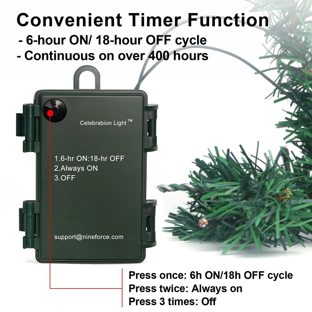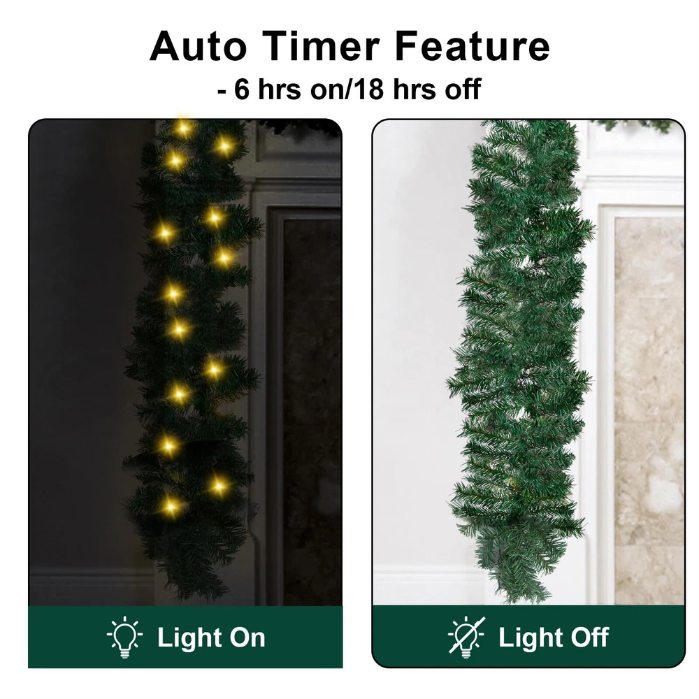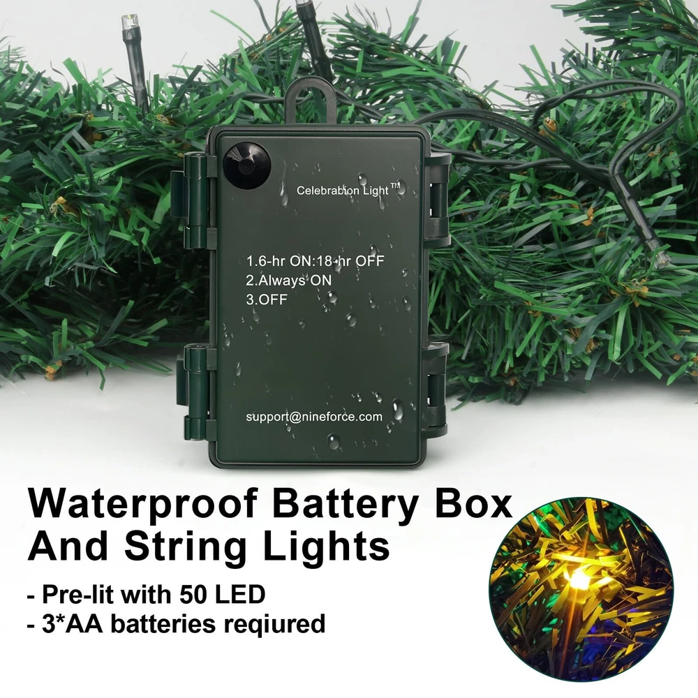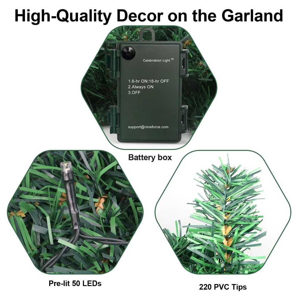 Christmas Garland PRELIT - 50 waterproof LED lights. TIMER - 6 hr on and 18 hr off cycle. BATTERY BOX - no power cord hassle. FLUFFY LOOK - 220 realistic branch tipsTotal of 10 ft long,10 in wide. EASY TO CONNECT - Rings at both ends for easy strong connection as a longer garland.