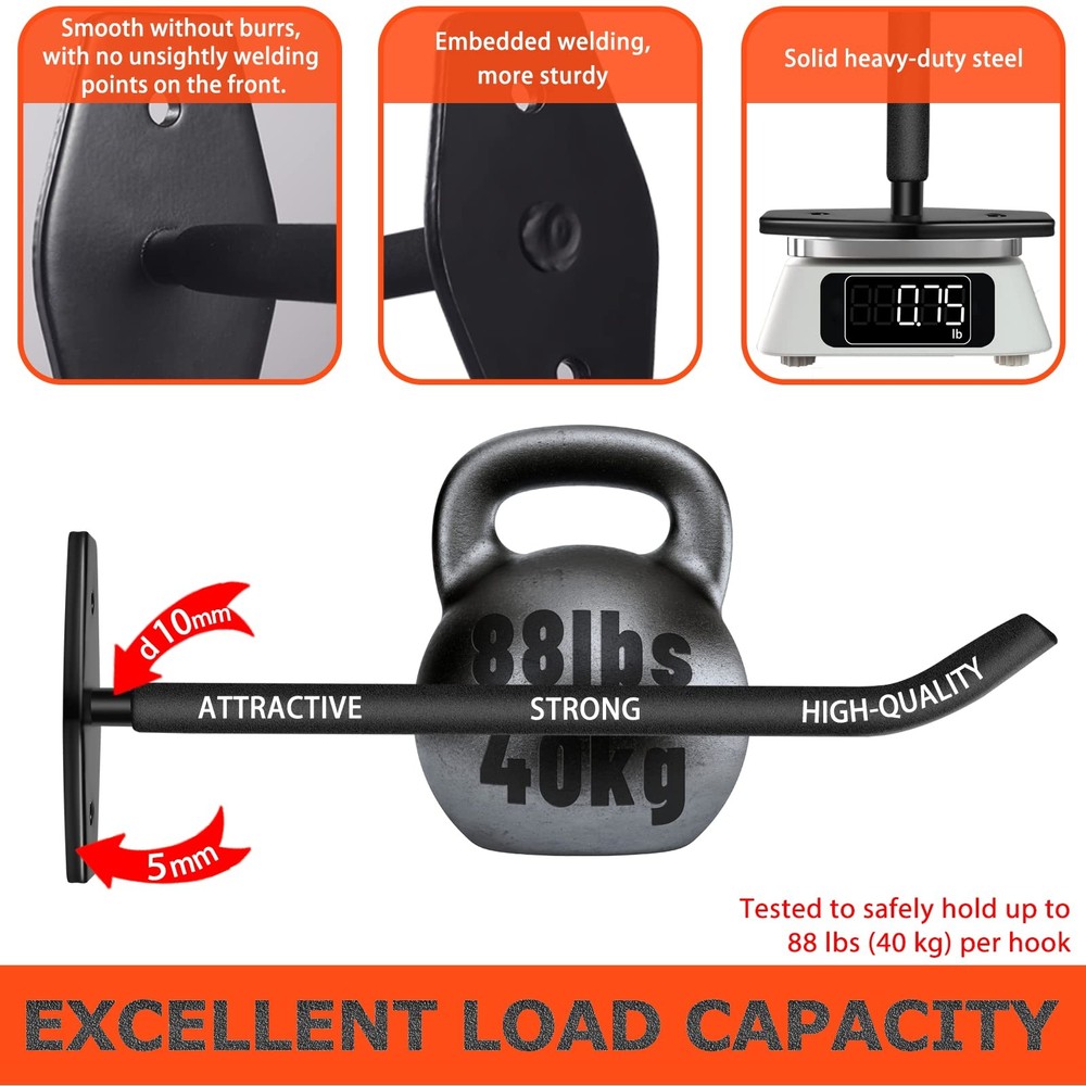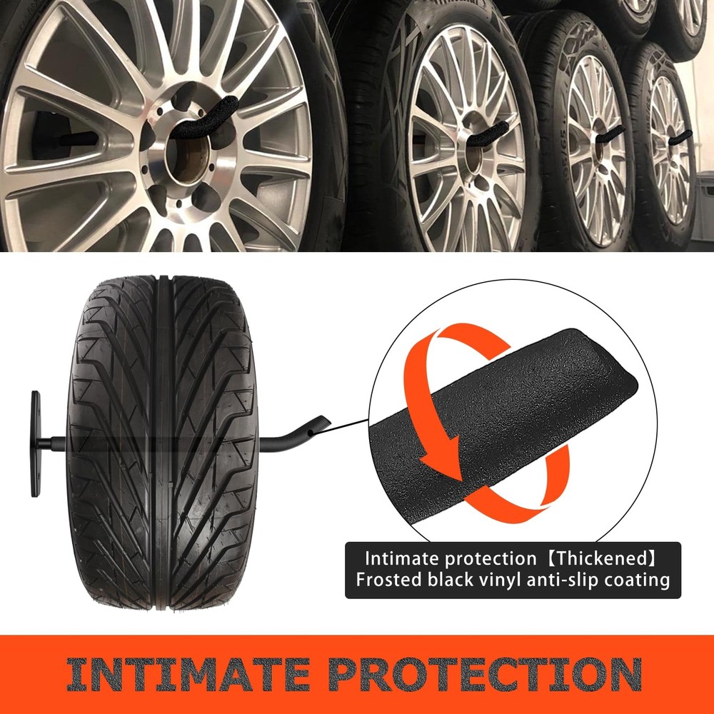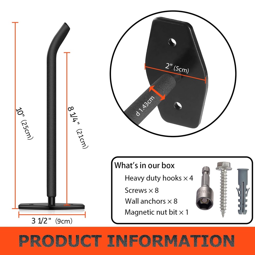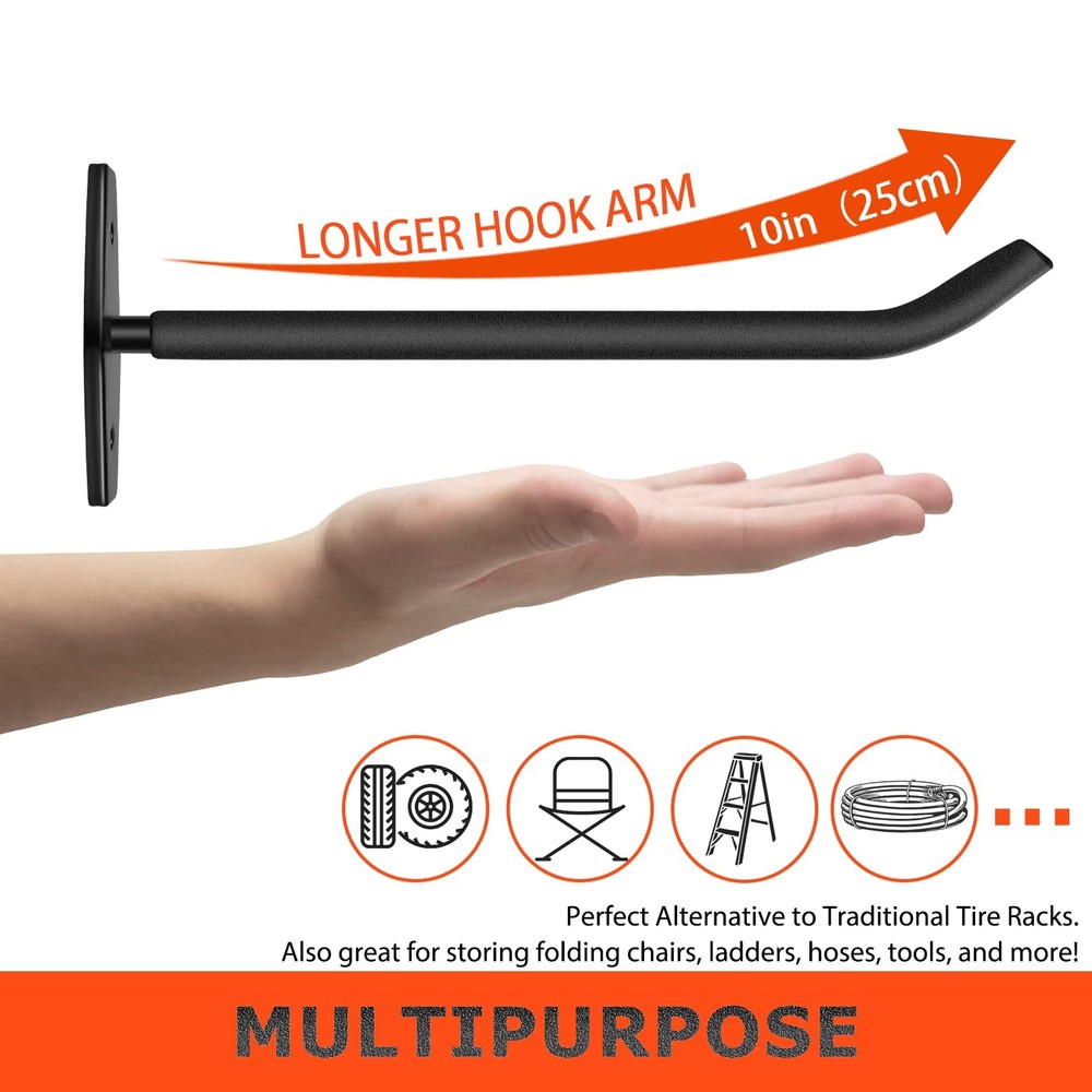 ▶【PREMIUM MATERIALS】10mm solid steel, black anti-rust powder coating, and black vinyl anti-slip coating ensure durability and tool protection for our heavy duty wall hooks. Suitable for indoor and outdoor use. ▶【PREMIUM DESIGN】10" extra-long arm single hook offers versatile storage, a great substitute for bulky tire storage racks. Concealed welding ensures clean aesthetics with no visible welding points. ▶【SUPERIOR STABILITY】Tested and proven to safely hold up to 88 lbs (40 kg), our garage storage hooks can be used as display racks for tires and wheels, as well as for storing bulky and heavy items like bike, ladder hanger, weedwacker, extension cord, and yard tools. ▶【SAVE SPACE】The garage wall hooks are easy to install (including high-quality installation hardware), maximizing your space and keeping your garage, basement, workshop, or organized. ▶【INSTALLATION TIPS】tire rack for garage is designed for high load capacity. For best results, we recommend installing them on studs, cement, concrete, or brick walls, rather than drywall. This will ensure the safety and stability of your items.