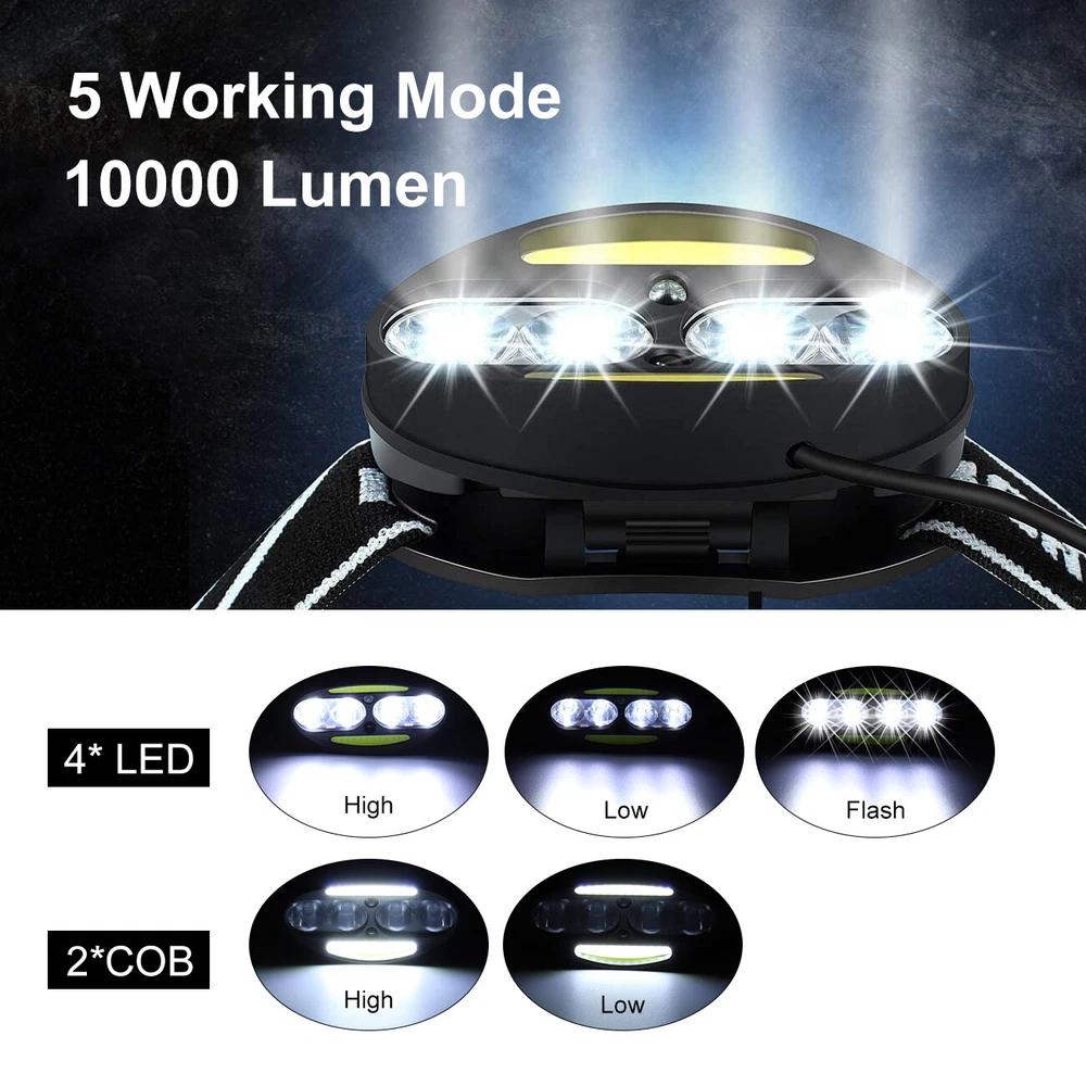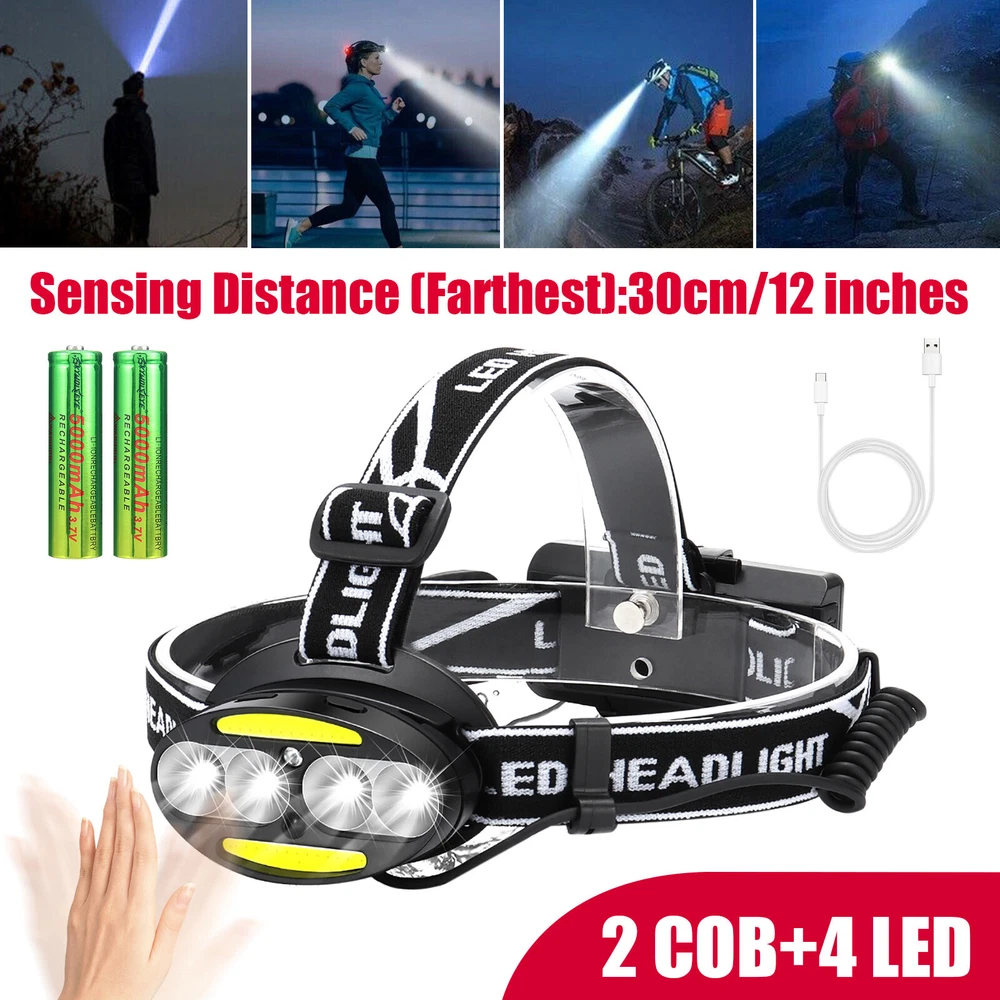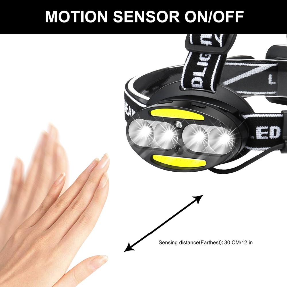 This headlamp is a game-changer! Super bright with the 4 LEDs + 2 COB chips, and the motion sensor is so convenient. Love that it’s USB rechargeable and the angle adjusts for any task—perfect for work, camping, or emergencies. No more fumbling with switches since it turns on/off automatically. Super lightweight and comfy for long wear. A must-have for hands-free lighting!