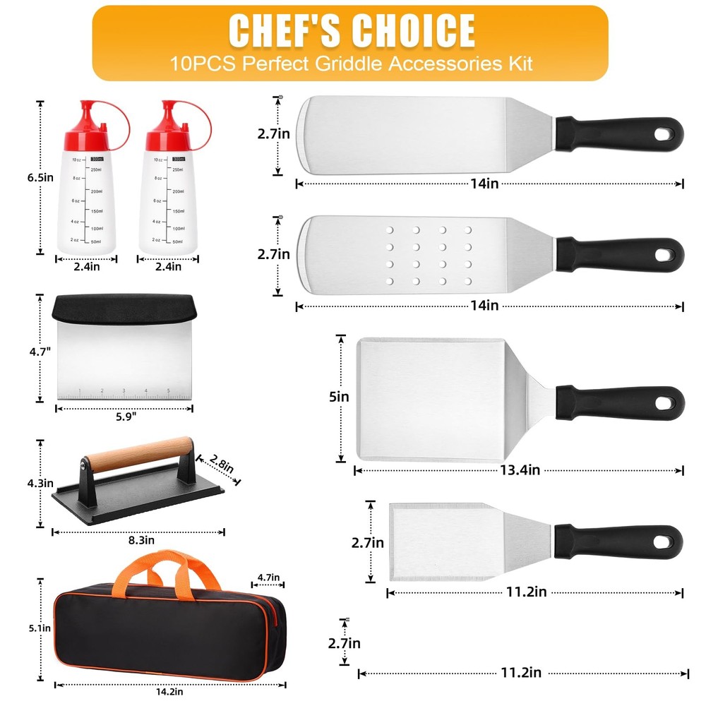 10PCS Blackstone Griddle Accessories Kit, Flat Top Grill Accessories Kit for BBQ and Camp Chef, Grill Spatula Set with Enlarged Griddle Spatula, Burger Press, Scraper for Outdoor BBQ Cooking Upgraded bbq accessories Kit:10 Pcs Premium blackstone grill accessories kit includes: 1 x Long Griddle Spatula,1 x Slotted Spatula, 1 x Graduated Chopping Scraper, 1 x Griddle Flipper, 1 x heavy-duty Grill Press, 1 x Extra Large Burger Turner, 1 x Storage Carry Bag,1 x Gift Box and 2 Sauce Bottles. This griddle spatula set is not only great for outdoor activities such as barbecue or camping, but also perfect for everyday cooking Premium Food-grade Materials:Compared with other stainless steel blackstone accessories kit, our flat top grill accessories made of professional food grade super thick rustproof stainless steel material, which is BPA free, heat-resistant, safer and more sturdy ensuring that you use griddle accessories kit for a longer period of time Necessary Grill Tools:This griddle spatula set helps you to grill as easily as a restaurant chef. Oversized griddle spatulas great for flipping beef cubes, fried egg, rice, noodle, and vegetables. The long griddle spatula can move large amounts of food quickly and accurately. Chopper/scraper to dice food and scrape griddles clean. Cast iron burger press can cook food fast and save cooking time Easy to Clean & Storage & Carry:The grill accessories are dishwasher safe, or easily wash by hand with water and soap, so you can enjoy a delicious barbecue with your friend without hassle. Come with a large capacity carrying bag to keep all the tools organized for storage and carry. Note: After washing the spatula and scraper, please make sure to dry them to avoid rust Best Gift Choice:Beautifully designed gift box quality packaging, which is perfect for gifting to barbecue enthusiasts, the stainless steel spatula set makes an excellent present for birthdays, holidays, housewarmings, and more. Bbq grill accessories can meet all the essentials of your daily backyard barbecue and raclette grill
