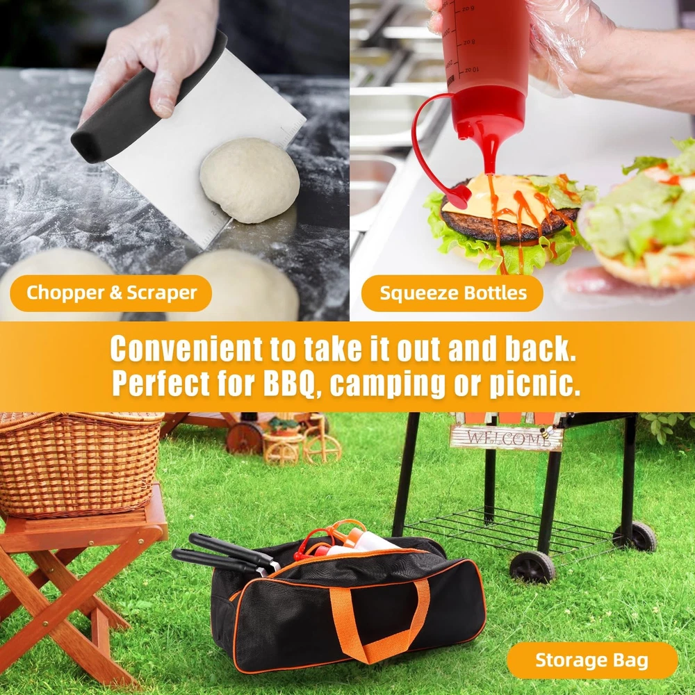This griddle accessory set is a game-changer for outdoor cooking! The high-quality tools make flipping burgers, scraping the grill, and pressing meats effortless. The long spatula provides excellent reach, and the heavy-duty press ensures perfectly seared food every time. I love the included storage bag—it keeps everything organized for camping trips or backyard BBQs. The sauce bottles are a nice bonus for easy basting. Durable, well-designed, and worth every penny for serious grill masters or casual cooks. Makes cleanup a breeze and elevates my BBQ game!