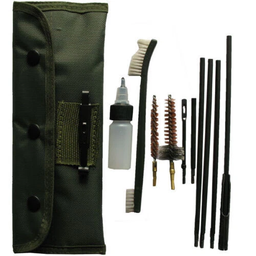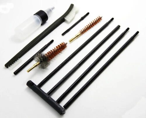 Features This is a 10 piece rifle cleaning kit, for the .22LR, .223, .257, etc. Anything that is .20-.25 caliber can be cleaned with this kit. This kit includes a .22 cal brass brush, a .22 cal chamber brush, a plastic oil bottle, 2 pc patch holder, 4 pc rifle rods, and a double end nylon cleaning brush. You will also receive a nice canvas pouch to keep everything in. This is a very handy kit. Size of canvas pouch: 25cm x 10cm Package includes 1 x 22 cal brass brush 1 x 22 cal chamber brush 1 x plastic oil bottle 2 x patch holder 4 x rifle rods 1 x double end nylon cleaning brush