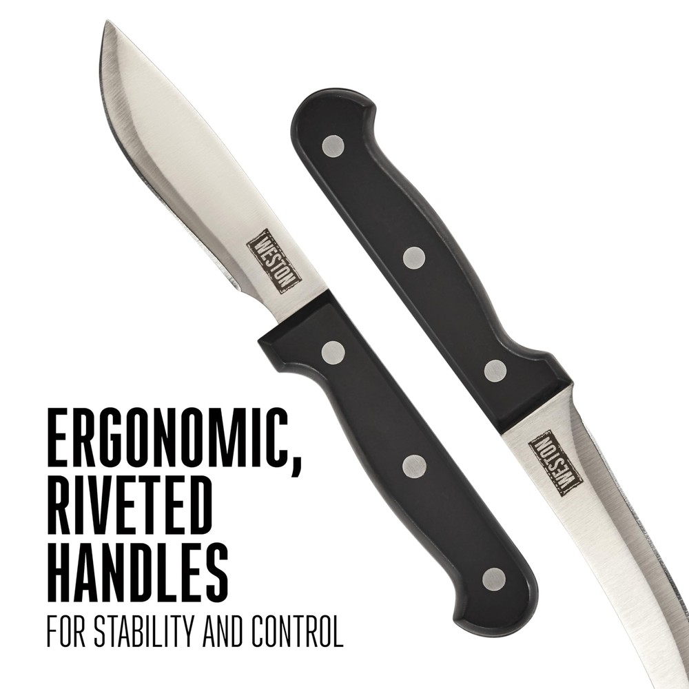 The ® 10 Piece Game Processing Knife Set has everything you need to process game in the field or at home: butcher knife, cleaver, boning/fillet knife, skinning knife, butcher saw with 2 blades, sharpening steel, game shears, and storage case. 83-7001-W, 10 piece processing knife set has durable stainless steel blades and riveted handles. This set includes: 8-inch butcher knife, 6.5-Inch cleaver, 5.75-Inch boning and Fillet knife, 4.25-Inch skinning knife, adjustable 12.25-Inch butcher saw, 2 steel butcher saw blades, game shears with spring open and safety lock, steel for sharpening knives and plastic storage case. Complete 10 piece set. The set comes with everything you need to process game: 8" butcher knife, 6" cleaver, 5.3" boning/fillet knife, 4.2" skinning knife, adjustable 12.25" butcher saw with 2 blades, sharpening steel, game shears, and storage case. Includes 3 knives & cleaver designed for durability. The game processing kit's cleaver and knives are made of rust-resistant, 420 stainless steel with full tang blades for increased balance/leverage. Ergonomic handles for stability & control. The knives and cleaver in the hunting knife set have ergonomic handles for more stability and control when processing fish, poultry, rabbits, deer and other game. The handles are riveted for extra strength. heavy duty game shears. The heavy-duty, spring-open game shears have a bone-breaking notch and a safety lock. They're great for processing small game and poultry. Portable and hard-sided storage case. The durable, hard-sided case with built-in handle holds all the pieces of the outdoor knife set so you can easily carry the set into the field, on your boat, or anywhere you need to process game or fish.