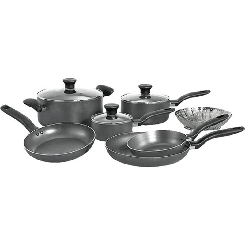 Description Dinner is served! This 10-piece cookware set is a must for any kitchen. The versatile pieces are designed with nonstick interiors and exteriors for easy food release and cleanup. From T-Fal. Includes: Includes 8" saute pan, 9-1/2" saute pan, 11" saute pan, 1-qt covered saucepan, 2-qt covered saucepan, 5-qt covered Dutch oven, and vegetable steamer Nonstick interior and exterior Venting tempered glass lids Even-heating base Stay-cool handles Aluminum construction Dishwasher-safe; oven-safe to 350F Lifetime Limited Manufacturer's Warranty Made in Vietnam