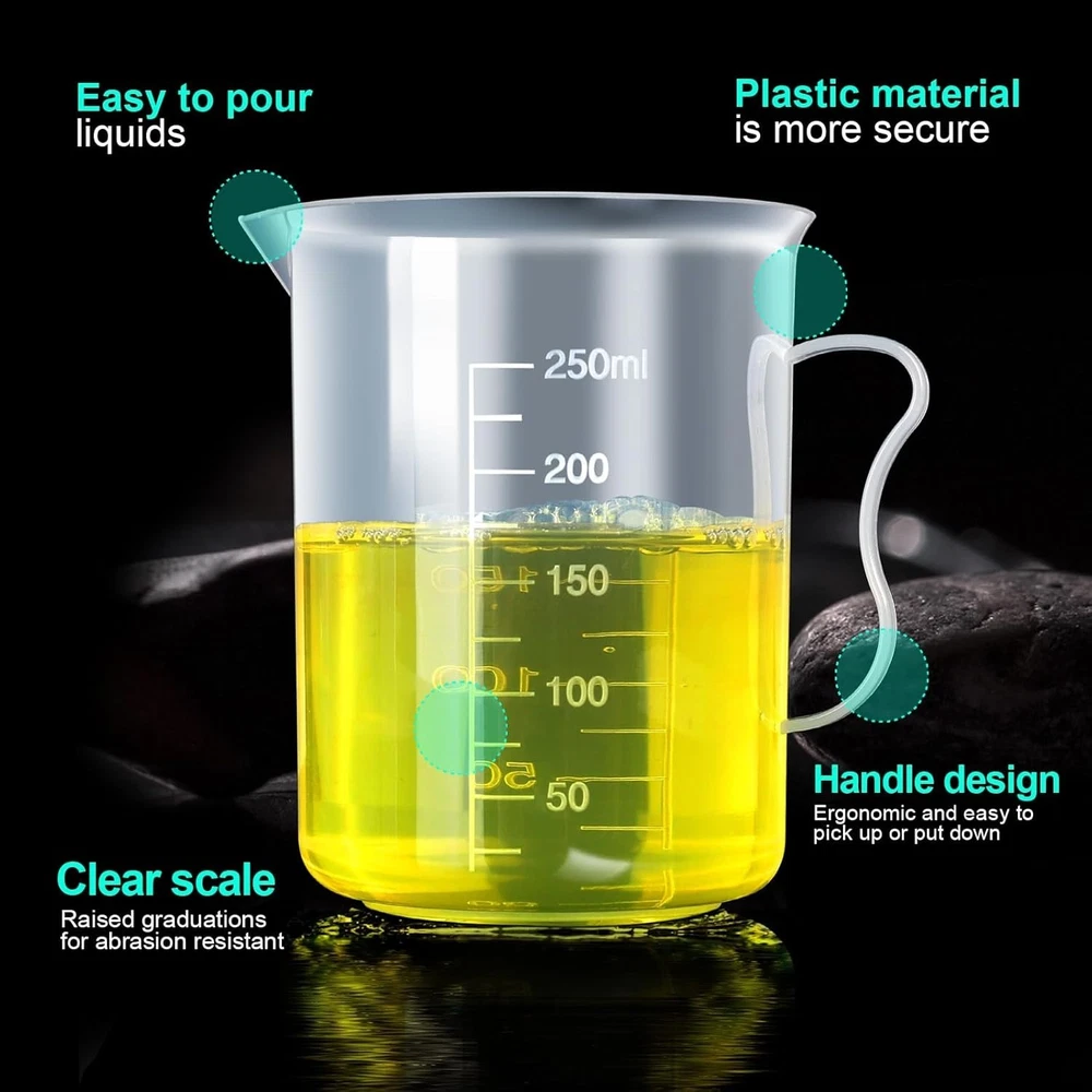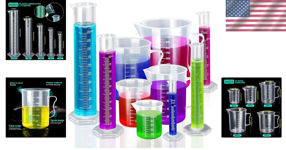 This set is perfect for any lab or classroom! The clear plastic makes it easy to read measurements, and the variety of sizes covers all my needs. The cylinders and beakers feel durable and well-made, great for repeated use. No leaks or cracks after multiple washes, and the graduations stay sharp. Super handy for experiments, mixing, or even crafts. Super affordable for the quality—definitely worth it!
