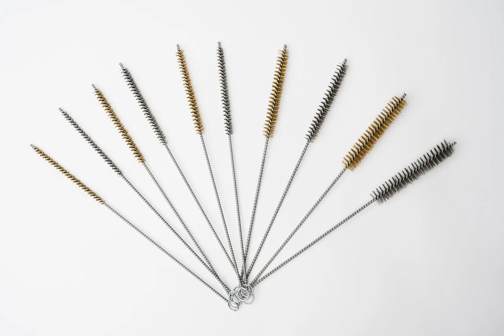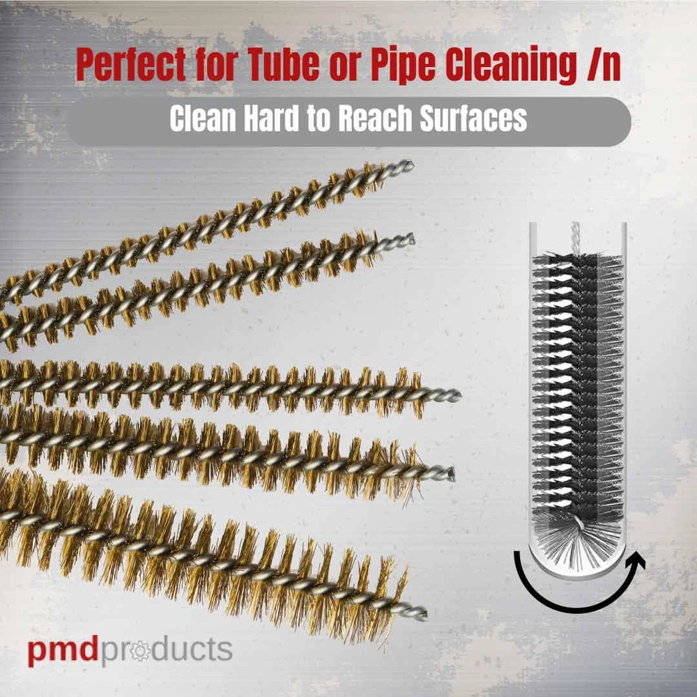 Tube Brush Kit 10 Piece Brass & Stainless Steel Bristle * Brass brushes: 1/4", 5/16", 3/8", 1/2", 3/4" * Stainless steel brushes: 1/4", 5/16", 3/8", 1/2", 3/4" * 4" long brush area * Brushes are 12" overall length * Twisted wire handle with loop Multi Size Cleaning Brush Kit: This 10-piece Tube Cleaning Brush Kit includes 5 steel wire brushes and 5 stainless steel brushes in various sizes, from 1/4" to 3/4". Ideal for engine cleaning, metal rust removal, and detailed cleaning tasks. It's your go-to set for thorough cleaning! Access Hard-to-Reach Areas: These 12" metal brushes with a 4" brush area easily clean 3/8 stainless steel tubing, tight spaces, and narrow areas. Heavy-Duty Build: Designed with twisted wire handles, flexible shaft and a storage loop, these durable metal brushes are designed for tough cleaning tasks, making them perfect for heavy-duty use. Safe and Cautious: This kit includes brushes for rust, steel, and stainless surfaces, making it versatile for various cleaning tasks. Please be careful and keep away from children. Always wear protective glasses while using these tools to ensure safety. Customer Satisfaction Guaranteed: If you have any quality issues with the product, us for a .