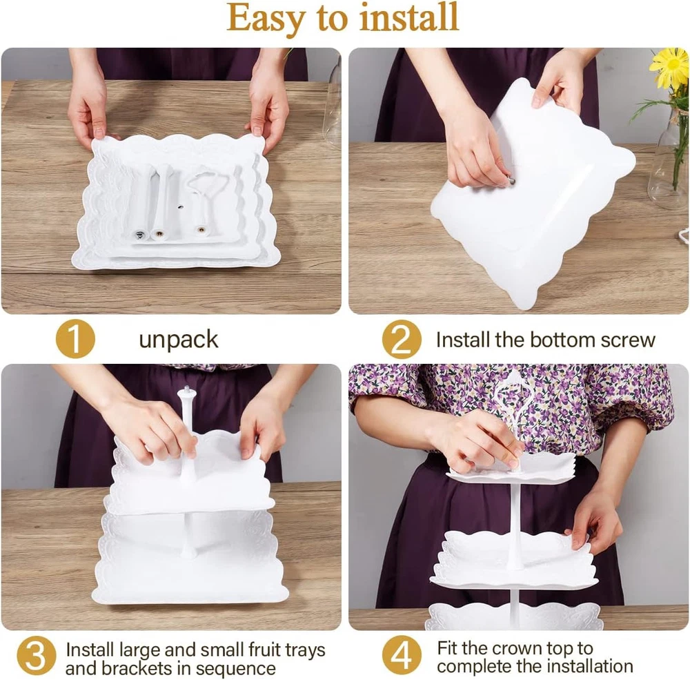 10 Pcs Cake Stand White Plastic Dessert Table Set 4 3 Tired Product Details Brand: mwellewm Color: White Material: Plastic Product Dimensions: 4"L x 3"W x 0.2"H Shape: white Tray Type: Plastic Special Feature: Handle Style: Modern Finish Type: Brushed Recommended Uses For Product: Tea, Coffee, Food Number of Items: 10 Occasion: Wedding, Baby Shower Product Care Instructions: Wipe with Dry Cloth Pattern: Solid Item Weight: 1 Pounds Is Oven Safe: No Maximum Weight Recommendation: 1.8 Pounds Is Dishwasher Safe: No Manufacturer: Mwellewm Item Weight: 1 pounds Country of Origin: China Item model number: C042-pink You Will Get: 4 packs three tiered trays containing 2 squares, 2 rounds, which can hold 12~18 pieces of standard size cupcakes, and 6 packs of rectangle plastic serving tray , which are enough for your food display and storage. Please understand that there may be slight errors due to manual measurement. Please buy with caution. Premium Material: Our dessert table display set is made of extra thick reusable plastic, which is safe, and reusable and there is no unpleasant chemical smell. The quality materials and plenty of storage space, so if you're shopping for a tiered serving set for cupcake, dessert, fruit, please don't miss it. Note: Not dishwasher safe. High-Stability: Our tiered cupcake tower are made of extra thick reusable plastic, extra large tray and extra thick posts provide superior texture and stability. And the parts are carefully selected and inspected for no missing or mismatched components. NOTE: The whole tiered cupcake stand connects the tiers with solid posts and screws, easy to assemble, no tools required. When installing the bottom tray, the nuts should be fixed and pressed tightly, the support rods connected to them can be installed more firmly. Wide Applicability: Our cake dessert stands can be used as a cupcake stand, dessert stand, or fruit stand, and suitable for most events and parties such as tea parties, baby showers, graduations, weddings, Christmas, Thanksgiving, or home decor.