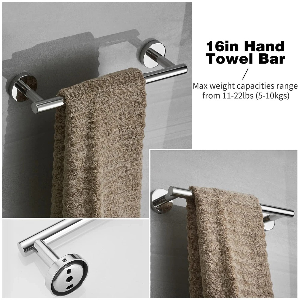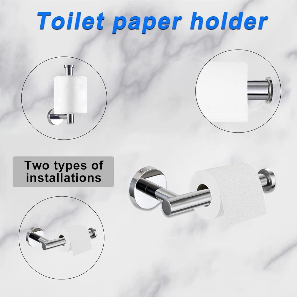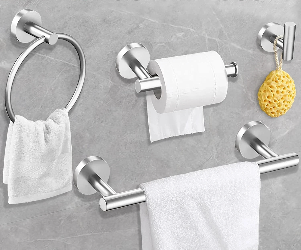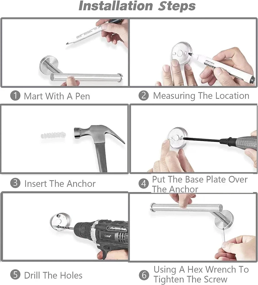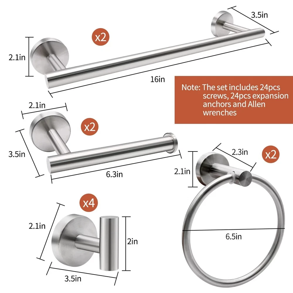 Product description Tower hook Very durable clothes hook, you can be use in Bathroom, wardrobe, vestibule, kitchen, behind the door, office ect. toilet paper holder the toilet paper holders are nice, no problems with color letting off or scratching,friendly to your family. Towel Bar 24 inch bath towel baris a perfect length, can hang your bath towel easily. workd great in your bathroom Towel Ring beautiful appearance, with the plastic protect ring doesn't make squeaky noises. Installation is a breeze. Safe Design High-quality and Solid stainless steel Hidden screws Easy to maintain and keep clean Robust to bathroom elements Effortless to install Comes with everything you need in your bathroom Brushed Nickel Surface Features Wall mounted design for bathroom convenience and organization Brushed nickel finish upgrades any bathroom with its trendy and stylish appearance To clean and maintain the bath hardware, simply clean with a damp cloth,no need for any cleaner Unique round shape and concealed mounting hole add modern design to your bathroom. Installation steps, Requires perforation for installation 【10-PIECES BATHROOM ACCESSORIES KIT】--Most brushed nickel bathroom accessories on Amazon only contains 16-inch towel bar, our combination includes 16 inch towel holder. 2 Sets of 5 Piece towel bar set ,Includes 16" brushed nickel toilet paper holder, towel bar, Towel Ring and Robe Hook. The same price can get more value bathroom towel rack set and has everything you need for your bathroom. 【RUSTPROOF HIGH QUALITY】--The bath accessories have a simple and sturdy design, Brushed nickel surface treatment,Exquisite craftsmanship, invisible screw, seamlessly connected between the columns, for a high-end style.Add more modern elements to your bathroom.water proof brushed nickel bathroom suite metal construction,is built to resist daily scratches and corrosions.ensuring quality and long lifetime.the towel holder smooth edges protect your body from scratches. 【WIDELY USED】-- 16-inch bathroom set towel rods for bathroom can hang more towels and bath towels, hand towel holder fits small towels. Paper towel holder with stainless steel knob at the bar end can easy to hold the roll paper prevents it from falling off.Hand towel ring can keep cleaning and security, hangs hand towels, fingertip towels next to the sink.Bath robe hook used anywhere such as the bathroom, kitchen, living room. 【EASY TO INSTALL】-- The towel rack set come in a safe package with all hardware pack screw accessories and installation instructions manual required for installation in the package. If you still encounter difficulties, you can contact us via email to get the installation video. 【CLICK ADD TO CART NOW】--We believe that the main reason to retain customers is always quality, not just price. so we attach great importance to the quality of each product, after you purchase our bathroom accessory set, welcome to Reviews or email us to let us know your opinion ,we are always ready to provide you with better service.