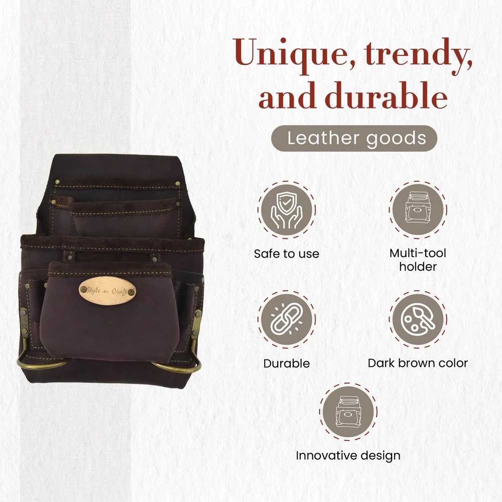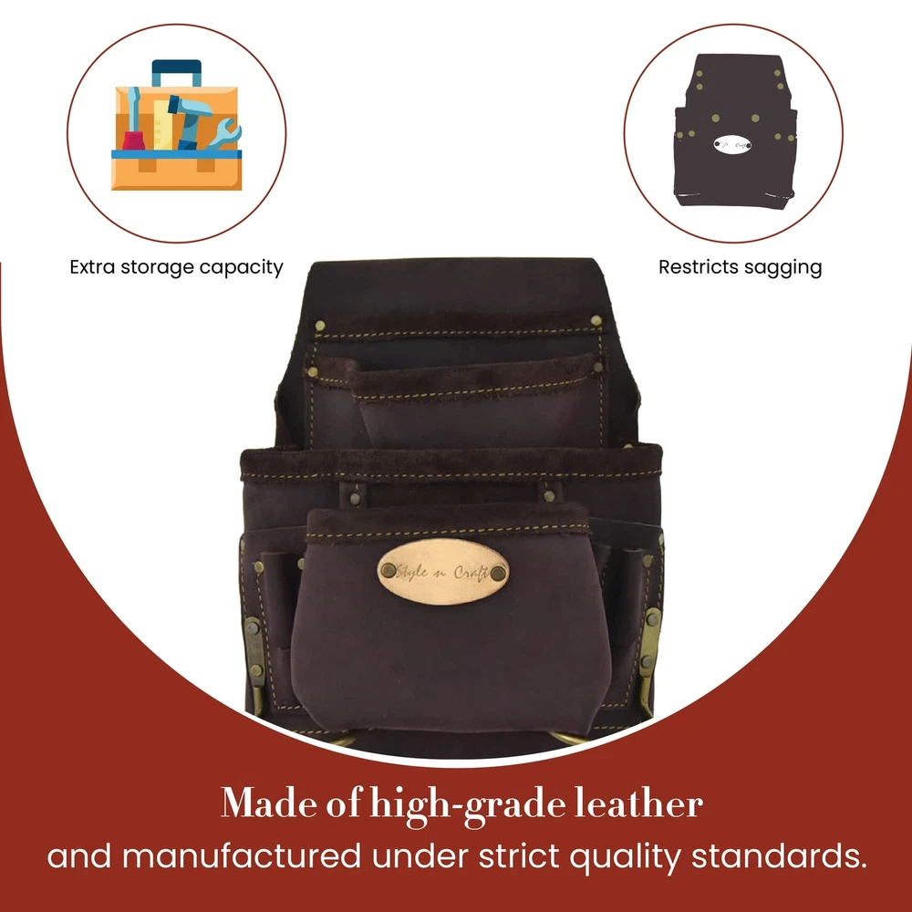 Product Description Stylish and durable, switch to the 10-Pocket Carpenter’s Nail & Tool Pouch now! This tool pouch is made with full-grain oiled leather and features heavy-duty nylon thread contrast stitching that offers extra strength and a stylish appearance. Our carpenter’s tool pouch features reversed main and front pockets for extra storage capacity and will keep your tools, including screwdrivers, chisels, nail sets, pencils, and clamps, among others, protected. The leather pouch is also equipped with 2 metal hammer holders. Reinforced with rivets, our carpenter’s tool pouch is reliable and safe to use. The leather tool pouch comes in brown color, with all its hardware featuring an antique finish. 10-Pocket Carpenter’s Nail & Tool Pouch measures 12" H x 10" W x 2.5" D. Our carpenter’s tool pouch fits belt sizes up to 3” wide and stays intact during your working hours. So forget worrying about your tools falling off or your tool belt sagging while you work. From the Manufacturer 10 pocket nail and tool pouch in heavy duty top grain oiled leather; Contrast stitching with heavy duty nylon thread; Metal hammer holders; Rivets with caps for safety; All hardware in antique finish; Fits belt size up to 2-3/4-Inch wide. Carpenter’s Tool Pouch: Tool pouches can be both stylish and durable. presents a full-grain oiled leather nail and tool pouch for carpenters that features heavy-duty nylon thread contrast stitching for extra strength and a stylish look Spacious: Our Carpenter’s Nail and Tool Pouch features reversed main and front pockets for extra storage and will keep your tools, including screwdrivers, nail sets, and pencils, among others, protected. The leather pouch also has 2 metal hammer holders Leather Pouch: Reinforced with rivet caps and high-quality material, this carpenter’s tool pouch is made with your safety and comfort in mind. Featuring an antique finish on all hardware, the pouch comes in dark brown color Belt Size Fit: Our carpenter’s tool pouch fits belt sizes up to 3” in width and stays in place while you work. With this leather tool pouch, you will not have to worry about your tools falling off or your tool belt sagging Dimensions: 10-Pocket Carpenter’s Nail & Tool Pouch measures 12" H x 10" W x 2.5" D