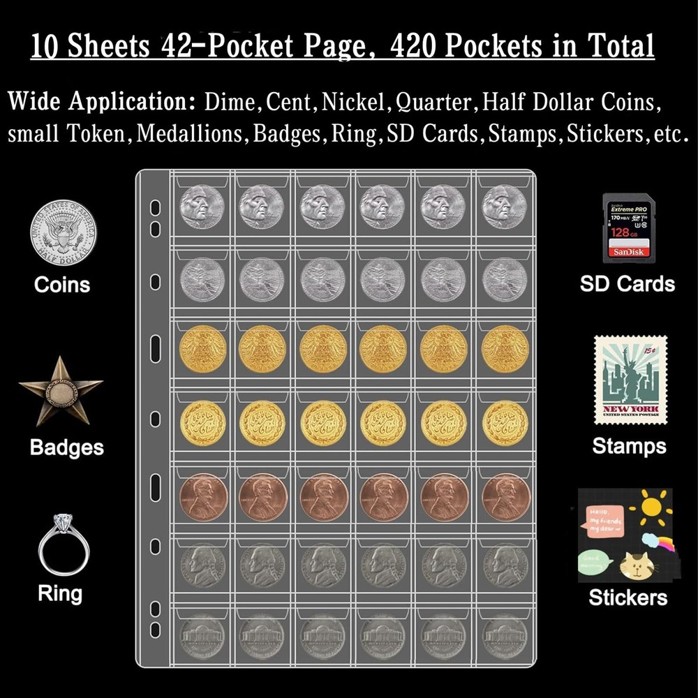 10 Sheets Coin Collection Pages, Coins Pocket Page with 420 Pockets, Coin Binder Inserts Sleeves with Standard 9 Hole for Coin Album. Storage Holder for Currency, Stamp and Other Supplies (42-Pocket) 【10 Sheets 42-Pocket Coin Sleeve】 -- 10 Sheets coin pages, 42 Pockets per sheet. Total 420 pockets plastic coin holder binder pages for pennies, quarters, Silver Eagle, silver gold dollars, half dollars, silver bullion, challenge coins, dogecoin coin and more coins supplies, stamp collecting supplies. Coin Pocket Size: 1.14 x 1.14 inches 【Envelope Pocket Design】-- Each coin pocket has a flap to prevent coin from falling out and sliding around. Separate pocket design to prevent coins from colliding and scratching against each other, Easy to insert coins supplies, keep them held in place. 【Thickened Pages with High Transparency on Both Sides】-- ①.28c thick collecting pages, much thicker than most coin sleeves on the market. ②. These currency binder album sleeves pages with high transparency on both sides, can clearly show your coin & money bill & stamp supplies both sides, facilitate to view and exchange. A wonderful way to and display your collection. 【Premium Material】-- Made of acid free PVC, without softener, no harm to coin, dust-proof & dust-proof, sturdy and durable for displaying coins and keeping them clean as well. 【9-Hole Coin Pages Fit for Most Binders】-- Each coin binder insert page has 9 holes, suitable for most sizes of coin collecting book album binder. Coin Page size: 27.8 x 20.2cm/10.9 x 7.8 inch
