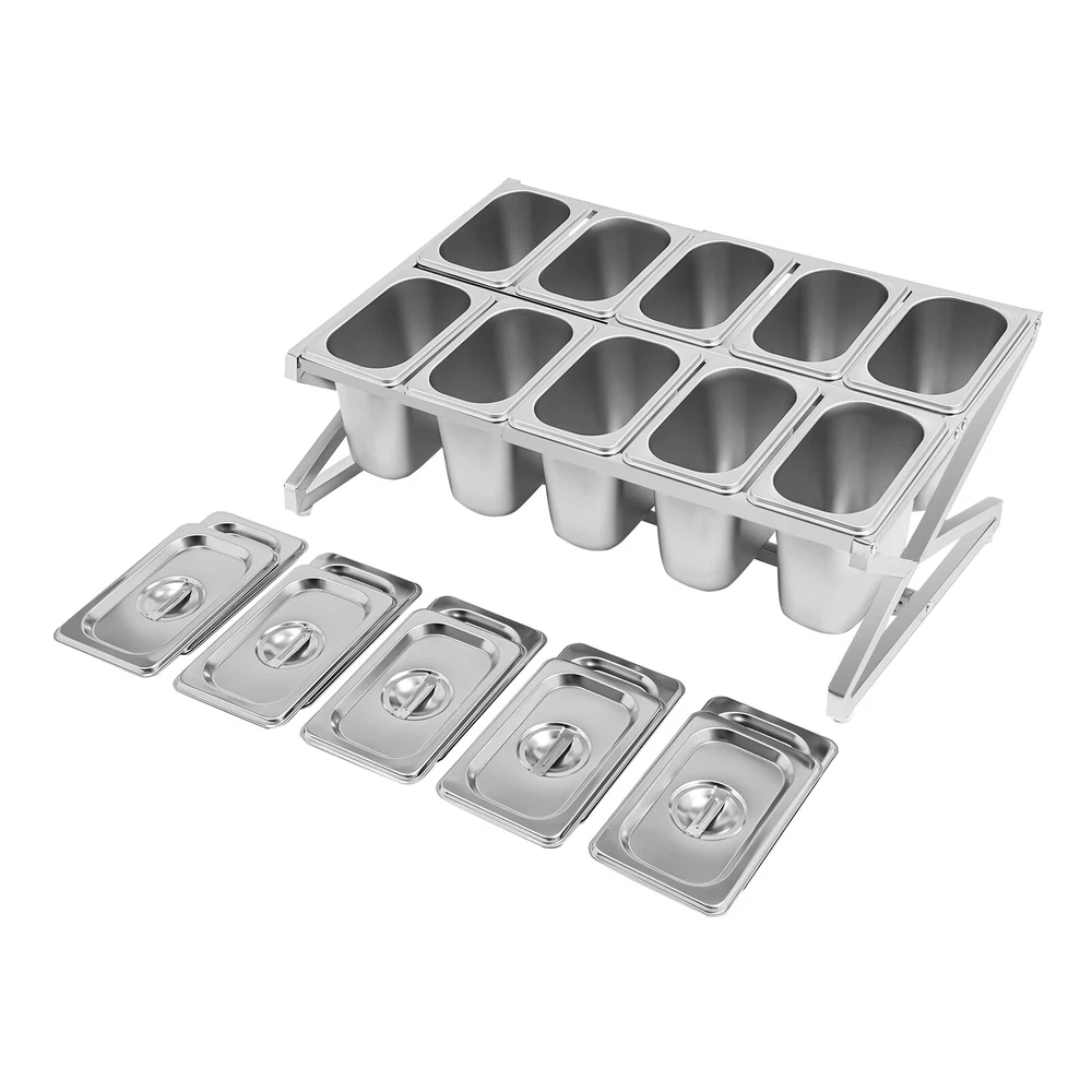 Specification Material: 201 Stainless Steel Process: Electrolytic Color: Silver Mount Type: Countertop Assembly Required: Yes Dishwasher Safe: Yes Shape: Rectangle, Triangle Pan Type: 1/9 Number of Pans: 10 Total Load Capacity: 100kg/220.46lbs Each Pan Size: 11*17.5*15cm/4.33*6.88*5.9in Each Lid Size: 11*17.5cm/4.33*6.88in Adjustable Product Length: 35.5-65cm/14-25.6in Product Size(W*H): 36*23cm/14.2*9in Package Size: 40*30*20cm/15.74*11.81*7.87in Gross Weight: 4.5kg/9.92lbs Net Weight: 4.27kg/9.41lbs Package Included 1* Spice Rack 10* Pans 10* Lids 1* Chinese&English Installation Diagram Other Accessories for Assembly 10-grid Spice Rack Inclined Expandable Spice Rack Countertop Condiment Holder Application It is suitable for restaurants, buffets, cafes, food trucks, milk tea shops, home kitchens, etc. It can be used to hold spices, condiments, snacks, sauces, small side dishes, vegetables, fruits, etc. Specification Material: 201 Stainless Steel Process: Electrolytic Color: Silver Mount Type: Countertop Assembly Required: Yes Dishwasher Safe: Yes Shape: Rectangle, Triangle Pan Type: 1/9 Number of Pans: 10 Total Load Capacity: 100kg/220.46lbs Each Pan Size: 11*17.5*15cm/4.33*6.88*5.9in Each Lid Size: 11*17.5cm/4.33*6.88in Adjustable Product Length: 35.5-65cm/14-25.6in Product Size(W*H): 36*23cm/14.2*9in Package Size: 40*30*20cm/15.74*11.81*7.87in Gross Weight: 4.5kg/9.92lbs Net Weight: 4.27kg/9.41lbs Package Included 1* Spice Rack 10* Pans 10* Lids 1* Chinese&English Installation Diagram Other Accessories for Assembly Description Are you still troubled with not having a satisfactory assistant in the kitchen or restaurants? Let's take a look at this spice rack! Whether in a home kitchen or a commercial food service area, this product offers a reliable solution for efficient food storage and display, combining functionality, durability, and convenience. It will save you a lot of trouble and be your good partner. Don't wait, bring it home! Key Features Build to Last: Made of premium 201 stainless steel with an electrolytic process, this product is wear-resistant, corrosion-resistant, and rustproof, ensuring its durability and reliability for long-term use. Large Capacity: Each pan's size is 4.33*6.88*5.9 inches and there are a total of 10 pans, providing ample space to hold a substantial amount of spice and making it a highly practical choice for both commercial and domestic food storage and display purposes. Expandable Length: With an adjustable length that ranges from 14 inches to 25.6 inches, this product offers great flexibility and allows you to customize the size according to different spatial requirements and usage scenarios, enhancing its adaptability and practicality in various environments. Stable Structure: The triangular and inclined design, combined with a well-engineered support system, distributes the weight evenly across the base, preventing it from tipping over even when fully loaded with a weight of 220.46 lbs and ensuring exceptional stability. The inclined design provides a clearer sight and allows you to access items easily. Dustproof and Independent Placement: The high-class lids and independent food pan design allow you to place different spices separately, effectively preventing dust and debris from contaminating the food, avoiding cross-contamination, and preserving the original flavor of the spices. Easy to Clean: The product has a smooth and flat surface, and a simple structure and detachable pans, making it easy to clean, and it can be cleaned with a dishwasher machine, which is time-saving and effort-saving. Effortless Installation: Its simple structure and complete accessories ensure a smooth installation process, which is convenient and user-friendly. Buy with Confidence: We stand behind all our guests and look forward to assisting you with your purchase. It is our pleasure to answer your confusion and questions. Details Practical Lid: The lid with a handle can prevent dust and insects from entering, keep the food fresh, and make it easy for you to close and open the lid. Foot Pads: They enhance the stability of the product, preventing it from wobbling or sliding on various surfaces, even when fully loaded. Stackable Pan: It enables convenient storage when the pans are not in use, saving a significant amount of space in your kitchen or storage area. Smooth Edge: It prevents accidental cuts and scratches during handling, ensuring safety and a comfortable user experience. Notes Please check the product size carefully before purchasing. Please note that this product does not include other items shown in the picture. Please allow the slight color difference caused by the shooting light and the 1-3 cm error due to manual measurement, and make sure you do not mind before ordering. Payment Delivery details Terms of sales About us Contact us Payment We accept ebay payment 。 Fees such as import duties, taxes are not included in the item price or shipping costs. These charges are the buyer's responsibility. Delivery details Shipping: 2-9 working days to: USA Terms of sales We maintain high standards of excellence and strive for hundred percent customer satisfaction. Feedback is very important to us. We hope that you contact us immediately before you give neutral or negative feedback, so that we can address your concerns. It is impossible to address issues if we do not know about them! About us Your satis faction is our ultimate goal. We work hard to earn your trust and future business. Our certified technicians have tested each item before shipping. The unit comes with 1 year limited warranty on all manufacturing defects. a) If you receive a defective item, you may return it or ask for a discount. Please contact us within 14 days after you receive the package. b) What you returned must be intact and in its original packaging as re? u. Customer is responsible for shipping costs of the returned item. c) We will cover the cost of shipping back t with the shipping rate in
