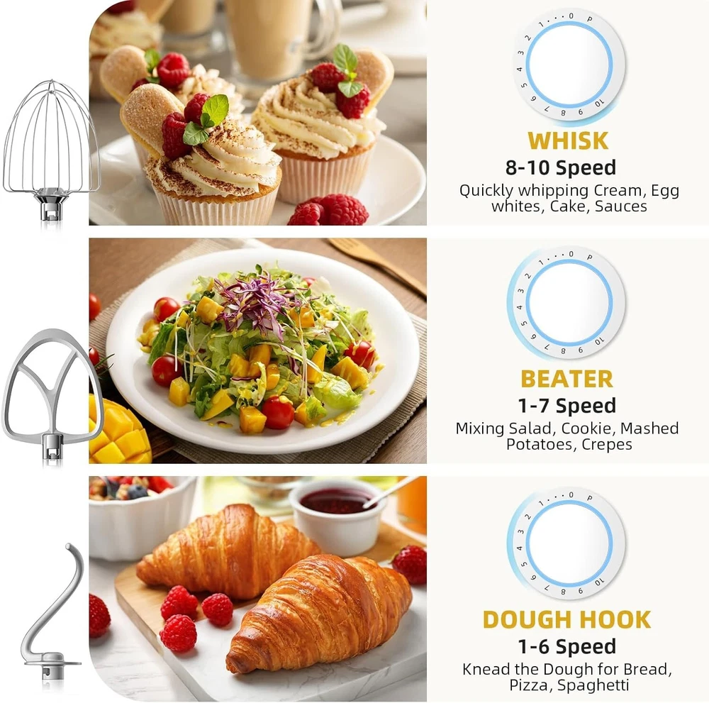 Ultra-Low Noise Design: with 380W high-performance motor, Peicual household stand mixer effortlessly and consistently to whip, beat, knead and mix ingredients thoroughly with low noise ≤75 dB (at Speed 10). This electric mixer minimizes the work noise, avoids disturbing your sleeping family members, and provides a comfortable and efficient baking environment Greater Control Over 10+P Speeds: Peicual electric stand mixer provides you with a superior mixing performance experience. 10 different speed options, make the blending action thorough and fast, easy to the various recipe such as cakes, bread, cookies, salads, muffins, etc. Use the PULSE function to provide precision control when required a quick burst of power or for quickly incorporations One-button Release Tilt-head: Compact design with tilt-head allows the attachments (dough hook, wire whip, flat beater) nicely reach the bottom of the bowl for mixing thoroughly. Adjustable arm lift button solid connecting design with safety switch for keeping the baking mixer stable Anti-slip Feet & Over-heating Protection Features: The specially designed silicone suction cups for more stability while mixing. Release your arm with this effective dough mixer while mixing dense, heavy bread doughs. Equipped with overheating detection function, when you lift the top half of the kitchen stand mixer, which will stop working to ensure your safety during the kneading process Multi-purpose & Easy Clean Accessories: The stainless steel bowl is 6-quart large enough to make various food, from pasta to your favorite cookie, egg whites to pans of birthday cake batter. All accessories are easily detachable and dishwasher-safe. Peicual kitchen mixer with stand provides 24H/7D customer online support