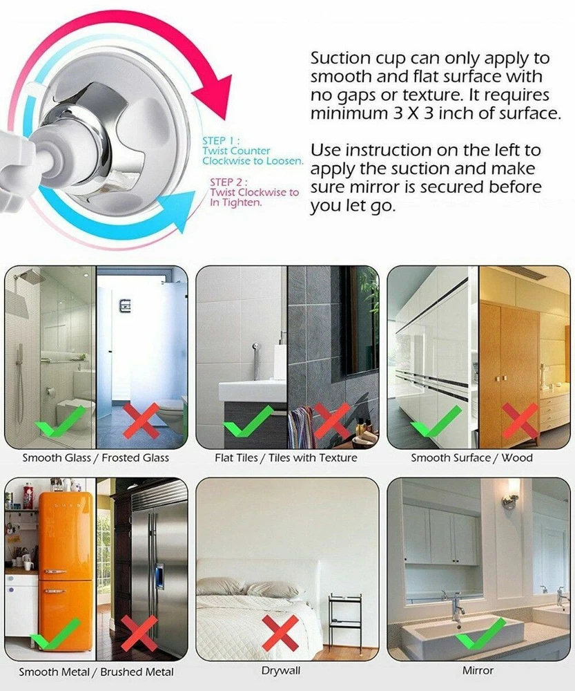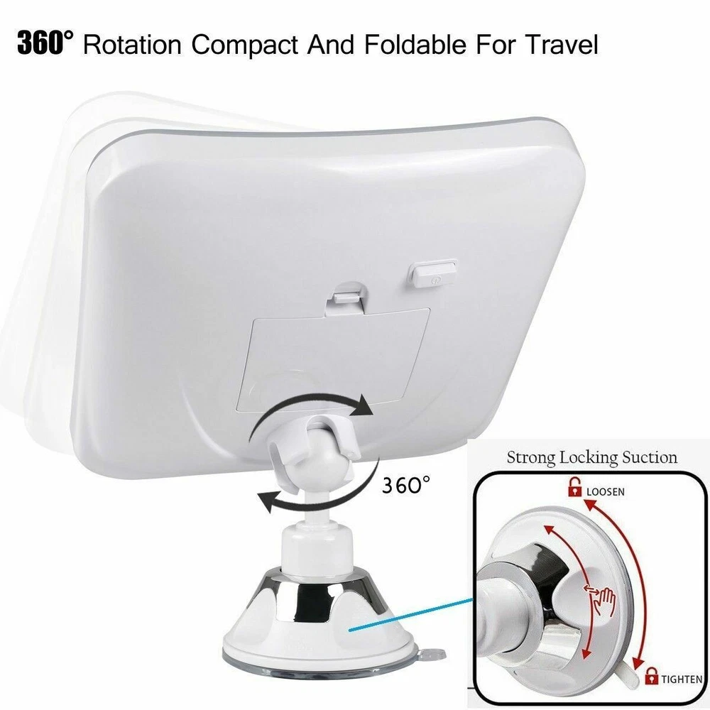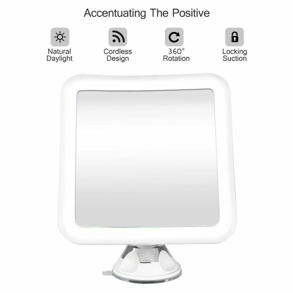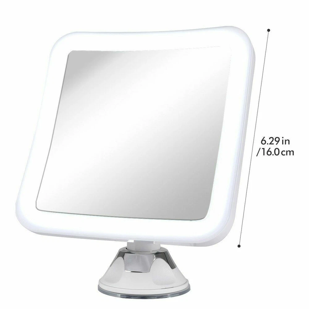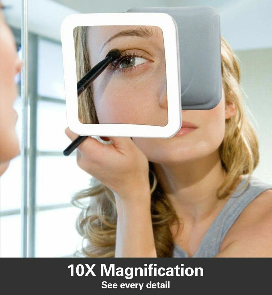 10X MAGNIFYING LIGHTED MAKEUP MIRROR Daylight LED Vanity Bathroom Travel Compact 10X MAGNIFYING LIGHTED MAKEUP MIRROR Daylight LED Vanity Bathroom Travel Compact Product Description Product Overview Accentuate the Positive Our lighted makeup mirror comes with a 5.2" wide clear glass screen. The 10X magnification allows you to really zoom in on even the smallest details on your face so you can highlight your best features. It's perfect for applying make up such as eyeliner, mascara, eyebrows, as well as tweezing unwanted hairs. Illuminate While You Magnify 30% brighter and 60% less energy than incandescent bulbs. Our mirror is equipped with energy-efficient Daylight LEDs that will brighten your face, and provide you with natural daylight for the most natural look - so you can look your best. Innovative Locking Design Our proprietary Easy-Lock suction mechanism allows you to securely attach this mirror on another mirror or other flat surfaces in the bathroom. It takes no more than 5 seconds to install this mirror. Simply attach, twist, and lock the mirror in place. Ultimate Portability You can easily detach the suction cup with a simple twist (to unlock). Bring it with you on your next trip. It's perfect for traveling, taking up less than 1/2 sq ft. in your luggage. Highlights: - Natural Daylight LEDs - 16 LED Lights - 10X Magnification - Easy-Lock Suction Mechanism - 360° Adjustable Swivel - 5.2" Clear Glass Mirror - Soft Velvet Travel Storage Pouch - Square Design - Wireless (No Power Cords needed) - Requires 3 AA Batteries (Not Included) MUST READ - This mirror requires a clean, flat and smooth surface of at least 3.5" X 3.5" otherwise the suction may not work. - Our mirror will adhere to surfaces such as ceramic, marble, acrylic, porcelain, enamel, and other mirrors. - Our mirror WILL NOT stick to surfaces such as drywall, wallpapers, stucco, or any textured walls. Details: Product Dimensions: 6.3 x 6.3 x 0.8 inches Item Weight: 10.1 ounces Shipping Weight: 14.4 ounces Item model number: FC-LMMM10XS Features: DAYLIGHT LED LIGHT Natural daylight LED provides the most accurate natural light that you encounter throughout a day. Suitable for all ages POWERFUL 10X MAGNIFICATION Allows you to focus in on a specific section of your face - ideal for makeup applications and precise tweezing ADVANCED LOCKING SUCTION 360 rotation, fully adjustable to any desired angle or position. Airtight-seal suction cup provides a secure attachment CORDLESS AND PORTABLE Compact, battery operated, square design glass mirror; when folded, takes up fewer than 1/2 square foot of space. Comes with travel pouch! SATISFACTION GUARANTEED 100% No-Hassle Money Back Guarantee. If you're not happy with your purchase, we will give you a full refund. Click to edit text Listing and template services provided by inkFrog Track Page Views With Auctiva's FREE Counter