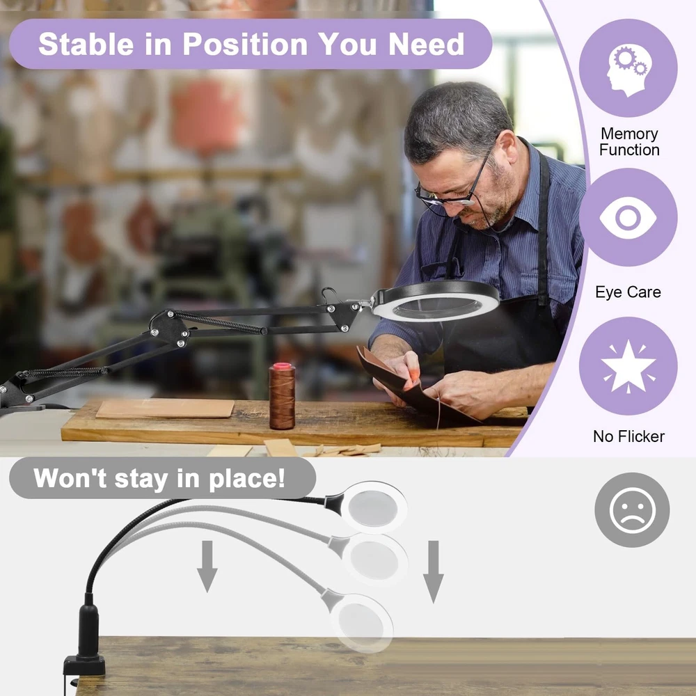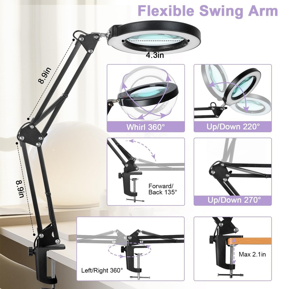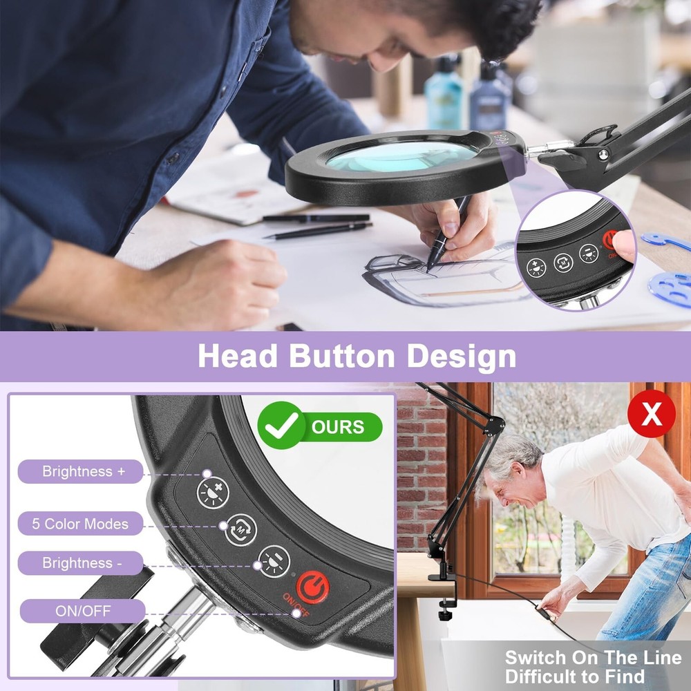 10X Magnifying Glass with Light and Clamp, Real Glass Lens Lighted Magnifier with Stand, 5 Color Modes LED Dimmable Magnifying Desk Lamp Hands Free for Crafts Jewelry Painting Sewing Close Work Product Details Color: Black Size: 10X Brand: Seylae MPN: SE-01 UPC: Does not apply EAN: Does not apply Finish Type: Painted Product Dimensions: 10.35"D x 11.02"W x 2.2"H Lamp Type: Desk Lamp Shade Color: Black Shade Material: Metal Finish Type: Painted Product Dimensions: 10.35"D x 11.02"W x 2.2"H Lamp Type: Desk Lamp Shade Color: Black Shade Material: Metal Switch Type: Push Button Style: Modern Brand: Seylae Color: Black Special Feature: Hands Free, Adjustable Color Temperature, Memory Function, Dimmable, Adjustable Arm Light Source Type: LED Material: Aluminum, Glass, Metal Recommended Uses For Product: Reading Power Source: Corded Electric Controller Type: Push Button Connectivity Technology: USB Included Components: 1 * Adapter, 1 * USB Magnifying Lamp with Swivel Arm, 1 * Clamp, 1 * User manual, 1 * Cleaning Cloth Age Range (Description): Kids, Adults, Seniors Mounting Type: Desktop Number of Items: 1 Lighting Method: Adjustable Control Method: App Indoor/Outdoor Usage: Indoor Specific Uses For Product: Drawing, Painting, Modelling, Sculpting, Drafting, Crafting, Colouring, Jewelry making, Sewing, Knitting, Beading, Fly tying, Articulating, etc. Water Resistance Level: Not Water Resistant Installation Type: Tabletop Brightness: 1200 Lumen Size: 10X Manufacturer: Seylae Part Number: SE-01 Item Weight: 2.18 pounds Country of Origin: China Item model number: SE-01 Finish: Painted Pattern: Solid Special Features: Hands Free, Adjustable Color Temperature, Memory Function, Dimmable, Adjustable Arm Batteries Included?: No Batteries Required?: No Warranty Description: 2 years. Date First Available: July 24, 2024 10X Magnification Real Glass Lens Equipped with a real glass lens, this magnifier light provides distortion-free 10X magnification. The clear optics reduce eye strain and dizziness, allowing you to work for extended periods comfortably. Perfect for mini tasks, puzzles, needlework, cross stitch, miniatures, diamond art, and other close work. 5 Color Modes & 10 Brightness Levels Featuring 5 adjustable color temperatures and 10 brightness levels, this magnifying lamp lets you customize the lighting for your task. Whether youre working on intricate embroidery or reading fine print, you can choose the most suitable light setting. The memory function ensures your last-used settings are retained for added convenience. Convenient Head Button Design The light adjustment button is located on the lamp head for easy access. This design eliminates the need to pause your work and search for a switch, making it particularly useful during tasks where uninterrupted focus is key. Handy for sewing, knitting, crocheting, quilting, beading, fly tying, articulating, painting, coloring, drafting, grading cards, and more. Flexible Arm & Sturdy Clip The adjustable swivel arm allows precise positioning of the lens, staying securely in place once adjusted. The sturdy metal clip with a 2.1-inch opening fits securely on most tables with flat edges, providing stability and freeing up workspace, which is especially beneficial for jewelry-making, modeling, or repair work. Bright LED Illumination With 72 LED beads delivering up to 1200 lumens, the magnifying light ensures excellent visibility even in low-light environments. This feature makes it a reliable tool for artists, painters, and hobbyists who require a well-lit workspace for tasks like drawing, sculpting, or assembling intricate components.