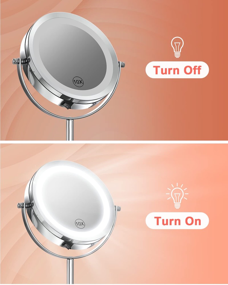 【1X/10X Magnification】This magnifying mirror is double-sided with 1x/10x magnification, which is the best beauty tool for women who care about their look. The magnifying side can focus on your detailed facial features even your tiniest pore, help you to achieve flawless makeup: plucking eyebrow or applying mascara, beard shave, acne blackhead removal and etc 【LED LIGHTED MAKEUP MIRROR】Our lighted vanity mirror is built-in 18 pieces, this mirror with lights could bring you sufficient lighting under any dark condition. It also provides natural and soft light that is perfect for putting on makeup 【360° FREE ROTATION】360 degree free rotation can help you adjust to the best angle for viewing. Applicable to bedroom, bathroom, hotel and etc 【ELEGANT & COMPACT DESIGN】Our make up mirrors lighted magnifying has an anti-slip base and sturdy frame, it only takes a little place to place on. With compact design, this makeup mirror is light-weighted and easy for you to carry or remove. And it definitely a good companion for travel with you 【BEAUTIFUL GIFT & 100% SATISFACTION GUARANTEE】This elegantly designed mirror will be a perfect gift for Christmas, Thanksgiving, Birthdays, Anniversaries, Mother's Day and Valentine's Day. Our support team is always available to assist you with any issues you may have with your cosmetic mirror. Please feel free to reach out to us at any time for assistance