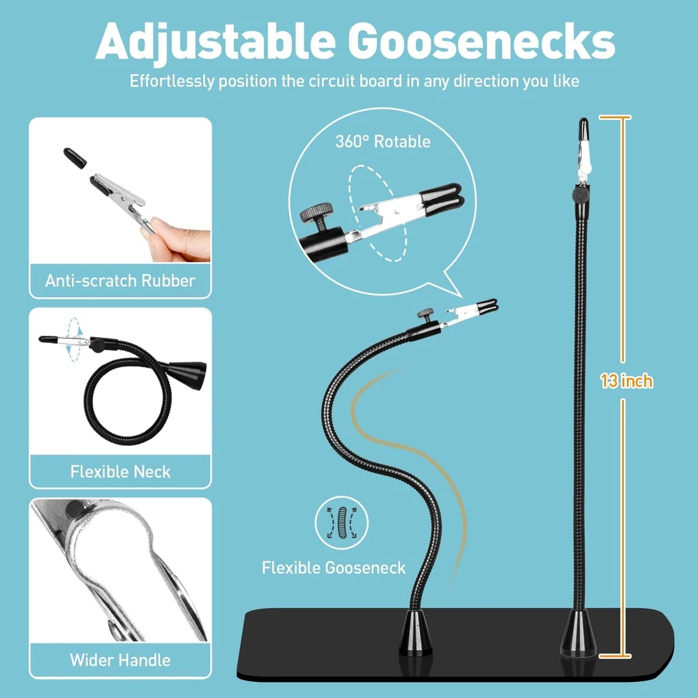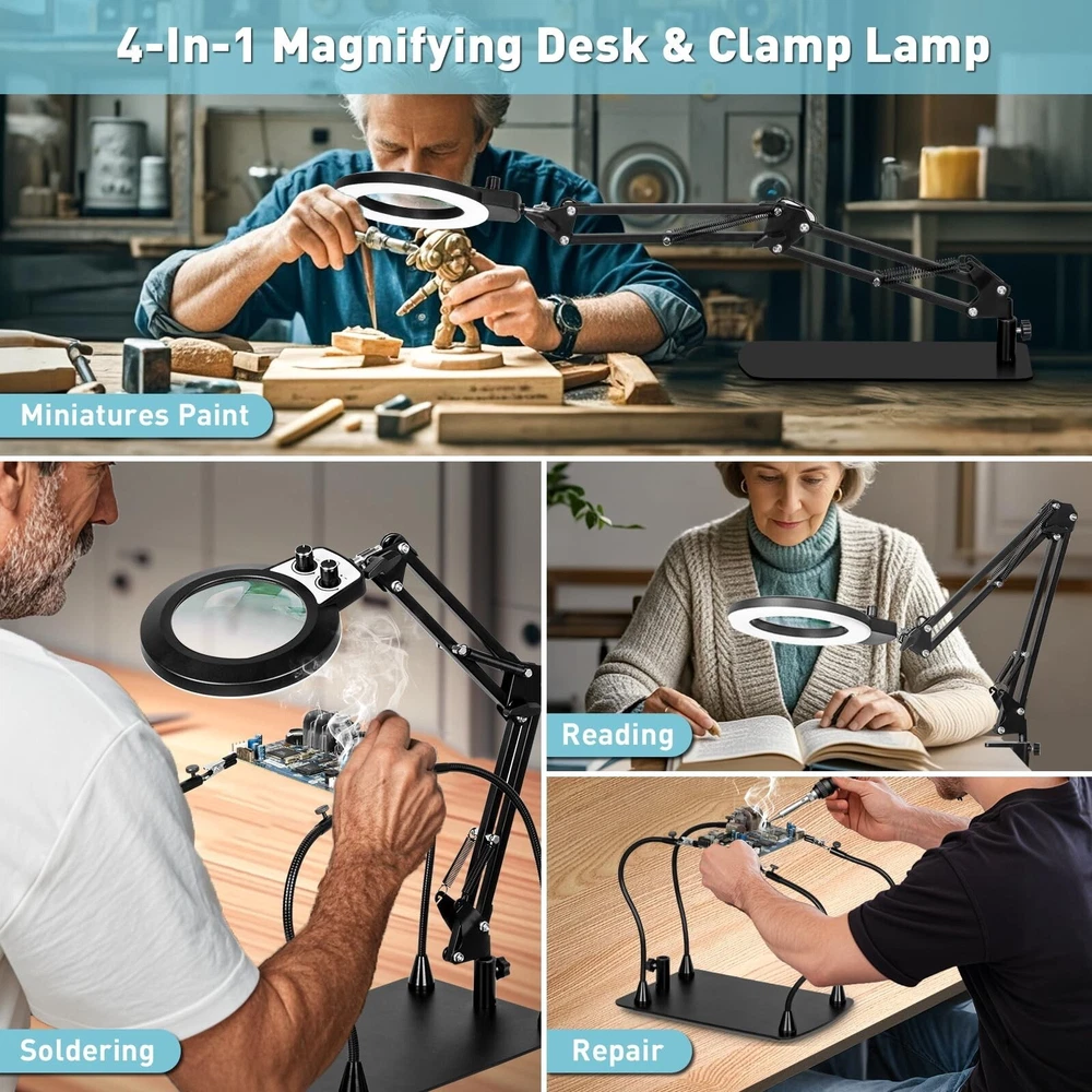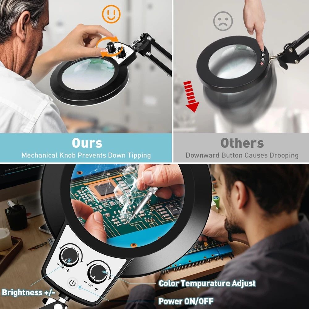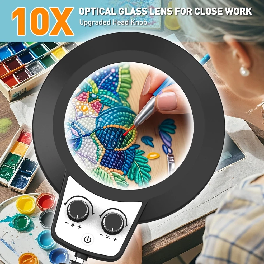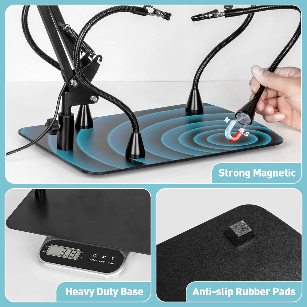 10X Soldering Magnifying Glass with Light, Any Color Modes Stepless Dimming Magnifying Lamp, 4-in-1 Flexible Helping Hands, Large Non-Slip Base Magnifier for Jewelry Repair Hobby Product Details Size: 13 Inch Gooseneck Tubes Brand: KUVRS MPN: 10X-4ZTP-YS (Black) UPC: Does not apply EAN: Does not apply Brand: KUVRS Color: Black Batteries Required?: No Item Weight: 3 Pounds Lens Material: Glass Brand: KUVRS Color: Black Batteries Required?: No Item Weight: 3 Pounds Lens Material: Glass Product Dimensions: 12"L x 8"W Magnification Strength: 10 Diopters Manufacturer: KUVRS Lens Width: 4.3 Inches Part Number: 10X-4ZTP-YS (Black) Item Weight: 3 pounds Country of Origin: China Item model number: 10X-4ZTP-YS (Black) Size: 13 Inch Gooseneck Tubes Style: Modern Finish: Polished Material: Aluminum, Glass, Metal, ABS lamp shell Voltage: 110 Volts (AC) Wattage: 24 watts Installation Method: Tabletop Type of Bulb: LED Luminous Flux: 2000 Lumen Mounting Type: Desktop Switch Style: Rotary Special Features: Energy Efficient, Adjustable Color Temperature, Memory Function, Dimmable, Adjustable Arm Usage: Reading, Craft, Jewelry, Soldering, Reading, Wilding, Artist, Sewing, Repair, Miniature painting , Esthetician, Aesthetician, Cross Stitch, Nail, Workbench, Hobby, Craft, Drafting, Crochet, Needlepoint Included Components: Dimmer, Adapter Batteries Included?: No Warranty Description: 1 year. Date First Available: August 22, 2024 Newest Rotary DimmerOur hobby magnifying glass with light has been upgraded to a dual knob adjustment function, a left knob for brightness, and a right knob for color temperature. This design can make the magnifying glass lamp even force to keep stable. Secondly, adjusting both knobs simultaneously also creates any combination of brightness and color temperature to suit various observation needs and environments 10X HD MagnificationOur integrated 10X magnifying glass with light and stand adapts 10 diopter optical lenses whose transparency and clarity all are higher than ordinary PMMA lenses. And its magnify function help you create detailed designs without straining your eyes. The magnifying lamp with light can move 360 fully instead of just up and down Magnetic Gooseneck Arms & Alligator ClipThe helping hands magnifier with light owns four magnetic goose neck arms that have powerful attraction to the metal and can bend in any direction. The alligator clips with non-slip rubber sleeve can better protect the circuit boards from scratches while holding your precision electronic parts securely Eye-Caring & Memory FunctionThe soldering magnifying light adapts a hidden light guide PC design, after filtering layer by layer, the emitted light is more uniform and soft, with no flicker, no glare, which can effectively relieve eye fatigue while in use. When you use the craft light again, it will keep the last mode you have set After-Sales ServiceKUVRS is a brand of auxiliary tools you trust. In order to provide you with satisfy product experience, we pay great attention to the quality inspection of the soldering helping hands. If you have any concerns, our customer support team is here to assist you