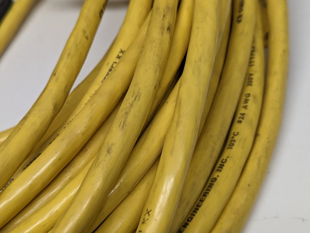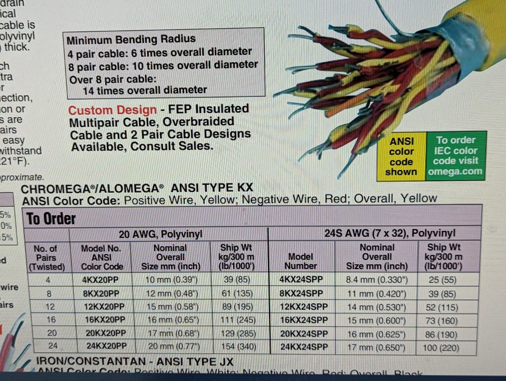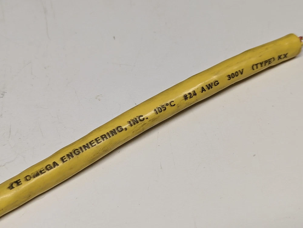 Plourde's Toolbox Bargains Used 10ft of Omega Multipair 24 Stranded AWG Thermocouple Wire, Type KX, 12 Pairs (Twisted) Manufacturer: Omega Engineering Item: Type K Thermocouple Wire 12 Pairs Wire (Twisted): 24 AWG Stranded 7 x 32 Polyvinyl Jacket Outside Diameter .490" Common extension wire types are made up into standard multipair cables. Each conductor is covered with a polyvinyl jacket, nominal 0.38 mm (0.015") thick, and the pairs are individually twisted. Clear polyester film/plastic sheet tape is then wrapped around the bundle of twisted pairs. A stranded tinned-copper drain wire is laid over the bundle, which is covered with aluminum-backed polyester film/plastic sheet tape to serve as an electro-static shield. The drain wire provides a simple mechanical termination for the shield. The cable is then covered with a jacket of polyvinyl approximately 1.1 mm (0.045") thick. As an added convenience, each standard cable contains an extra polyvinyl-clad stranded-copper wire for use as a ground connection, or to complete a communication or signal circuit. Standard cables are color-coded. The individual pairs are marked 1-1, 2-2, etc., for easy identification. Insulation will withstand temperatures up to 105°C (221°F) ** Each quantity is for 10 Feet of Wire, Shipped in a continuous length See pictures above for more details. Please feel free to contact us with questions. Shipping We combine shipments whenever possible to lower customer costs. International buyers are responsible for paying all import duty, tax, and fees which may be collected by their country when the parcel arrives. We declare the exact purchase price as the value of the goods when completing the customs declaration. Disclaimer Biotech Bargains LLC makes no representation of any item(s) sold to be fit for a particular purpose and assumes no liability for its use or misuse. It is assumed that the unit(s) will be installed and operated by qualified personnel. The purchaser agrees that the seller shall not be held responsible or liable for any injuries or damages, whether incidental or consequential, associated in any way with the item(s). The Purchaser, by bidding on this item, indicates their acknowledgment of and agreement to the terms of this disclaimer.