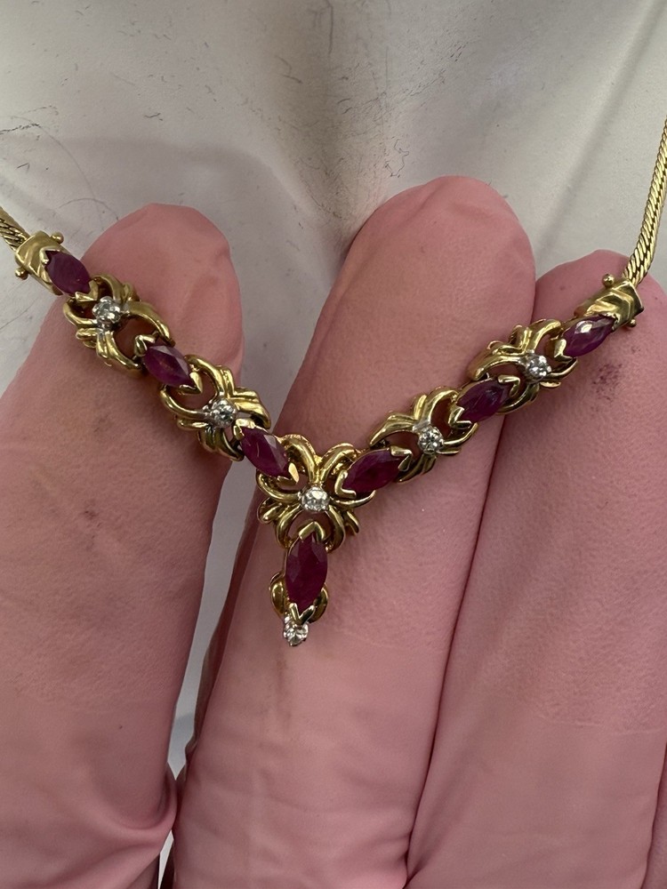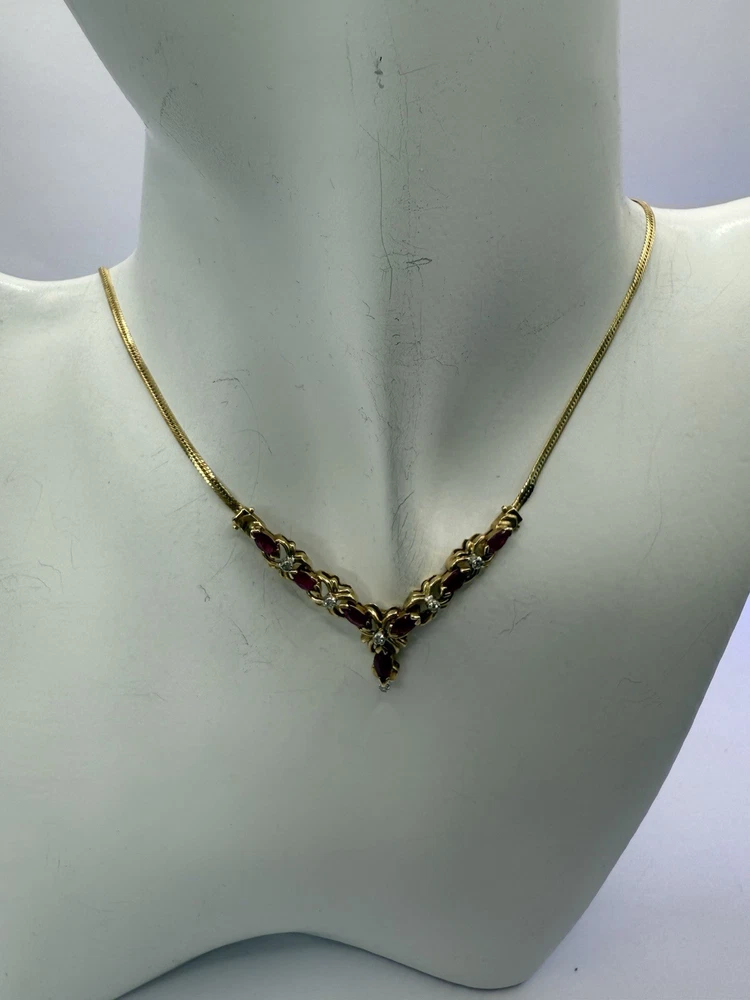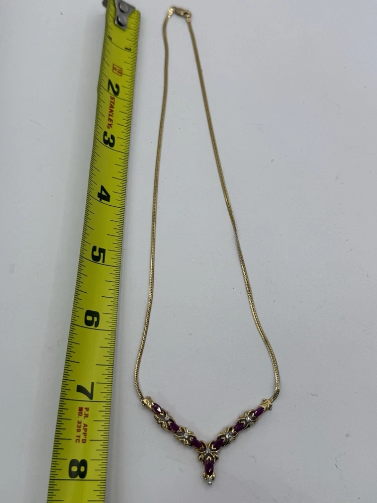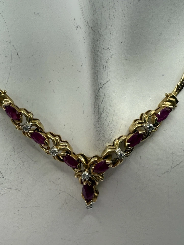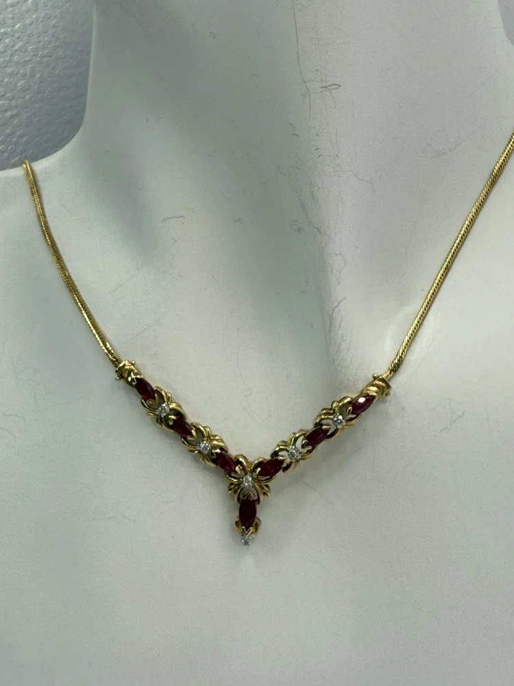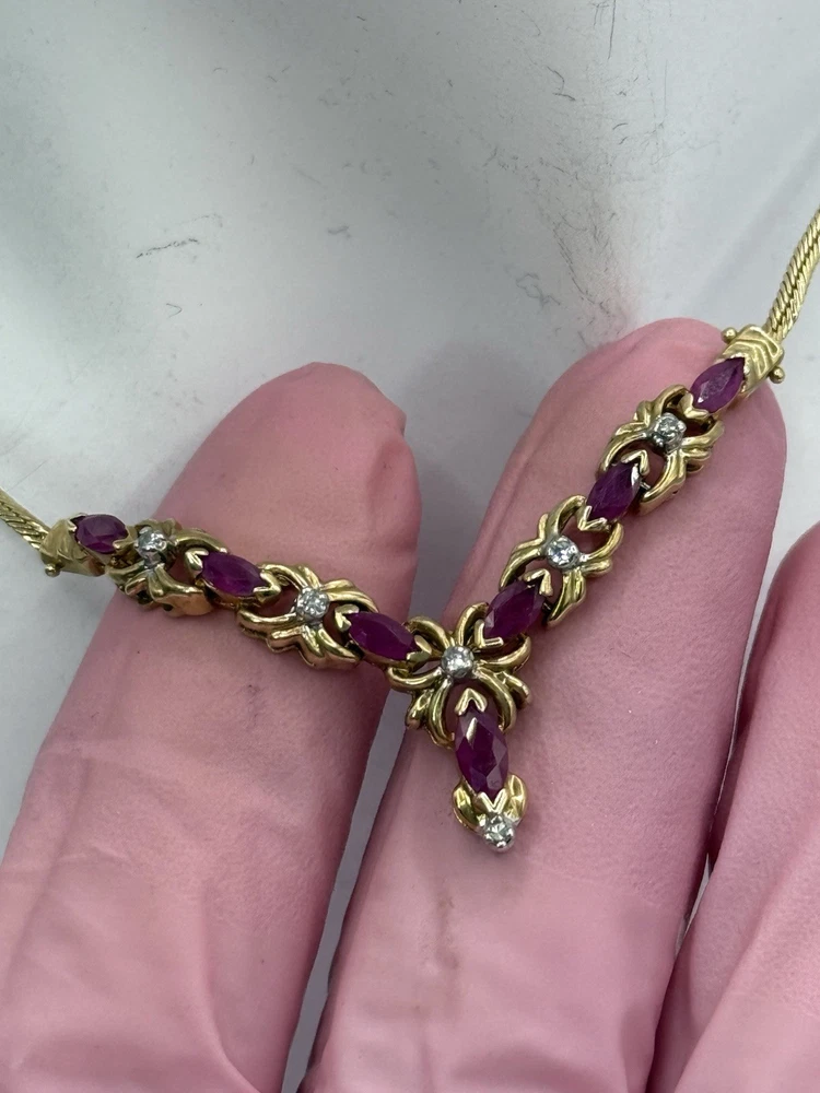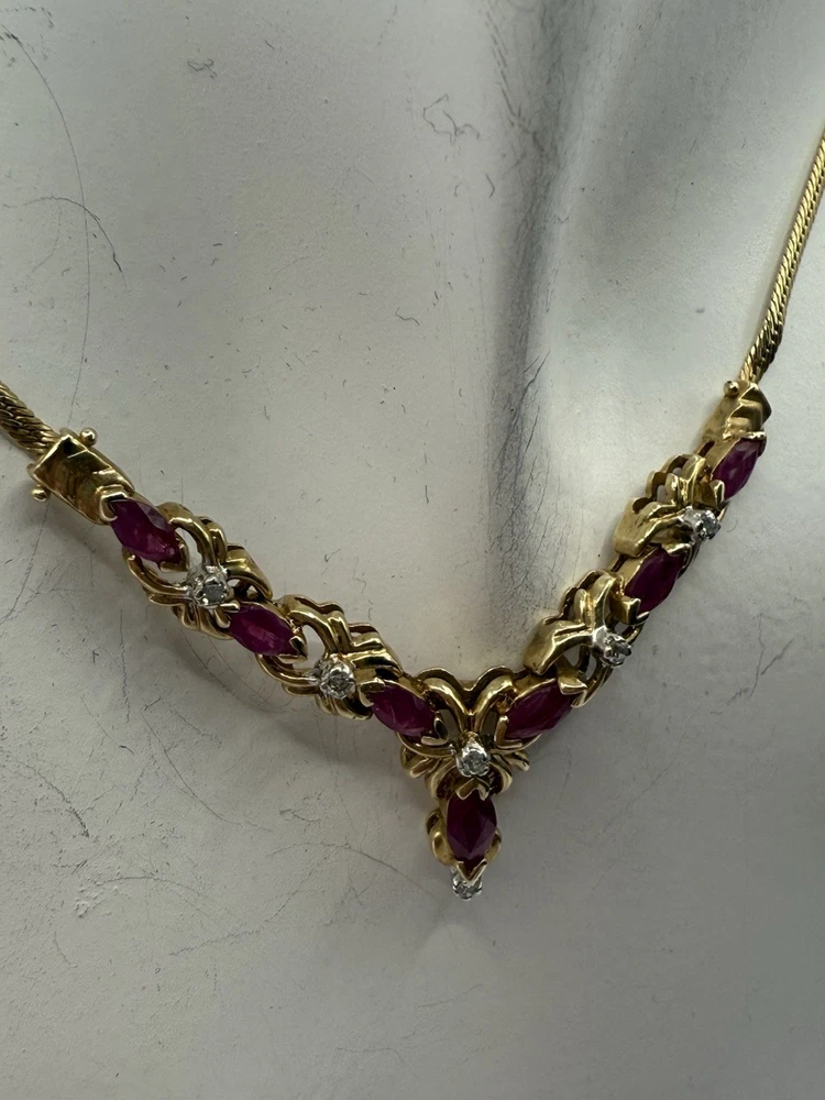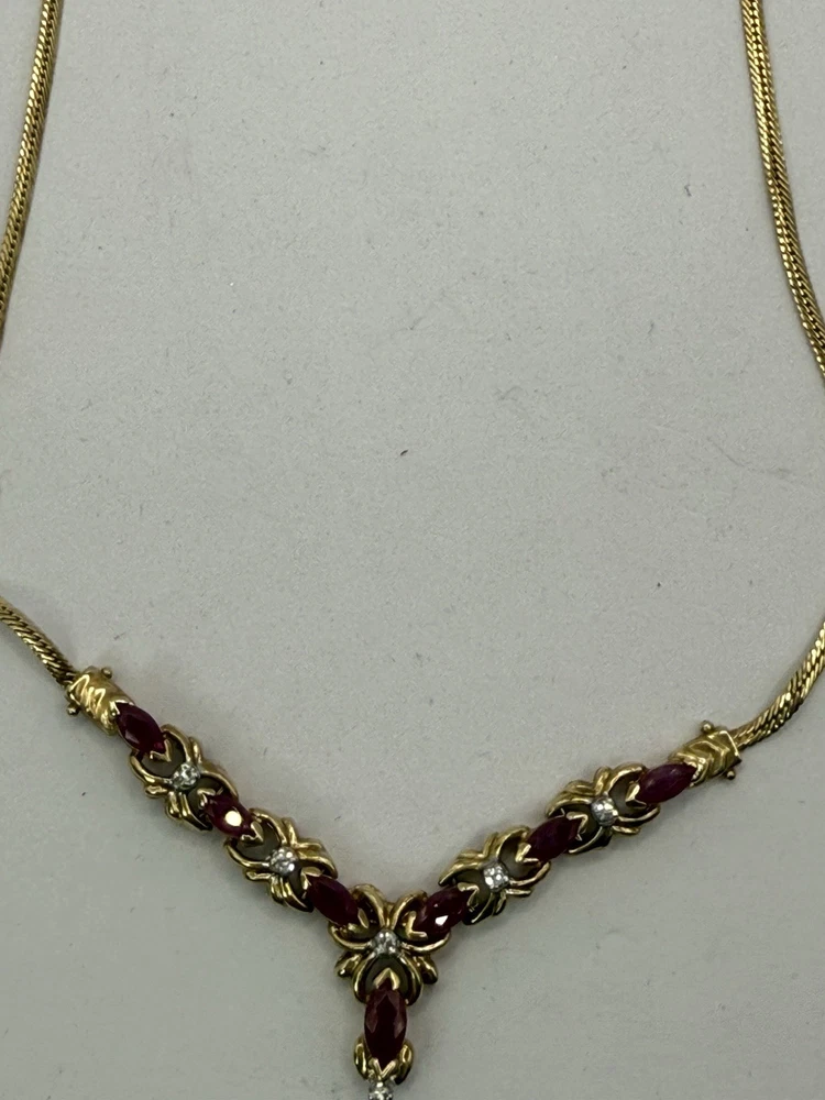 This fancy 10k gold Natural ruby and diamonds has a beauty to show Need a new home to enjoy wearing this fancy necklace Please scroll all pictures for weight and sizes