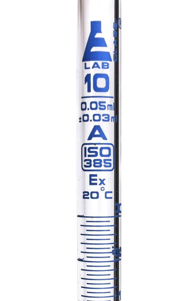 Burette 10ml - Class A, DIN ISO 385, Needle Valve Stopcock - Eisco Labs Class A, Accuracy as per DIN ISO 385 standard. Burette is made of high quality 3.3 borosilicate glass. PTFE Needle valve stopcock. Capacity 10ml Sub. Div.0.05ml Tolerance 0.3ml Product Details Brand EISCO Manufacturer EISCO Mpn CH0238A High quality 3.3 borosilicate glass Burette 10 ml capacity, 0.05 graduation lines PTFE Needle Valve Stopcock 18" tall, 0.3" diameter. Class A, DIN 385 Compliant Check out my other items. - Powered by