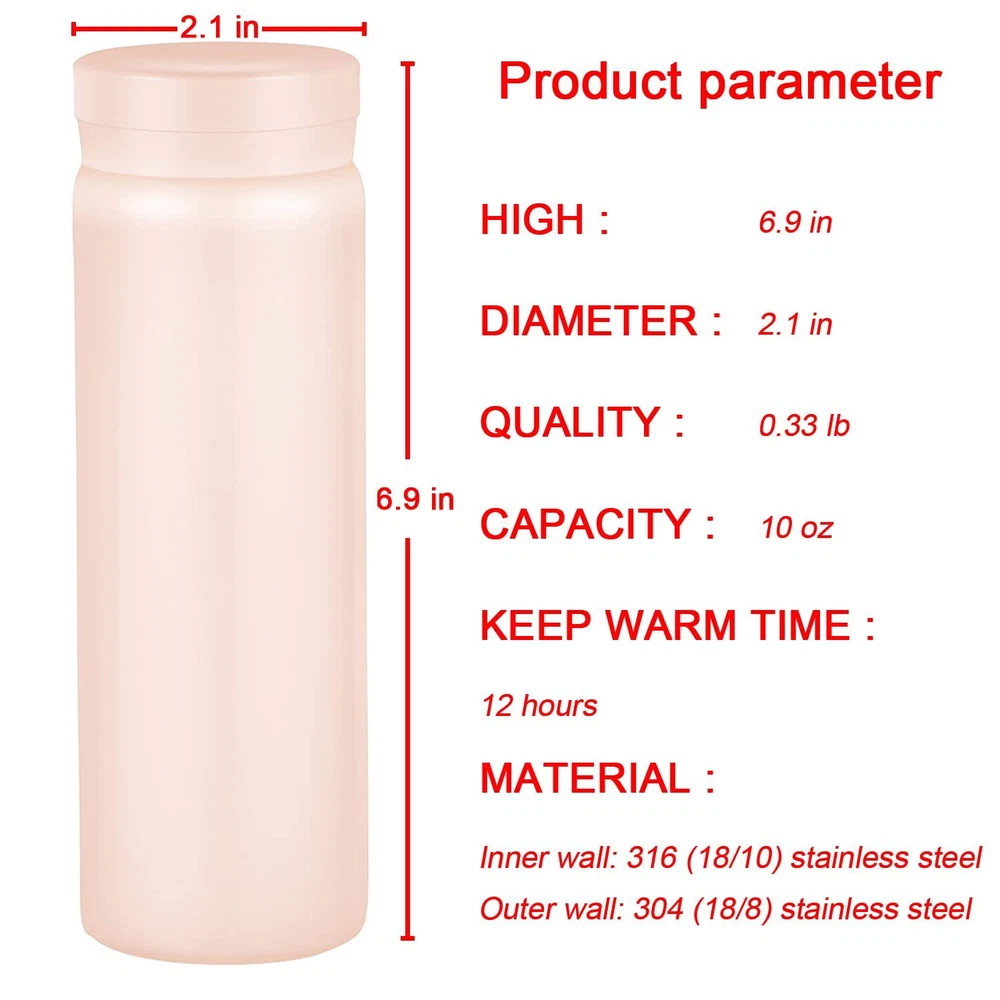 Mini Thermos Cute Water Bottle - 10 oz Tiny Insulated Vacuum 18/10 Stainless Steel Small Flask - Leak Proof & Spill Proof & Keeps Cold and Hot for Drink, Coffee, Tea - Pink Why Choose This Thermos: This slim and skinny thermos bottle is esay to carry, you can easily put into you backpack, purse, gym bag or suitcase. You can take it out when you have a water source. You will do not need to use a one-time cup or another person's cup, which can protect the environment. Innovative Vacuum Insulation: Our highly rated thermos bottle keeps drinks cold for 12 hours or hot for 6 hours. Our thermos water bottle retains temperatures for hours and prevents condensation from forming on the bottles exterior. Food Grade 18/10 Stainless Steel: This wide mouth thermos bottle is made of high quality food grade SUS 316 18/10 stainless steel,100% Safe for everyday use. Perfectly Portable: Pack this leak proof and sweat proof flask in lunch boxes, purses or backpacks without worrying about spills. Enjoy hot drinks in the winter or cold drinks in the summer with our small water bottle. Our versatile thermos can be used as a kids thermos for kids to take water, juice, or milk to school. This thermos can also be used by adults as a coffee thermos for work. Great Size: Our stylish bottles are small enough for kids hands, yet big enough for quenching thirsts. The size of the bottle opening makes for fast filling and easy cleaning. Brighten up your morning and your kids morning by filling up your thermoses with delicious beverages to go!