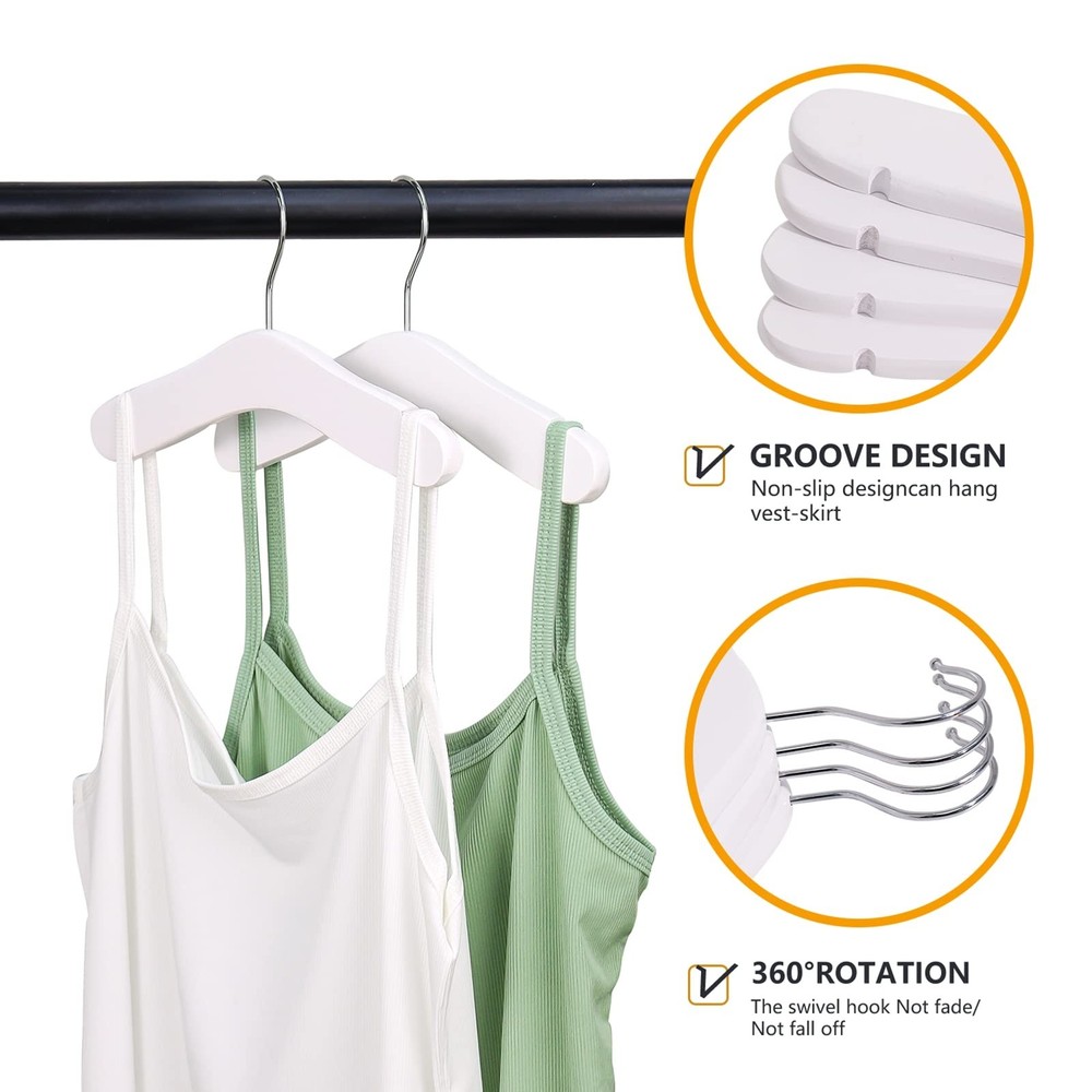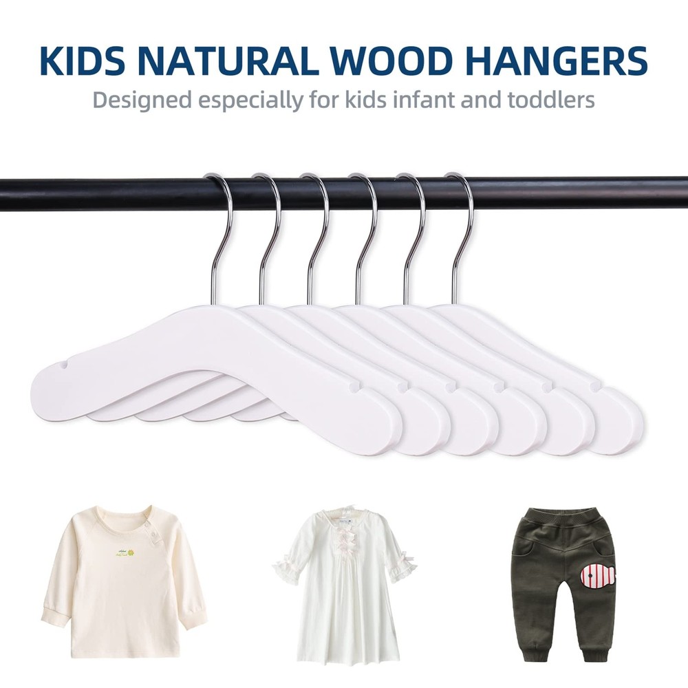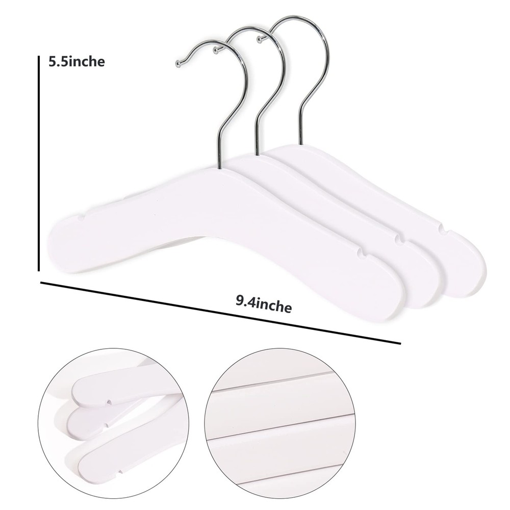 【Natural wood】These children's clothes hangers are made of high-quality wood, strong and durable, the natural texture and wood color of the hanger,does not contain any chemicals, so wooden hangers are safe and pollution-. 【Size】Width-9.4 inches ;Height- 5.5 inches ; Thickness- 0.47 inches ; Weight: 0.165 lb;Pack of 10 premium small wood hangers . 【Kid-sized】Natural wood hangers designed especially for infant and toddlers, ideal for hanging baby jackets, shirts, trousers, skirts and more,Don’t worry about clothes being deformed or damaged. Can also be used as pet/dog clothes hangers. 【Groove design】There are grooves on both ends of the small wood hangers , also perfect for hanging mom's bras, tank tops and camisoles. 【After-sales 】Please note that due to the different growth environments of trees, the surface color of the wooden hangers may be slightly different. If there is a problem with the product (small wood hangers ), please in time and we will solve the problem for you.