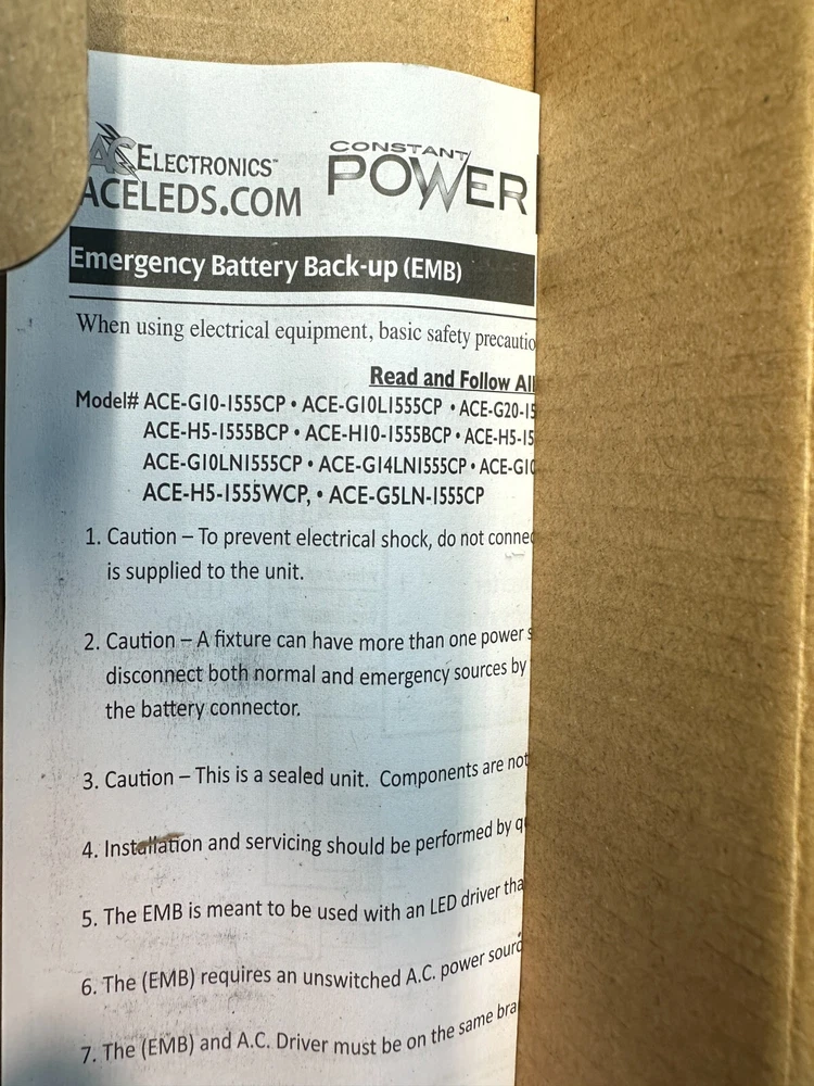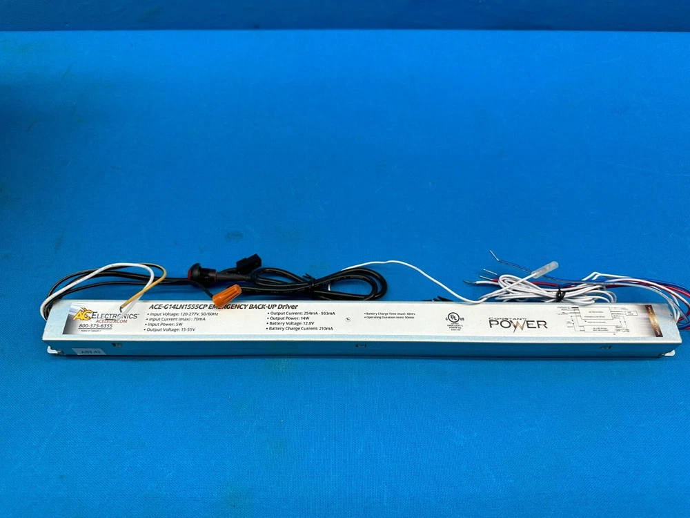 Lot of 10 AC Electronics Emergency Battery Lot of 10 - AC Electronics Emergency Battery Back-Up Driver ACE-G14LN1555CP New, Opened Box (Handled) Please View All Photos For Everything Included!! Product Information: The ACE-G14LN1555CP from AC Electronics is a UL Listed Linear Emergency LED Driver that enables the same LED fixture to be used for both normal and emergency operation. The ACE-G14LN1555CP contains a LiFePO4 battery, a high-efficiency battery charger, control circuitry, and high-efficiency power converter circuits, in a single metal enclosure. In the event of a normal power failure, the ACEG14LN1555CP switches to emergency-mode and operates the fixture’s LED array or module for 90 minutes at a constant power of 14 W. When normal power returns, the ACE-G14LN1555CP returns to normal-mode. The ACE-G14LN1555CP can be used in switched or unswitched fixture applications. The ACE-G14LN1555CP can drive any LED array or module in emergency-mode with a voltage range of 15-55 Vdc and that can operate at a current range of 254 mA to 933 mA. Features, Benefits, and Applications: Constant output power: Maintains constant emergency light levels over the full 90-minute runtime and over the output voltage range. Self-sensing output voltage: Automatically adjusts over the 15-55 V range to maintain constant power within the class 2 voltage range. PAYMENT POLICY We require immediate payment. We accept all major credit cards through PayPal/eBay Checkout. Customers please note: You do NOT have to have a PayPal/eBay account to pay for an item. Taxes and charges are not included in the item price or shipping charges. Sales tax will be applied to applicable states. These charges are the buyer's responsibility. SHIPPING POLICY Free USPS/Fedex/UPS shipping for 48 continental states . USPS shipping for Hawaii, Alaska, Puerto Rico, APO and P.O. Box address is additional, please email us for quotes. We ship most items same or next business day after receiving the payment. Please be aware that weekends are not business days. At our discretion large or expensive packages ($300.00) or over will receive signature confirmation. If this applies to you, please assure that an adult is available to sign for & accept the shipment. We ship everything professionally in our state of the art warehouse, boxed and shipped with perfection. We ship overseas. We ship nationwide. International buyers please note: Import duties, taxes and charges are not included in the item price or shipping charges. These charges are the buyers responsibility. Please check with your country's customs office to determine what these additional costs will be prior to bidding/ buying. RETURNS POLICY If you have any problems with your order, please take the time to email us before leaving a LOW STAR RATING or OPENING A CASE/ CLAIM! We have a 14 day return policy. We refund all shipping cost on defective/ incorrect items. 1. Changed your mind and don't want the item anymore? No problem. You have 14 business days from receipt to inform us of the return request and 5 days to ship it back to us. 15% Restocking fee applies. 2. Defective/ Dead items will be fully refunded or replaced after matching the serial number with the one in our records. 3. Non defective items must be never used or unopened for a refund. 4. Order/ bid cancellation: We can cancel your order only if you contact us within 1 hour after your purchase/ bid. 5. Refunds for returns of non-defective items with FREE SHIPPING will be LESS because of seller's shipping expense. You will be responsible for shipping the unit back and the shipping that was PAID to ship the unit to you. 2023 - CS WHOLESALE, LLC