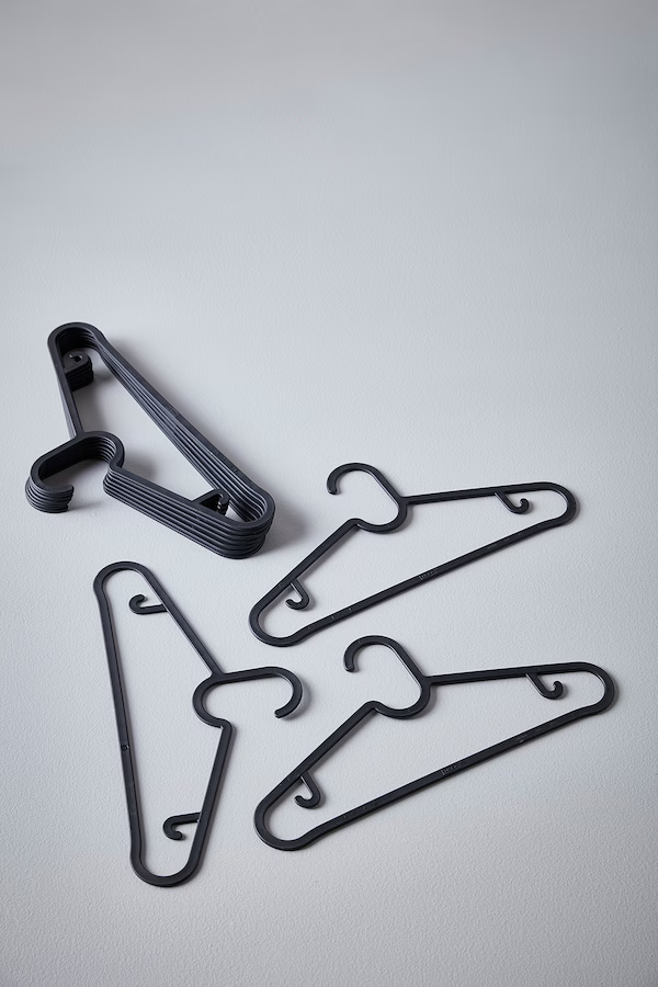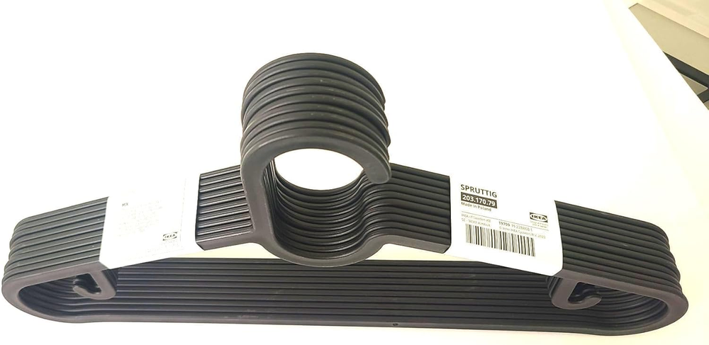 10x Black Plastic Clothes Hangers – Non-Slip, Heavy-Duty Coat & Jacket Hangers Upgrade your wardrobe with these durable and space-saving black plastic hangers . Designed for pants, shirts, and skirts , they take up less space than wooden hangers, allowing you to store more clothes neatly. Key Features: ✔ Versatile Design – Works as a pants, skirt, and shirt hanger in one ✔ Space-Saving – Slim profile maximizes wardrobe space ✔ Non-Slip & Heavy-Duty – Securely holds coats, jackets, and delicate garments ✔ Multipurpose Use – Ideal for closets, laundry rooms, and even bathrooms Product Details: Material: Polypropylene plastic (minimum 20% recycled) Care: Wipe clean with a soft cloth, water, and mild detergent if needed Width: 15 ¼ inches Package Includes: 10-pack hangers Designed by: Henrik Preutz Article Number: 203.170.79 💡 Like the price? Buy in bulk to keep your home organized