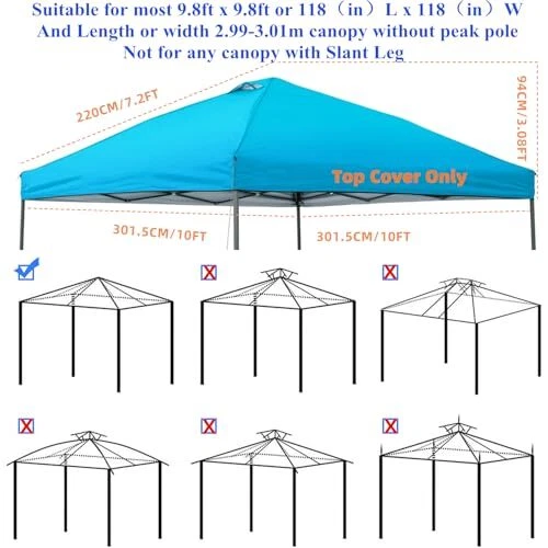 Menu 1. We require immediate payment. 2. We currently accept payment via eBay managed payments only. 3. Once payment is cleared, we will dispatch your shipment within 1-3 business days. Please refer to the "Shipping" tab for more information regarding shipping speed to your destination. 10x10 Canopy Replacement Top Cover,Pop Up Canopy Tent Top with Air Vent Ropes, Waterproof Sunshade Silver Coated Oxford Cloth for Outdoor Garden Patio Picnic Camping(Top Only,301 * 301cm) Product description ??【Anti-UV and Waterproof Fabric】The canopy tent top was made of polyester and Silver Coating on the back provide great sun protection, which is water-resistant and can effectively block up to 95% of the suns UV Rays. Double-layer with double line sewing enhances durability and water resistance. ??【Universal Replacement Cover】10x10ft (actually 301*301cm)canopy top suitable for most of the standard canopy frames with 4 straight foot legs, a good choice for replacing your broken one or buy it as a backup. This canopy top measures 10' W x 10' D x 37" H.(when placed on canopy frame). ??【Roof with Air Vent】This replacement top has air vent in the roof for air circulation and the circulation of oil fume in the barbecue tent. Perfect for commercial or recreational use, such as trade shows, outdoor events, camping, picnics, parties, BBQ, sporting events, arts,ect. ??【Easy to Set Up】Multiple velcro tabs with sticky hair for conveniently fixing the canopy top onto the frames, Tool-free Installation; Loop fasteners for easy fixing the top to the frame; Four corners equipped with rope,quick and easy to install in minutes. ??【Measurement Tips】 We only sell the canopy top replacements, frame not included! Please accurately measure whether your frame is 10*10FT before purchg. Not for any canopy with slant leg! PLEASE MESSAGE US IF YOU HAVE ANY OTHER QUESTIONS, AND MANY THANKS FOR READING ALL OF THIS. Copyright ©#. All Rights Reserved.