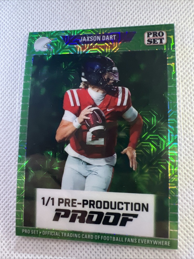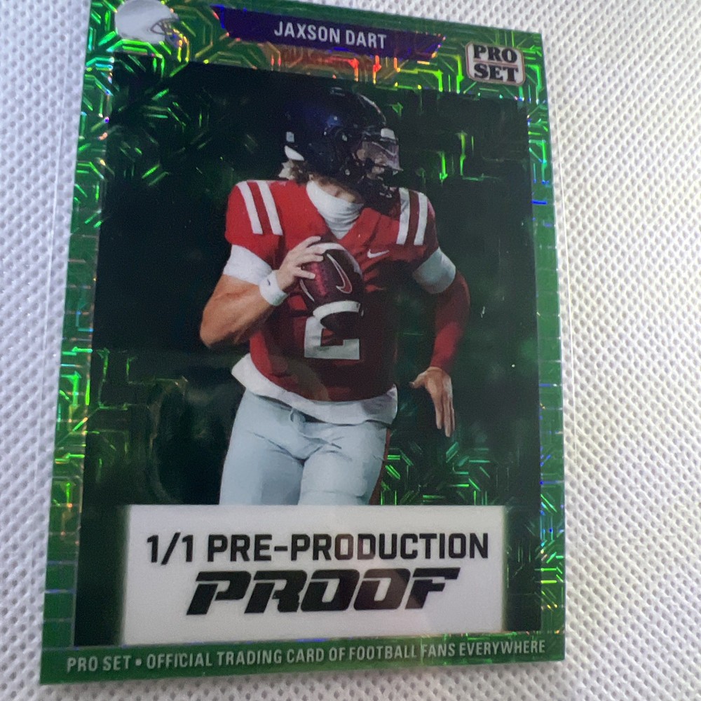 The product is a pre-production proof of the 1/1 Jackson dart, a unique and rare sports trading card featuring a darts theme. This card is numbered 1/1 comes with a warranty and guarantee for authenticity. As a highly sought-after item in the sports trading card market, it appeals to collectors looking for exclusive and limited edition cards to add to their collection.