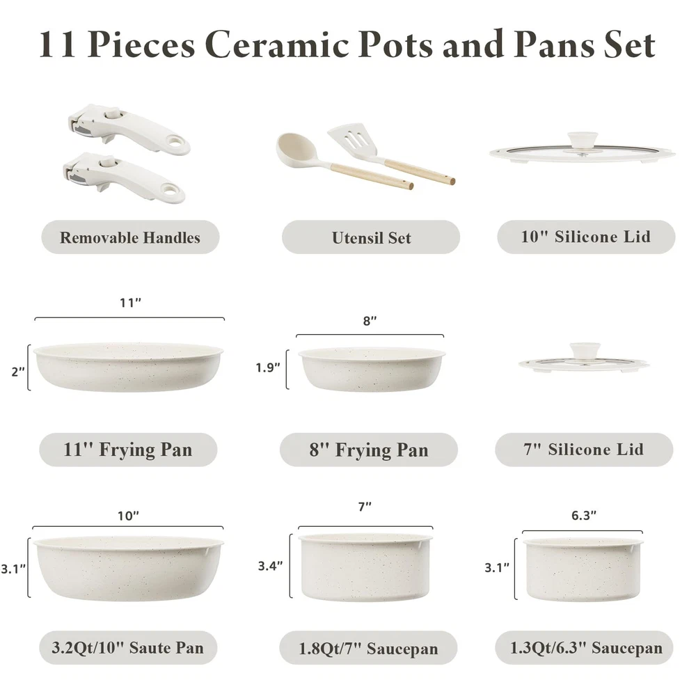 Healthy Ceramic Coating: Made of natural ceramic, our kitchen cookware set is Teflon-free and guarantees no PFAS, PTFE, PFOA, lead, or cadmium.Stain-resistant and durable for long-lasting use; Ideal choice for safety-conscious families, especially those with babies. Effortless Storage: Save 70% kitchen space by neatly stacking pots and pans in cabinets or drawers; perfect for compact spaces, RVs and campers. Innovative Detachable Handles: Transform pots with a "CLICK" into baking dishes, serving plates, or fridge storage, enhancing versatility. Ultra Non-Stick Performance: Experience 5X superior non-stick cooking with minimal oil - food just slides off smoothly.No fumes emitted, even when overheated. Easy Cleaning: While our cookware is dishwasher-safe for your convenience, we highly recommend handwash. A simple rinse or quick wipe effortlessly removes any residue, ensuring your cookware remains spotless and maintains its pristine condition with ease. Suitable for all heat sources: Enlarged, thickened magnetic base ensures compatibility with all stovetops, including induction and oven; Crafted from recyclable aluminum ensures lightweight yet sturdy, and promotes rapid and even heating. 11-Piece Set Includes: 1.3QT(6.3") & 1.8QT(7") saucepans 8-inch & 11-inch frying pans 3.2QT(10")sauté pan 2 removable handles 7-inch & 10-inch glass lid silicone slotted turner & ladle Healthy Ceramic Coating: Made of natural ceramic, our kitchen cookware set is Teflon-free and guarantees no PFAS, PTFE, PFOA,PFOS, lead, or cadmium.Stain-resistant and durable for long-lasting use; Ideal choice for safety-conscious families, especially those with babies Effortless Storage: Save 75% kitchen space by neatly stacking pots and pans in cabinets or drawers; perfect for compact spaces, RVs and campers Innovative Detachable Handles: Transform pots with a "CLICK" into baking dishes, serving plates, or fridge storage, enhancing versatility Ultra Non-Stick Performance: Experience 5X superior non-stick cooking with minimal oil - food just slides off smoothly.No fumes emitted, even when overheated Easy Cleaning: While our cookware is dishwasher-safe for your convenience, we highly recommend handwashing. A simple rinse or quick wipe effortlessly removes any residue, ensuring your cookware remains spotless and maintains its pristine condition with ease Universal Cooktop Compatibility: Enlarged, thickened magnetic base ensures compatibility with all stovetops, including induction and oven; Crafted from recyclable aluminum ensures lightweight yet sturdy, and promotes rapid and even heating 11-Piece Set Includes: 1.3QT(6.3") & 1.8QT(7") saucepans, 8-inch & 11-inch frying pans, 3.2QT(10")sauté pan, 2 removable handles, 7-inch & 10-inch glass lid,silicone slotted turner & ladle