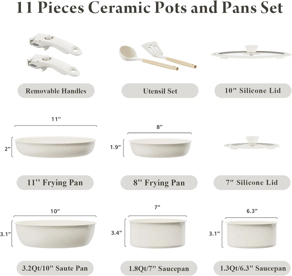 Healthy Ceramic Coating: Made of natural ceramic, our kitchen cookware set is Teflon-free and guarantees no PFAS, PTFE, PFOA,PFOS, lead, or cadmium.Stain-resistant and durable for long-lasting use; Ideal choice for safety-conscious families, especially those with babies Effortless Storage: Save 75% kitchen space by neatly stacking pots and pans in cabinets or drawers; perfect for compact spaces, RVs and campers Innovative Detachable Handles: Transform pots with a "CLICK" into baking dishes, serving plates, or fridge storage, enhancing versatility Ultra Non-Stick Performance: Experience 5X superior non-stick cooking with minimal oil - food just slides off smoothly.No toxic fumes emitted, even when overheated Easy Cleaning: While our cookware is dishwasher-safe for your convenience, we highly recommend handwashing. A simple rinse or quick wipe effortlessly removes any residue, ensuring your cookware remains spotless and maintains its pristine condition with ease Universal Cooktop Compatibility: Enlarged, thickened magnetic base ensures compatibility with all stovetops, including induction and oven; Crafted from recyclable aluminum ensures lightweight yet sturdy, and promotes rapid and even heating 11-Piece Set Includes: 1.3QT(6.3") & 1.8QT(7") saucepans, 8-inch & 11-inch frying pans, 3.2QT(10")sauté pan, 2 removable handles, 7-inch & 10-inch glass lid,silicone slotted turner & ladle Product Description Why Choose Bazova Detachable Handle Pots and Pans Set? Seamless mobility with a click – the removable handles provide flexibility, effortlessly transitioning cookware from stoves to the oven, grill, fridge, and finally to the dinner table. Explore the convenience now. A Versatile Set of Pots and Pans Servers as a frying pan, a dinner plate From Stove, To The Table Unlock the boundless potential of the cookware with its detachable handle – perfect for cooking on any stovetop or serving as elegant dinnerware on the table. Servers as an oven plate Remove Handle, To The Oven Just one click, remove the handle for oven use. Let's make delicious stews! Servers as RV cookware To the Outdoors Stackable and space-saving, our cookware is perfect for RV trips or camping. Enjoy the convenience and ease of bringing our versatile pots along on your journey. Optimal Storage Save 75% Space - Our cookware set is designed for perfect stacking in kitchen drawers, cabinets, cupboards,RVs, travel trailers and motorhomes. Important Tip- We suggest to detach the handle during cooking when you don't need it for fixing. This could greatly extend the lifespan of the handle. Cooking with Ceramic Nonstick Cookware Healthy and Safe Safety First - Our cookware features natural ceramic nonstick,setting it apart from Teflon - free from harmful chemicals and heavy metals such as PFAS,PTFE,PFOA,lead, and cadmium.Prioritize your health with a toxic-free cooking experience. Built for Last -Stain & scratch-resistant,keeps great nonstick performance even after years of use. With Bazova Ceramic Non-stick Ultra Smooth & Nonstick Easy Cooking Smooth interior makes it exceptionally nonstick - perfect for everyday cooking like pancakes, eggs, steaks, and fish. Clean with 5 Sec. Easy Cleaning Rinse or wipe clean - zero residue in 5 seconds. Alternatively, toss it in the dishwasher for time-saving convenience. Heat Transfer Even& Rapid Feature an enlarged and thickened bottom for rapid and even heating. All Stoves Compatible The magnetic conductive bottom ensures compatibility with all stovetops, including induction. 1 What's Included 2 Use & Care