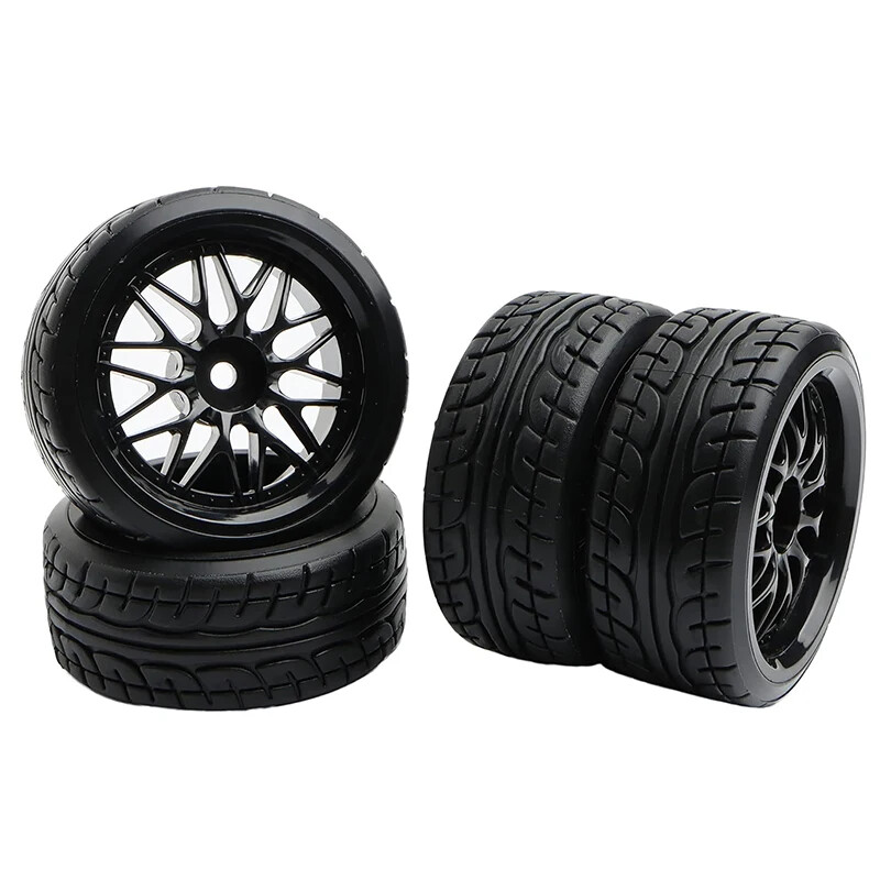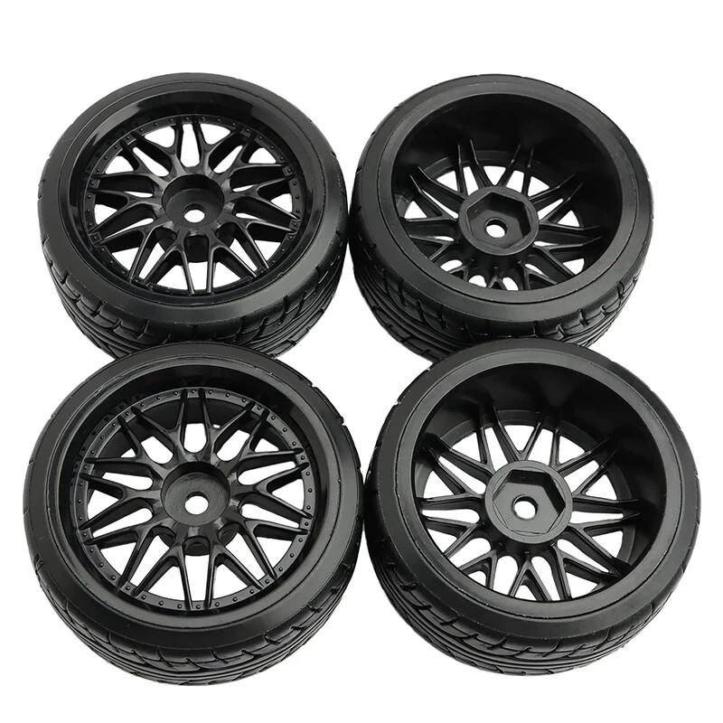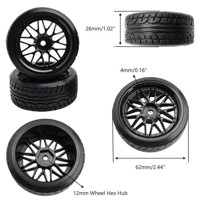 Package Include: 4x Tires & Wheels Rim Complete (Note: The tire is not glued on rim. It's mounted on rim) Features: Tire Material: Hard Plastic; Wheel Rim Material : Hard Plastic; Tires Outside Diameter: 2.44''(62mm); Width: 1.02'' (26mm); The tires is easy to install&replace, also suitable for a variety of RC car models, for example:HSP94122 94123 94103 3850 3851 FW06 XV01 TT01 TT02B TT-02 18868 16889 16889A 16890 144001 A959B Off-Road Buggy RGT WRC/3RACING D5 On Road Touring Car and so on, making it easier to disassemble and assemble the tires.