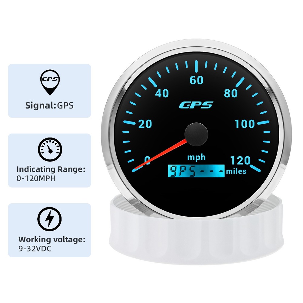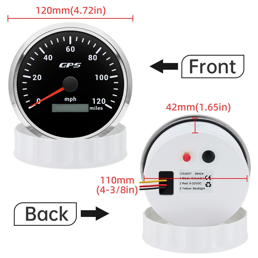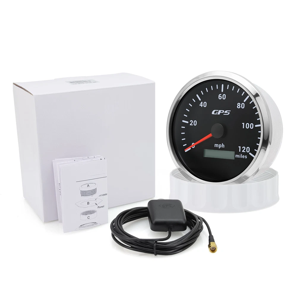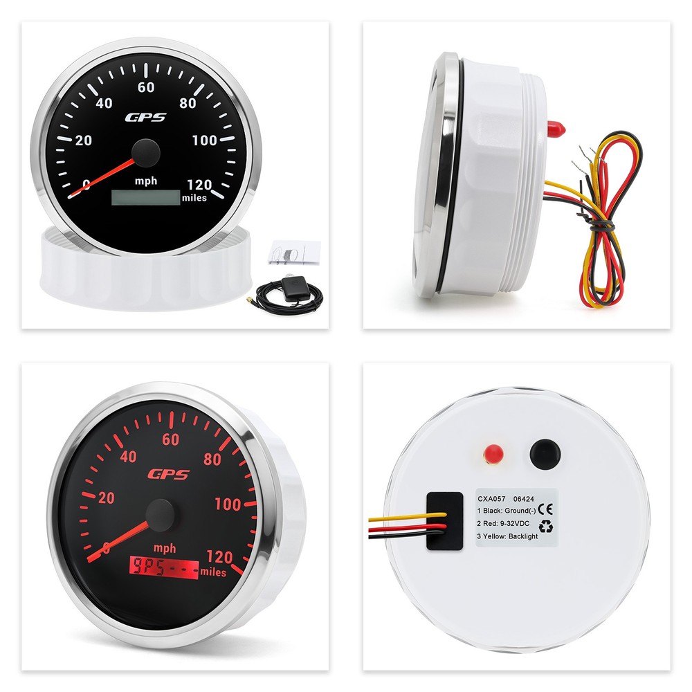110MM Black GPS Speedometer 0-120MPH Gauge Waterproof for Motorcycles Boat Car 110mm 4-3/8inch Waterproof GPS Speedometer 0-120MPH Odometer Gauge 7Colors LED for Motorcycles Boat Car Truck Descriptions: High-brightness LED backlight. 316 stainless steel for long-term use even in acid-base, humid environment. IP67 waterproof and dust-proof grade. With curved glass( with anti-fog function). Suitable for all kinds of vehicle modification. Using stepper motor drive pointer, accurate display of the engine speed, and with the LCD display clear display mileage. Gauges have many kinds backlight color (red,yellow,orange,green,blue,purple,white),customers can adjust any color that you like Specification: Material: Stainless Steel 316L Bezel + Anti-fog Glass Install Diameter: Φ110mm or 4-3/8inch Signal: GPS Indication Range: 0-120MPH Working Voltage: 9~32V DC Working Current: ≤100mA Operating Temperature: -30℃ ~ 75℃ Storage Temperature: -40℃ ~ 85℃ IP67 waterproof and dustproof grade Connection: Black: Ground(-) Red: 9-32VDC Yellow: Backlight Package Includes: 1 x 110mm GPS Speedometer Gauge 1 x GPS Antenna 1 x Wire Harness 1 x Instruction