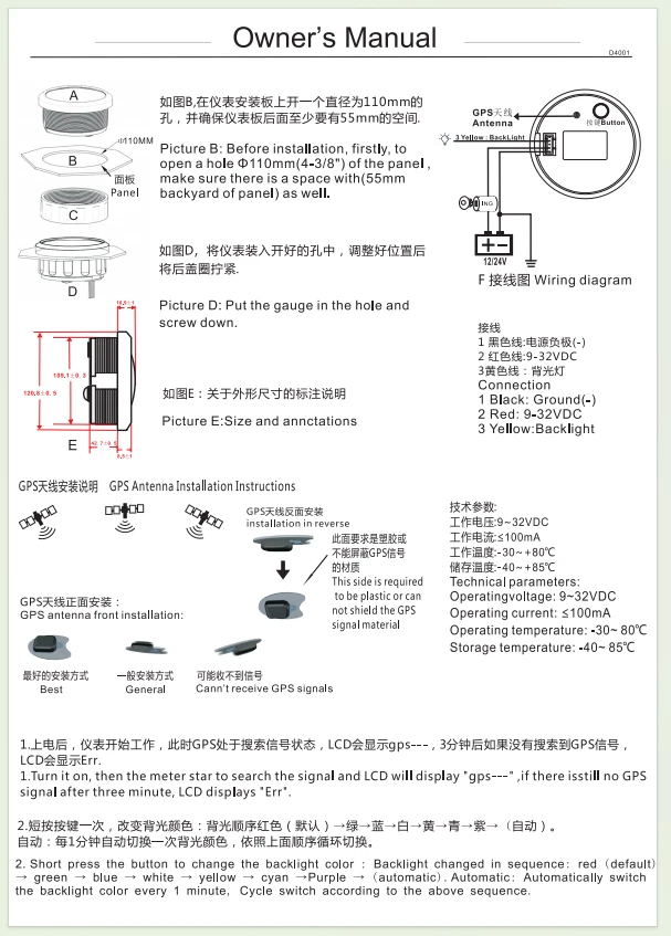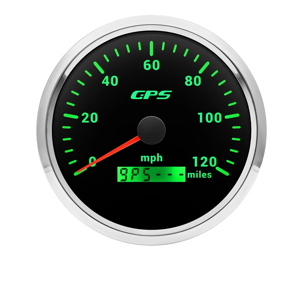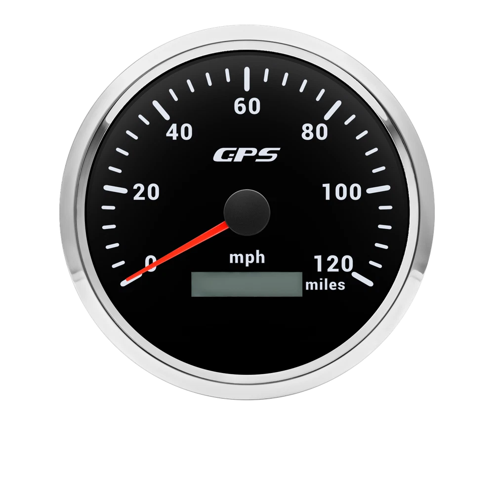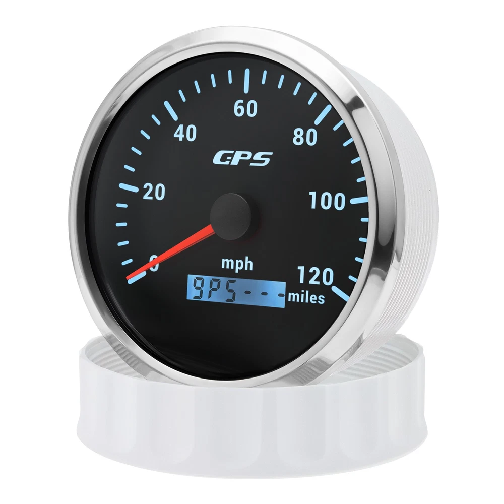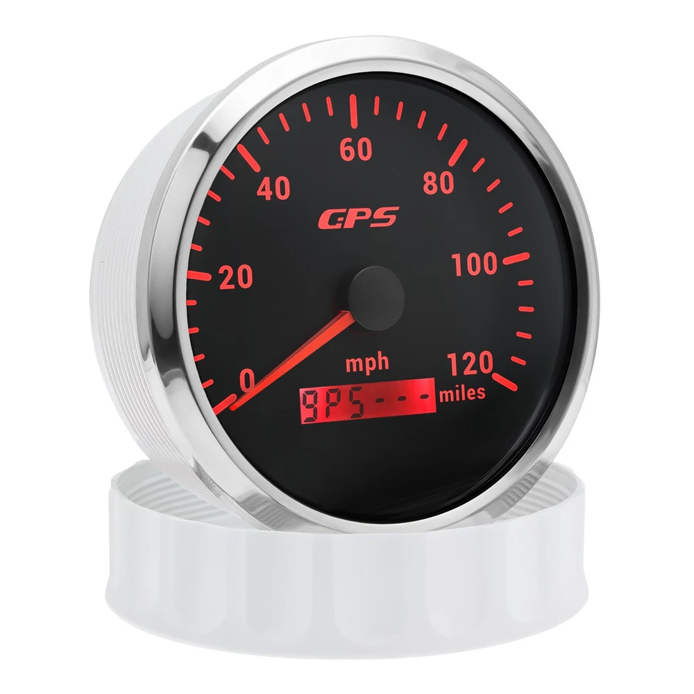 110MM Black GPS Speedometer 0-120MPH Gauge Waterproof for Motorcycles Boat Car 110mm 4-3/8inch Waterproof GPS Speedometer 0-120MPH Odometer Gauge 7Colors LED for Motorcycles Boat Car Truck Descriptions: High-brightness LED backlight. 316 stainless steel for long-term use even in acid-base, humid environment. IP67 waterproof and dust-proof grade. With curved glass( with anti-fog function). Suitable for all kinds of vehicle modification. Using stepper motor drive pointer, accurate display of the engine speed, and with the LCD display clear display mileage. Gauges have many kinds backlight color (red,yellow,orange,green,blue,purple,white),customers can adjust any color that you like Specification: Material: Stainless Steel 316L Bezel + Anti-fog Glass Install Diameter: Φ110mm or 4-3/8inch Signal: GPS Indication Range: 0-120MPH Working Voltage: 9~32V DC Working Current: ≤100mA Operating Temperature: -30℃ ~ 75℃ Storage Temperature: -40℃ ~ 85℃ IP67 waterproof and dustproof grade Connection: Black: Ground(-) Red: 9-32VDC Yellow: Backlight Package Includes: 1 x 110mm GPS Speedometer Gauge 1 x GPS Antenna 1 x Wire Harness 1 x Instruction