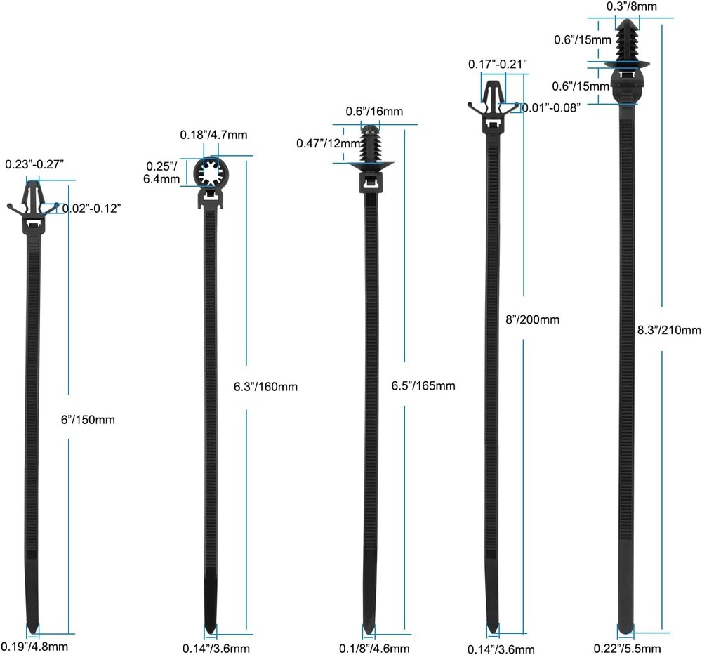 110 PCS Automotive Installation Black Push Mount Cable Zip 110 PCS, Product Details Material: Nylon Color: Black Brand: Armpow Item Length: 13.7 Inches Style: Zip Maximum Diameter: 0.14 Inches Number of Pieces: 330 Manufacturer: Armpow Part Number: Car Zip Ties Item Weight: 6.7 ounces Country of Origin: China Item model number: Car Zip Ties Size: 110 PCS Item Package Quantity: 1 Batteries Included?: No Batteries Required?: No Material: Nylon Color: Black Brand: Armpow Item Length: 13.7 Inches Style: Zip 【Multiple Sizes】You Will Get 110 Pcs 5 Sizes Nylon Universal Cable Zipper Tie Kits, Regular Shapes And Sizes To Meet All Your Needs, Perfect For Fixing Wires, Cables And Small Hoses In The Engine Compartment Of Your Car 【Made Of High Quality Material】The Cable Tie Holder Is Made Of High Quality Nylon Plastic, Acid Resistant, Corrosion Resistant, Not Easy To Aging, Flame Retardant And High Toughness In - 40~266 ° F Temperature Can Still Maintain Good Performance 【Good Fastening】Our Zippers Have Larger Ratchet Locks And Deeper Teeth. Provide Strong Self-Locking Fastening Force, Pin Type Zipper Head Clear Fastening, Through The Fixing Holes, Can Only Be Pulled Tight, Can Not Be Loosened, To Help You Better Fix The Cable Wire 【Convenient Use】Bundle What You Want To Organize, Self-Locking Design Ensures Tighter And Safer Bundling Of Cables, Used To Replace Old/Broken Push-In Cable Ties When Working On Engines And Electrical Systems 【Size and quantity】 (5.5* 210mm-0.21x8.3 inch) 40PCS thread head cable tie (4.6x170mm-0.18x6.7 inch) Cable ties with thread head 25PCS (4.8x150mm to 0.19x5.9inch) 15PCS of cable ties for the aircraft nose (3.6x200mm-0.14x7.9 in.) 15 aircraft headband (6.4 x 160mm to 0.25x6.3inch) M6 cable ties 15PCS