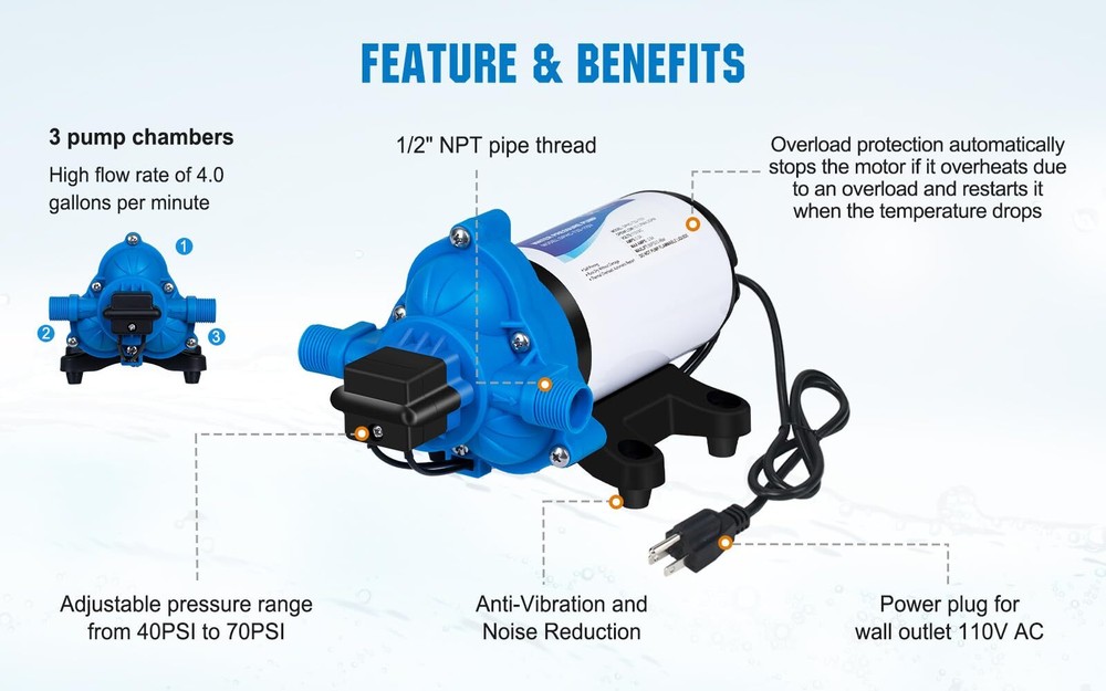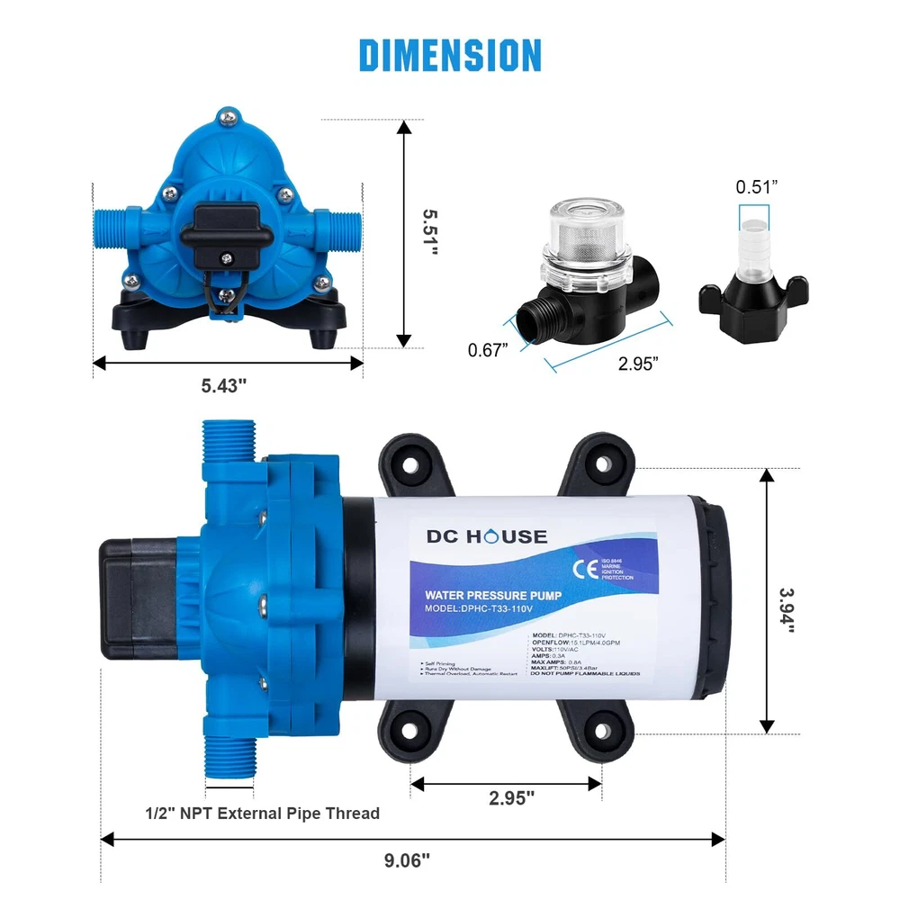 110 Volt RV Water Pressure Diaphragm Pump 4GPM 50PSI 33-Series 110V AC Camper On Demand Water Transfer Pump Electric with Power Plug for Bathroom Kitchen Food Truck Sprinkler Irrigation (1) 110V Water Pressure Booster Pump,(2) 1/2" Barbed Hose Adaptors,(1) Teflon Tape, (1) Transparent Strainer, (1) User Manual, (1) Pressure switch L-rotator 110V RV water pump, 50 PSI pressure setting, water flow up to 4 gpm. Self-priming vertical height of 9.8 feet and easily lifts up to 131 feet when in use Equipped with an automatic pressure switch that turns on immediately when the faucet is turned on. Features silent, thermal protection and runs dry without damage It is a handy tool for RV, agricultural spraying, water transfer, home, camping, and perfect for your daily water needs If you have after-sales and technical questions, please let us know via the order. We have a mature customer service team dedicated to providing relevant support for WATER PUMP 33 Series Food Truck Water Transfer Pump 110V 4.0GPM 50PSI The fresh water pump is made for home booster systems. It is suitable for pumping and cleaning such as sprayers, garden sprinklers, car washes, etc. Delivers up to 4.0 gallons of water per minute at up to 50 PSI. Easy to install, quiet operation and consistent water flow. The diaphragm water pump is thermally protected and can run dry without damage. Package Include (1)110V diaphragm pump (2) 2* 1/2 "Hose adapter (3) 50 Mesh transparent strainer (4) Pressure switch L-rotator (5) The user manual Specifications Voltage: 110 v AC Itself size: 9.1 * 5.4 * 5.5 inches entry/exit: 1/2 "NPT Flow: 4.0 GPM (15.1 LPM) Amp: 0.3A (0.8A Max) Cut-off pressure :50 PSI(3.4Bar) Shipping We offer FREE shipping on all orders! We ship within Three business days of payment, usually sooner. We use a selection of shipping services such as UPS, FedEx, USPS etc. We only ship to the lower 48 states, no APO/FPO addresses or PO Boxes allowed. Local pickups and combined shipping options are not provided at this time. Return You can return a product for up to 30 days from the date you purchased it. Any product you return must be in the same condition you received it and in the original packaging. Please keep the receipt. Payment We accept payment by any of the following methods: PayPal Please pay as soon as possible after winning an auction, as that will allow us to post your item to you sooner! Feedback Customer satisfaction is very important to us. If you have any problem with your order, please contact us and we will do our best to make you satisfied. Contact Us If you have any queries, please contact us via ebay. We usually respond within 24 hours on weekdays. Please visit our eBay store to check out other items for sale! Thank you for shopping at our store.