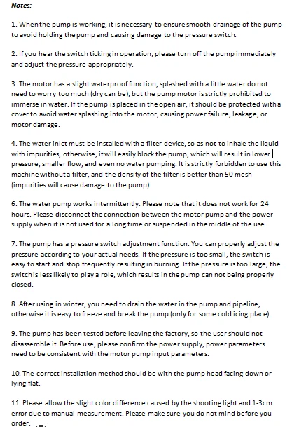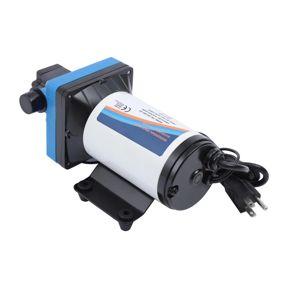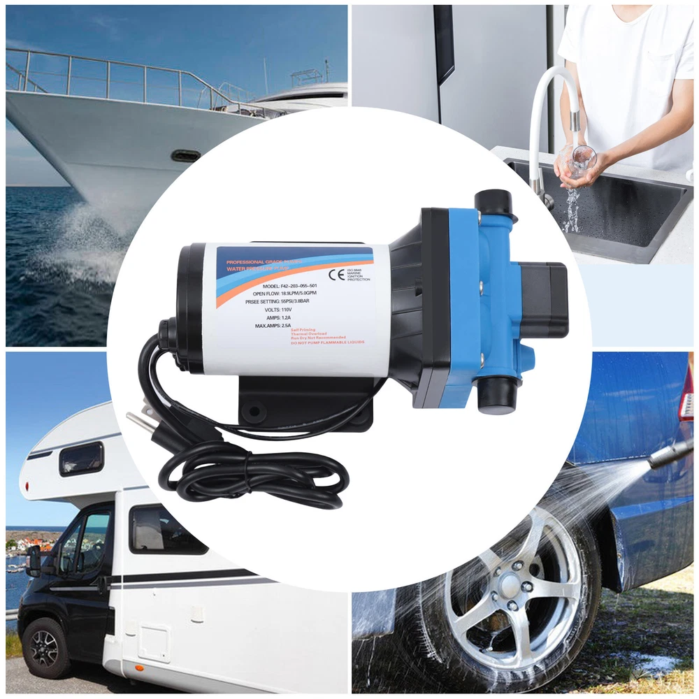 110V Self Priming Water Pressure Diaphragm Pump 55 PSI for Home/Caravan/Marine Description Self Priming Water Pressure Diaphragm Pump 18.9L/min 55 PSI Caravan/Marine Description If you are looking for a high flow, high efficiency, portable and durable high-quality water pump to help pump water, you can't go wrong with our professional water pump. This water pump uses a pure copper motor to provide it with powerful and stable power. With a rated head of 124.67 feet, it can water farmland and vegetation over long distances, saving time and effort on manual transportation. The pump's 4.99 GPM flow rate makes pumping water even faster. Key Features High-quality Materials : The water pump's body is made of engineering plastic, while the valve is made of EPDM. The excellent anti-aging and corrosion resistance of engineering plastic and EPDM make this pump strong and durable. Automatic Start/Stop : The water pump features an automatic start/stop design, which allows the pump to turn on/off automatically when you turn the faucet on/off. The auto start/stop design is easy to operate and reduces power consumption. Pure Copper Motor : The coil of the motor is made of pure copper, which is more stable and durable because it has less resistance compared to aluminum. Remote Irrigation : With a maximum head of 124.67 feet, the water pump can water farmland and vegetation over long distances, saving time and effort in manual transportation. Sturdy and Durable : The water pump features a built-in bypass return design. When the actual flow rate used is less than the pump output, the pressure relief cycle is activated. This effectively protects the pressure switch to extend the product's life. Standard Fittings : The water pump uses 1/2" standard fittings to fit most equipment sizes. This is easy to install and use. Adjustable Pressure : The automatic pressure switch has an adjustable range of 2.20-9.03 lbs. This adjustable automatic pressure switch can be applied to more scenarios. High Safety : The water pump is equipped with overheat and overload protection. When the pump generates too much heat or overloads, the pump will automatically disconnect the circuit. Such a good protection design greatly enhances its safety in use. Easy to Carry : The water pump's 6.17 pounds weight and compact size make it very easy to carry and use. Details Iron Plate Mounting Feet : The water pump's mounting feet are made of iron, which is strong and durable. The iron mounting feet can significantly reduce the working noise and improve the working environment. Moreover, the surface of the iron plate is galvanized, which makes it less likely to rust and corrode. Filter : The filter can effectively filter out debris and other particles from the pump. And its detachable design makes it easy to clean and assemble. PA Pump Head : The head of this pump is made of PA, whose excellent toughness and fatigue resistance can extend the service life of the pump. Arrow Indication : The surface of the water pump is equipped with an interface arrow indication, which makes it easy to connect external equipment. Interface Protective Cover : The water pump is equipped with a protective cover at the interface, which can effectively protect the interface from being damaged in transit. Application The water pump is suitable for filling equipment, agricultural irrigation, dishwashers, spray equipment, etc. Specification Pump Body Material: Engineering Plastic Color: Blue Valve Material: EPDM Diaphragm Material: TPE Pump Head Material: PA Valve Seat Material: POM Plastic Voltage: 110V Current: 2.5A Power Frequency: 50HZ Rated Power: 275W Connection Method: Thread Voltage Fluctuation Range: +-10% of rated value Volume of Solid Impurities In the Medium: <=0.1 Media Containing Solid Impurities In the Particles: <0.2mm/0.004in Stop Pressure: 55PSI/3.8BAR Control Mode: Pressure/Return Switch Wiring Method: Double-core Wire Ambient Temperature: Less than or Equal to 50℃ Medium Temperature: 0-65℃ Medium PH: 5.0-10 Rated Flow Rate: 18.9L/min Rated Head: 38m/124.67ft Inlet Size: 1/2in-14 Male Threaded Interface Pressure Adjustment Range: 1-4.1kg/2.20-9.03lbs Product Size: 23.3*12.6*10.9cm/9.2*5*4.3in Package Size: 29.9*14.6*12.8cm/11.77*5.74*5.03in Net Weight: 2.80kg/6.17 lbs Gross Weight: 2.84kg/6.26lbs Pressure Switch Adjustment Method 1. Open the pressure switch cover with a screwdriver. 2. Locate the internal hexagonal screw hole in the center of the switch. 3. Turn it clockwise to increase the pressure, and counterclockwise to decrease the pressure. Operating Instructions 1. Connect the pump with the inlet and outlet pipes, and make sure that the inlet and outlet pipes are tightly connected, otherwise, it will cause low pressure, no water suction, water leakage, and other problems. 2. Install a filter at the inlet end. The density of filtration is better than 50 mesh. 3. The pump is connected to the power supply, and the output parameters of the connected power supply must meet the input requirements of the motor. 4. Turn on the power, and the pump starts to run out of water for 5-10 seconds. Drain the air in the pump and pipeline. When the water is stable, turn off the power temporarily. Then connect the water gun, faucet, shower, and other related tools. 5. When you stop using, just turn off the water outlet faucet. The water pump has a pressure switch automatic start/stop function. You just open the faucet for the next use. Package Included 1*Water Pump 1*Strainer 2*Connectors Notes 1. When the pump is working, it is necessary to ensure smooth drainage of the pump to avoid holding the pump and causing damage to the pressure switch. 2. If you hear the switch ticking in operation, please turn off the pump immediately and adjust the pressure appropriately. 3. The motor has a slight waterproof function, splashed with a little water do not need to worry too much (dry can be), but the pump motor is strictly prohibited to immerse in water. If the pump