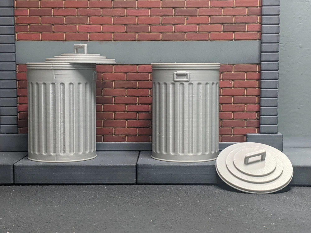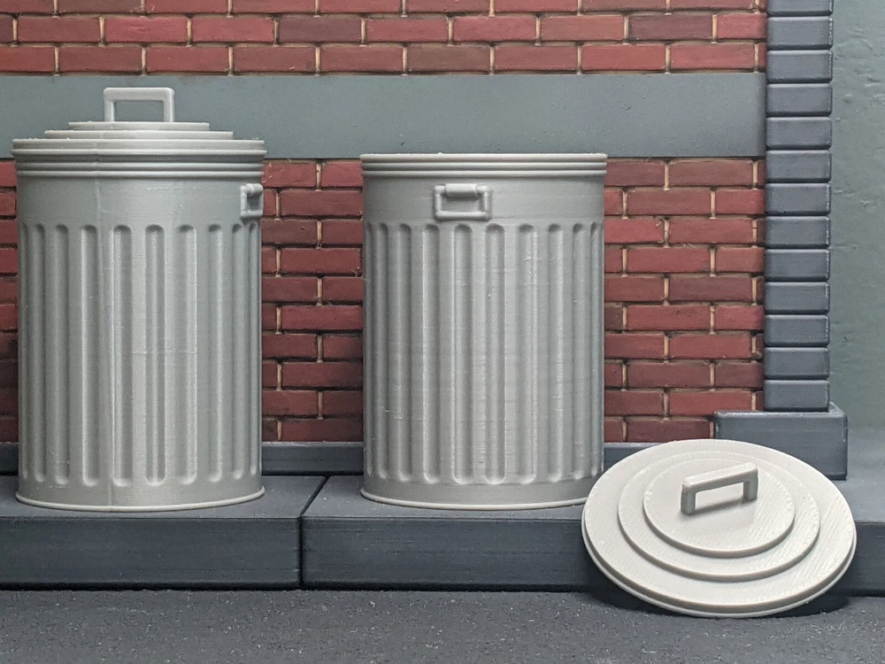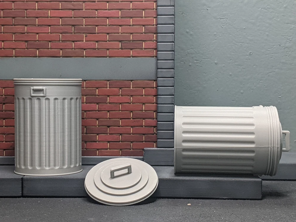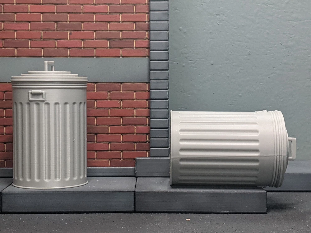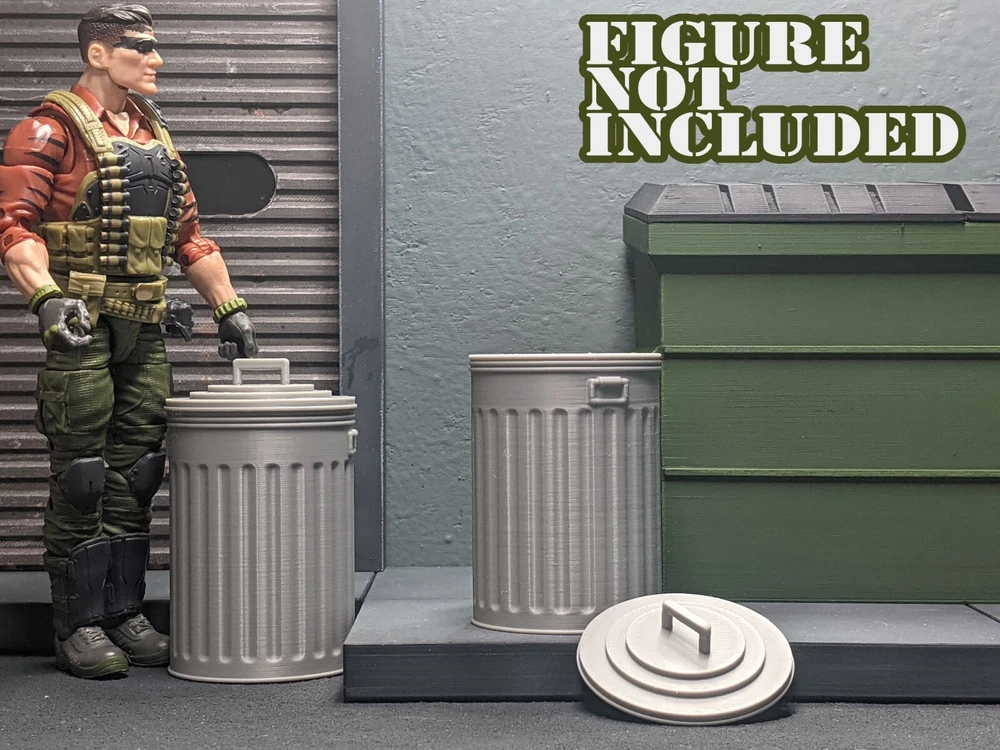 The action figure shown is not included. It is 6.3" tall and is shown only to clarify the size/scale. This diorama display prop is compatible with 6" action figu r e s. These metal trash can props are sold as a set of two. There are several versions to give you some options. The trash cans with removable lids take significantly longer to 3D print, which is why they cost more. If you do not need the trash cans to open, there's a more affordable option which is printed as one solid piece (lid is not removable). These are sold as sets of two and there are 3 versions total : A) 2 Metal trash cans with non-removable lids B) 2 Metal trash cans with fully removable lids C) The combo deal, one trash can with removable lid, one solid piece with non-removable lid. The handles on the side are not-movable for either versio n. In real life, these type of metal trash can are created from galvanized steel. The 1/12 versions are 3D printed from gray plastic. If you plan to paint this diorama piece, a thin coat of primer before paint is highly recommended. Without primer the paint may not adhere properly and chip off. Dimensions Metal trash can with lid : 1.84" x 1.84" x 2.96" tall (including handle on lid) Not all screens show colors the same. Please understand the actual color many vary from the color you see on your screen. This item is 3D printed. Your order will be FDM 3D printed and shipped as soon as possible. Please note that due to print time and available printer time, this can take 1-3 business days. Please understand that small imperfections can be part of the 3D printing process. If you wish to clean this item, please do so with warm soapy water only. These items are not dishwasher-safe. This item is intended for indoor use only. Excessive UV light exposure can modify your item's color. All 3D printed items were designed and printed by myself, in Florida. These 1/12 scale action figure props are not toys, and are not suitable for children.