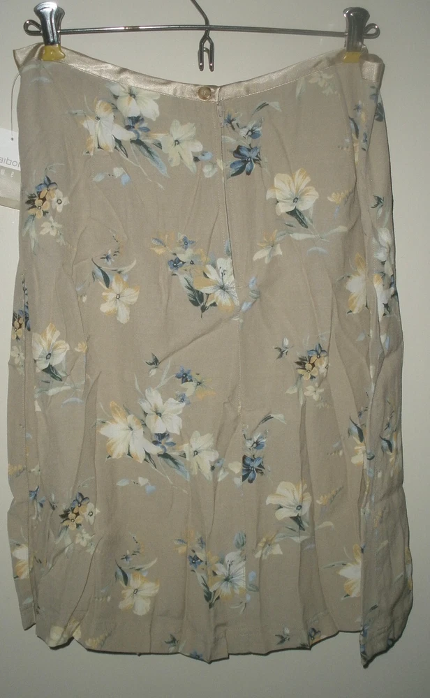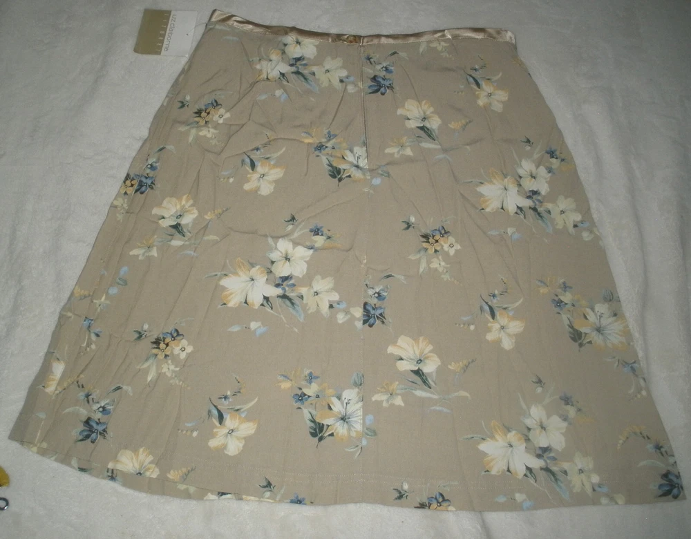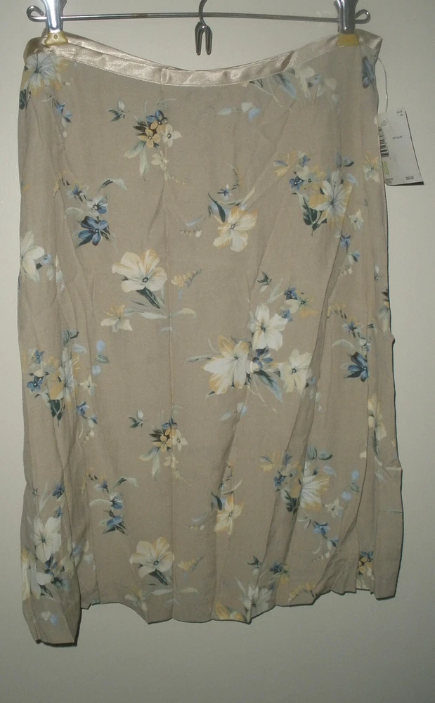 this is for Liz Claiborne Lizwear Skirt It is new with tags. It has no rips, tears or stains. IT is made of rayon The skirt is tan. It has an all over print. It has satin ribbon accent on the waistline. It has zipper down the back. IT is lightweight. Liz claiborne calls it Soft Allure. The waist measures laying flat 15" It measures down the back 22". It is a size 10 Manufacturers sizing's due vary please check measurements. If you have any questions or problems - before or after. Please message me.