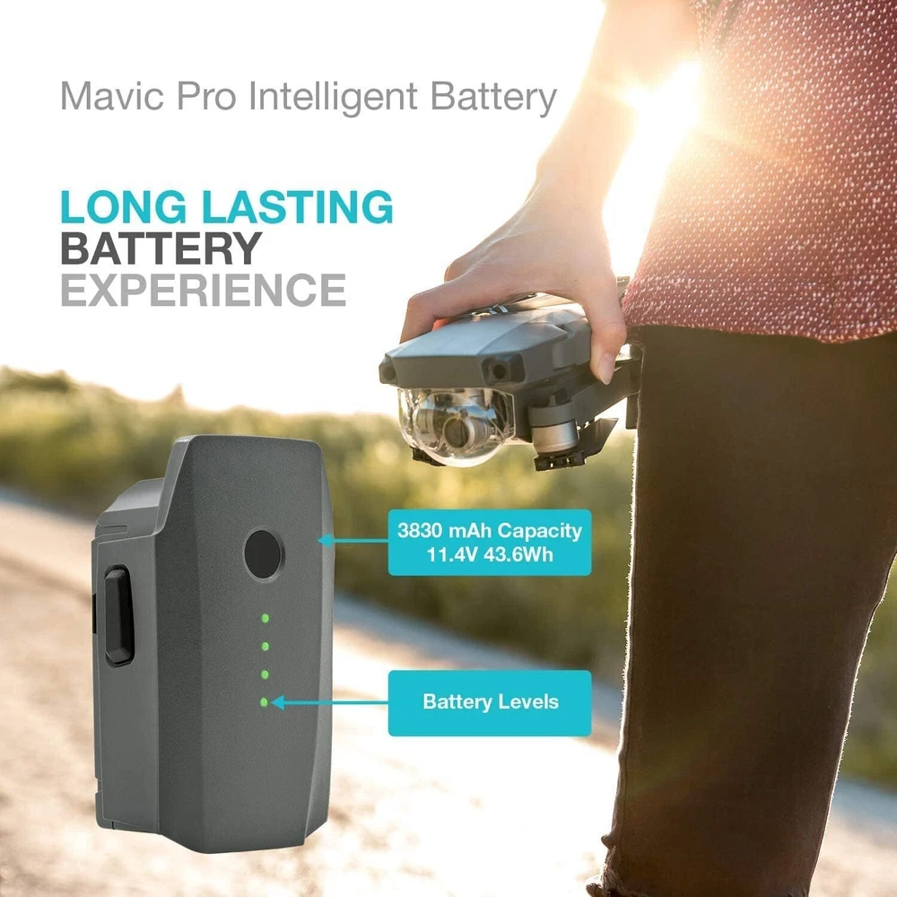 Product Description Specifications: Battery type: Lithium-Polymer Battery Output voltage: 11.4V Capacity: 3830mAh Power: 43.6Wh Battery Weight: 230g /8.11oz Power ON/OFF: Press once and holder the circular power button for 2 seconds to power on/off Compatible with: DJI Mavic Pro DJI Mavic Pro Platinum DJI Mavic Pro Alpine White Original DJI Mavic Pro Charger Not compatible with DJI Marvic 2 Package includes 2 x Battery for DJI Mavic Pro Drones NOTE: Please fully charged the battery before the first-time flight, and make several times flight test to make sure the battery fits your Mavic Pro Drone. And better charge with the OEM charger to avoid problems. Product Guarantee: Any problem, please feel free to contact us. Please click the "Ask a question" on our storefront or in "YOUR ORDER" options click the "contact seller". Tips: 1. Please fully charge the battery before each use. 2. Do not subject batteries to adverse conditions such as extreme temperature, deep cycling. Never leave a charging lithium battery unattended. 3. When the battery is unused, please take it out from the drone and store it in a dry, clean, cool, away from heat and metal objects. 4. When the battery is not used for a long time, we recommend using the battery at least once every two to three weeks. 5. After use, it is recommended that the battery be cooled and then recharged.