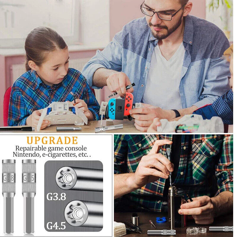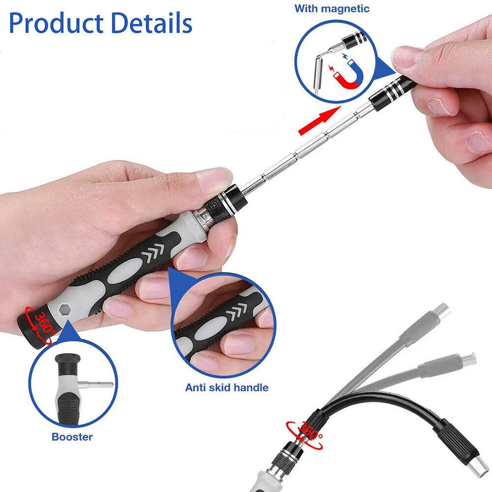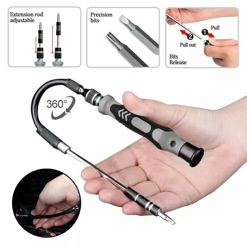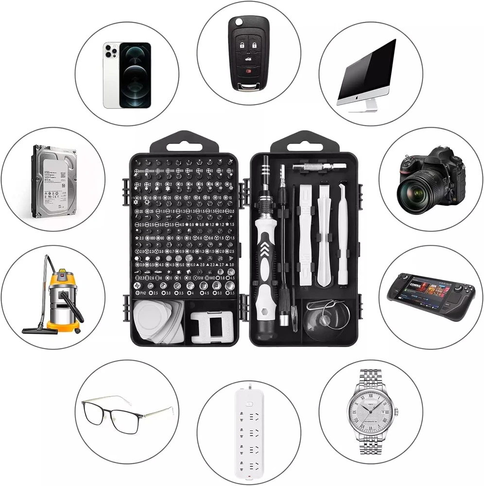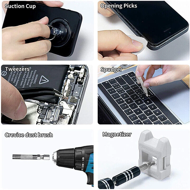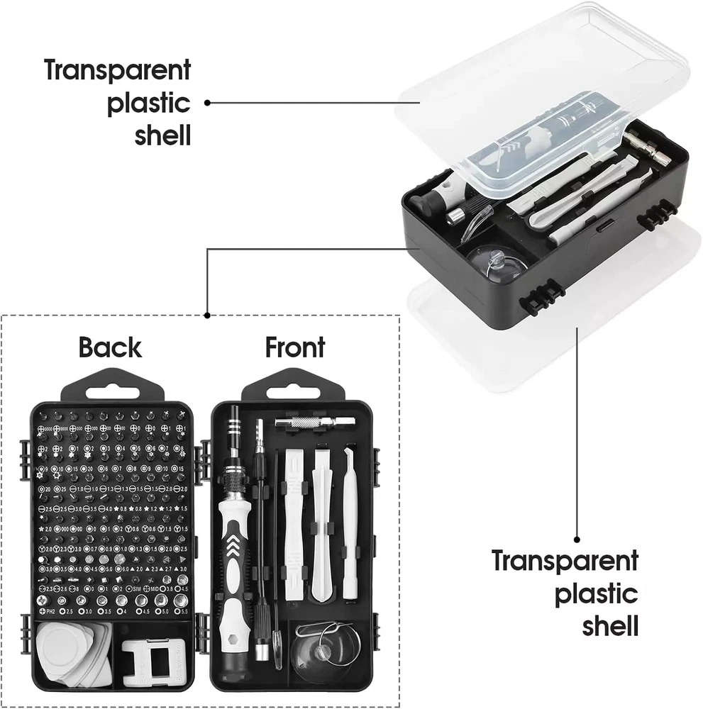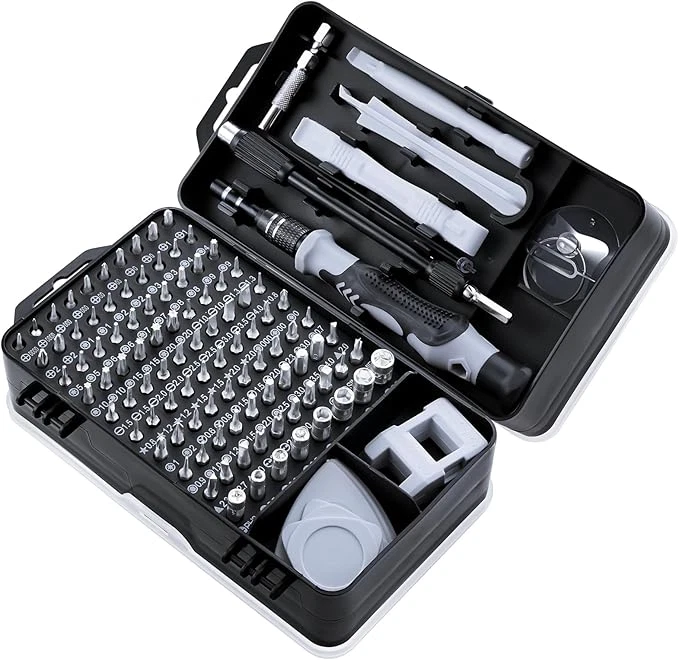 Product Features: Complete Repair Kit: This versatile 115-in-1 screwdriver set includes 98 different precision bits (Phillips, Flat, Torx, Pentalobe, Hexagon, and more) along with a variety of opening tools. Perfect for repairing electronics, smartphones, laptops, glasses, and other household items. High-Quality Military-Grade Bits: Made from durable chrome vanadium steel, these bits are designed to resist wear, oxidation, and corrosion, ensuring long-lasting performance. The magnetized tip easily picks up and secures screws, making it simple to handle even the smallest ones. Ergonomic Design for Comfort: The smooth, rotating cap and ergonomic PP + TPR handle provide maximum comfort and grip, making it easy to work on any project. The flexible extension tool is ideal for reaching screws in tight or hard-to-reach spaces. Sturdy Storage Case: The included storage case keeps all the components neatly organized and secure with a locking latch, ensuring everything is easy to find and portable for use on the go. Specifications: Phillips: PH000, PH00, PH0, PH1, PH2 Pozidriv: PZ0, PZ1, PZ2 Flathead: 1.0mm, 1.5mm, 2.0mm, 2.5mm, 3.0mm, 3.5mm, 4.0mm Torx: T3, T4, T5, T6, T7, T8, T9, T10, T15, T20 Hexagon: 0.7mm, 0.9mm, 1.3mm, 1.5mm, 2.0mm, 2.5mm, 3.0mm, 4.0mm Triangle: 2.0mm, 2.3mm, 2.7mm, 3.0mm Y-Shaped: 2.0mm, 3.0mm U-Shaped: 2.6mm 4mm Socket: M2.5, M3.0, M3.5, M4.0, M4.5, M5.0, M5.5 Package Includes: 98 * Precision Bits 8 * Opening Picks 3 * Pry Bars 1 * Tweezers 1 * Extension Rod 1 * Adapter 1 * SIM Pin 1 * Suction Cup 1 * Retractable Handle
