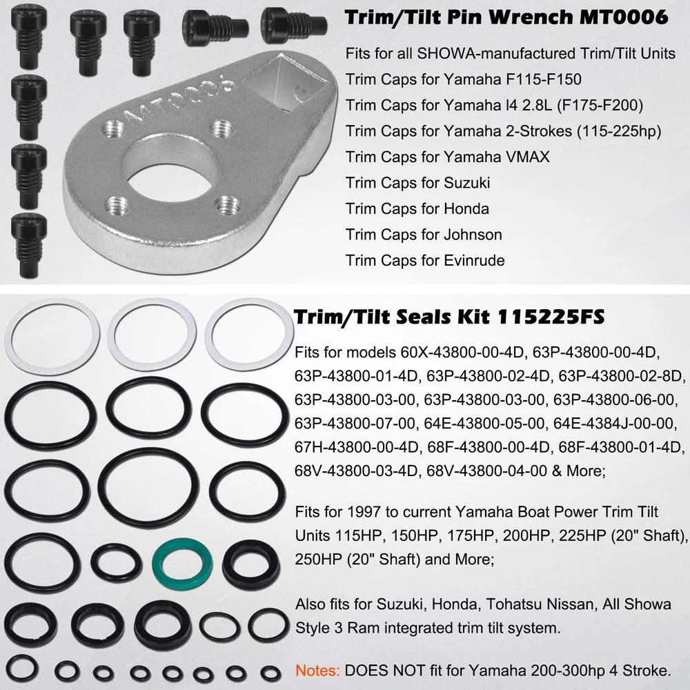 【MT0006 Pin Wrench】Fits for all SHOWA-manufactured Trim/Tilt Units: Trim Caps for Yamaha F115-F150; Trim Caps for Yamaha l4 2.8L (F175-F200); Trim Caps for Yamaha 2-Strokes (115-225hp); Trim Caps for Yamaha VMAX; Trim Caps for Suzuki; Trim Caps for Honda; Trim Caps for Johnson; Trim Caps for Evinrude. 【115225FS Trim Tilt Seals Set】Fits for 1997 to current Yamaha Boat Power Trim Tilt Units 115HP, 150HP, 175HP, 200HP, 225HP (20" Shaft), 250HP (20" Shaft) and More; Also fits for Suzuki / Honda / Tohatsu Nissan / All Showa Style 3 Ram integrated trim tilt system. (Notes: DOES NOT fit for Yamaha 200-300hp 4 Stroke.) 【High Performance】This ideal combination set is specially designed to easily & properly replaces the trim/tilt caps or seals for resealing your power trim, helps you effectively resolve the leaking issues and quickly rebuild your outboard motor, saving your time, energy and money. 【Superior Material】Made from top quality STEEL & RUBBER, prevent corrosion and rust, wear and impact resistance, sturdy and durable. High precision and hardness ensure long term reliable service. 【100% Satisfaction Guarantee】If you're not satisfied with this set, simply return it for getting refund in 30 days. While you have any questions about our products, please feel free to contact us and we will provide the best service. Always buy confidently in !