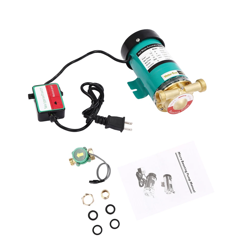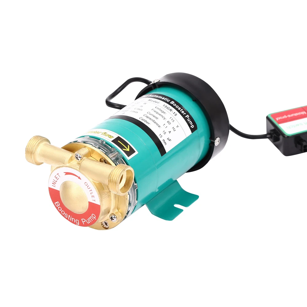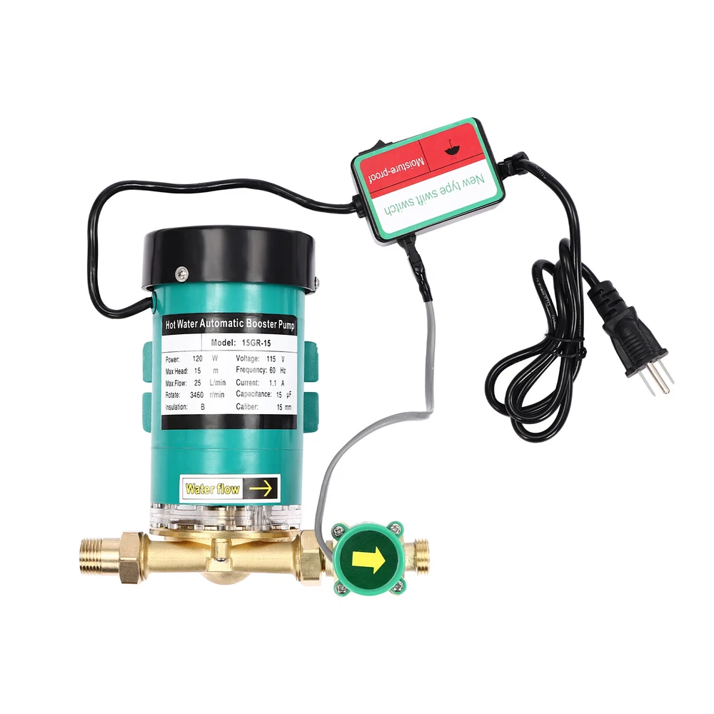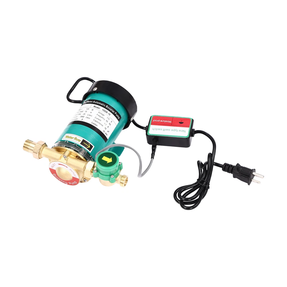 Package Included 1*Water Pressure Booster Pump 1*Water Flow Switch 1*English Manual Other Needed Accessories Specifications Color: Green Model: 15GR-15 Process: Bake Paint Assembly Required: Yes Plug Type: US Standard Motor Type: Copper Core Motor Material: Copper, Aluminum, Iron, Plastic Protection Level: IP45 Current: 1.1A Power: 120W Voltage: 115V Frequency: 60Hz Rotate: 3460r/min Capacitance: 15μF Max Head: 15m/49.2ft Max Flow: 25L/min/396GPH Max. Water Pressure: 1.5bar/21.7PSI Insulation: B Noise: 30-50dB Max. Water Temperature Range: 80-100℃/176-212℉ Power Cord Length: 1m/3.28ft Product Height: 19.5cm/7.68inch Pump Body Diameter: 7.5cm/2.95inch Total Length: 18.5cm/7.28inch Connection Size: G1/2" Outlet Diameter: 3/4" 115V 120W Household Shower Booster Pump Automatic Boost Water Pressure Pump IP45 120W 115V Household Booster Pump Automatic Boost Water Pressure Pump Fits Shower Description This 120W water pressure booster pump will provide you with an easy solution to the worry of insufficient water pressure in your home. The efficient pressure increase function it brings will make your life more comfortable and convenient. Its simple appearance design is suitable for various home occasions. Besides, it comes with a swift switch, which makes it easy to operate, bringing more convenience and comfort to your home life. Key Features High-quality Material: The copper, aluminum, iron, plastic, and bake paint treatment will effectively protect this product from corrosion, abrasion, high temperature, and rust, keeping it useful for a long time. Excellent Performance: The 120W powerful copper core motor provides this product 21.7PSI maximum pressure, 396GPH flow rate, and 49.2ft head, which will bring you a strong and stable water pressure and allow you to have a comfortable shower. Thoughtful Design: Designed with a water flow switch, it can automatically adjust to your needs, increase the pressure of the household water tank, and keep a steady pressure. Low Noise: It will operate at a noise level of about 30-50db, which is equivalent to the sound of a normal conversation, and will not affect the normal life of your family and neighbors. Safety Protection: The water and electricity isolation design, ground protection, leakage protection, water shortage protection, overheating protection, anti-idling , and overload protection greatly improve the safety of use. Quick Heat Dissipation: The powerful cooling fan and multiple heat dissipation holes can accelerate the efficiency of heat dissipation to protect the motor from overheating and extend the service life of this product. Simple Installation: We provide you with the necessary accessories and an English manual so that you can install it with less time and effort. Compact Size: It will only take up a small area, which is very space-saving. Details Standard Interfaces: They allow you to easily connect the water pipes(not included) to this product. Stable Base: It prevents the pump from skidding and reduces noise during operation. Switch Control: The moisture-proof swift switch makes it simple and quick to control this product on/off, bringing more convenience to your operation. Application It applies to duplex apartments, suburban villas, high-rise buildings with low water pressure, kitchens, bathrooms, water heaters pressurized, household water pressurized, and solar water heaters pressurized. It is suitable for water heater pipe pressurization with insufficient water pressure to prevent the water supply from being cold. How to Install: Wrap sealing tape(not included) around the inlet, add a gasket, and screw on the adapter. Wrap sealing tape(not included) around the outlet, add a gasket, and screw on the water flow switch. Connect the water inlet to the water pipe(not included). Connect the water outlet to the water heater water pipe(not included). After fixing the pump, make sure it is installed correctly, then turn on the power and use it. Specifications Color: Green Model: 15GR-15 Process: Bake Paint Assembly Required: Yes Plug Type: US Standard Motor Type: Copper Core Motor Material: Copper, Aluminum, Iron, Plastic Protection Level: IP45 Current: 1.1A Power: 120W Voltage: 115V Frequency: 60Hz Rotate: 3460r/min Capacitance: 15μF Max Head: 15m/49.2ft Max Flow: 25L/min/396GPH Max. Water Pressure: 1.5bar/21.7PSI Insulation: B Noise: 30-50dB Max. Water Temperature Range: 80-100℃/176-212℉ Power Cord Length: 1m/3.28ft Product Height: 19.5cm/7.68inch Pump Body Diameter: 7.5cm/2.95inch Total Length: 18.5cm/7.28inch Connection Size: G1/2" Outlet Diameter: 3/4" Packaging Size: 24*20*12cm/9.45*7.87*4.72inch Gross Weight: 3.7kg/8.16lbs Net Weight: 3.4kg/7.5lbs Package Included 1*Water Pressure Booster Pump 1*Water Flow Switch 1*English Manual Other Needed Accessories Notes Water pipes are not included in this package. Before purchasing, please check the water pressure at home. If the water pressure at home is greater than the booster pump, the boosting effect will not be achieved. When the pump leaves the factory, a small amount of water may remain in the pump. This is due to strict tests on the pump to ensure quality and meet the testing standards. This does not mean that the pump has been used. Please strictly follow the instructions for installation and use, and pay attention to electrical installation specifications. Before use, please carefully check the cables, power supply, etc., and take protective measures to avoid safety hazards. We suggest that professionals install this product. It is forbidden to install it upside down to prevent water from leaking into the motor, which may cause a short circuit and burn the motor. When installing the water flow switch, place the cover face of the water flow switch facing upwards and make sure to tighten the movable joint next to the water flow switch. Once the water flow switch is turned, the internal screws may become loose due to compression, causing water leakage. Therefore, be sure to ti