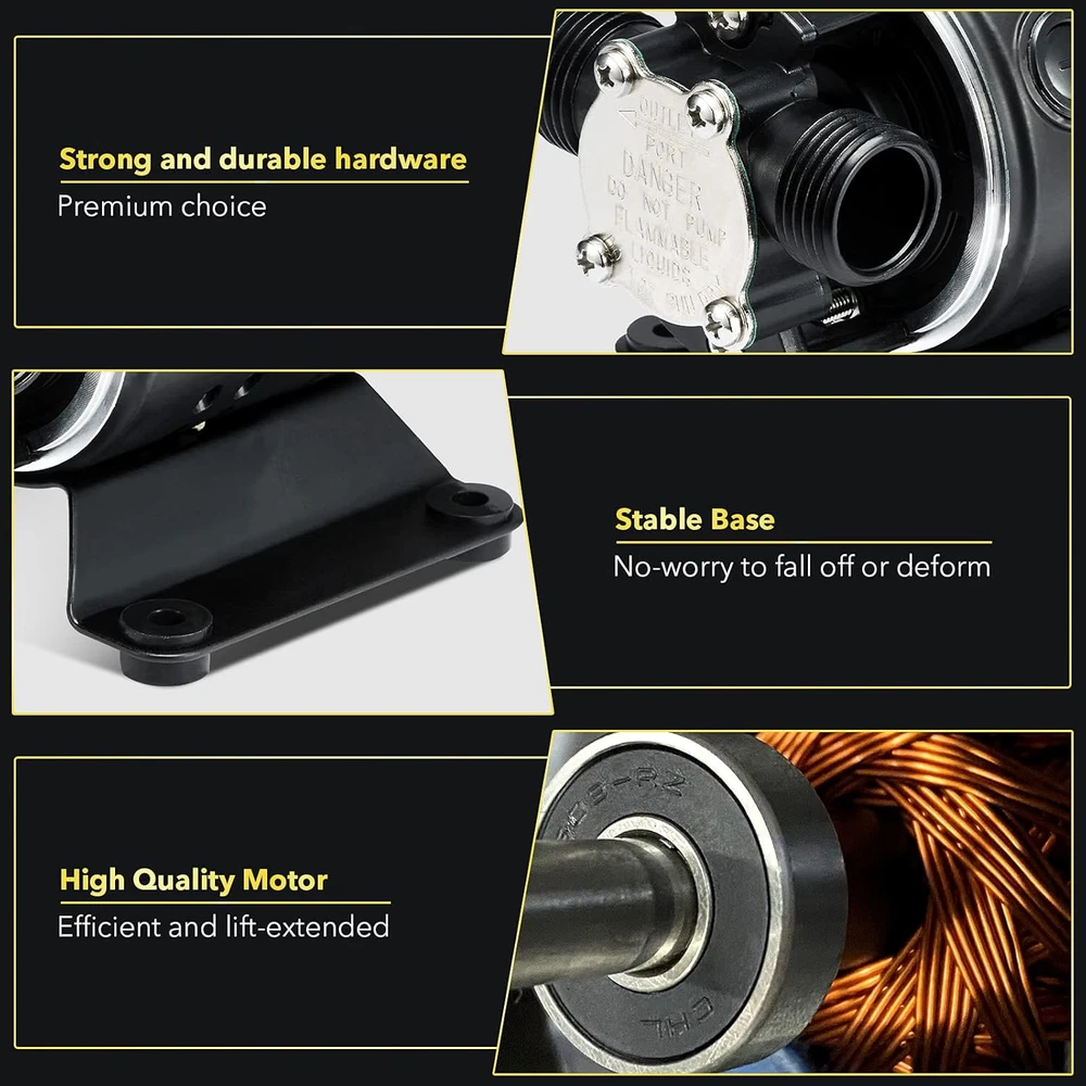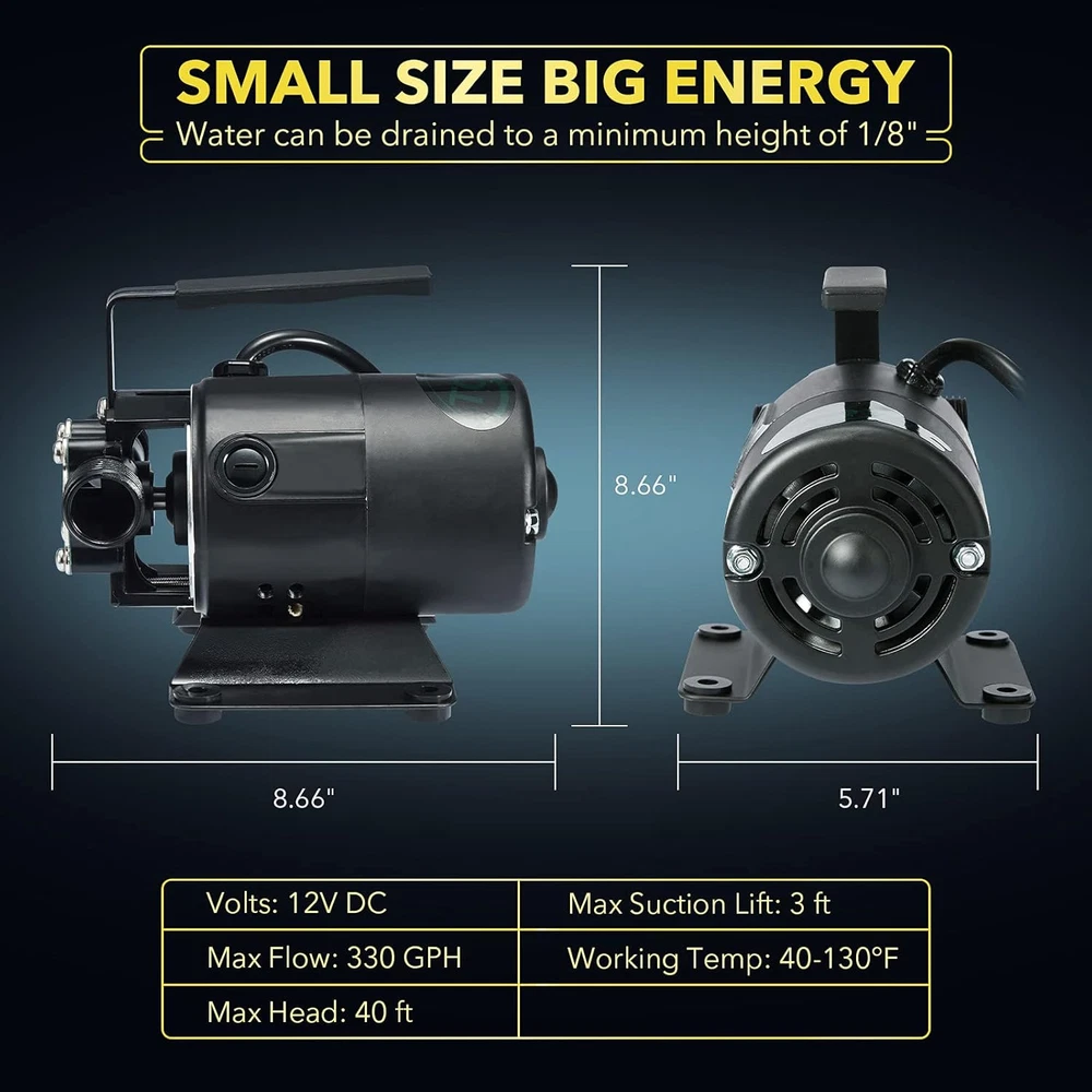 SELF-PRIMING AND EASY-TO-USE: Add some water in the pump and place the intake hose attachment in the water. Activate the pump and transfer water at a rate up to 330GPH. ULTRA-LIGHT AND PORTABLE: Light-weight and compact pump with 6ft cord line, this mini pump is easy to carry where you need it. POWERFUL: Large lifting capacity. Transfer water up to 330 GPH and the maximum head up to 44ft, remove water down to 1/8 inch of surface. DURABLE AND STURDY: Fully aluminium alloy pump body and pump bottom, good rust prevention, anti-fragile, easy for clean-up and maintenance and ensures an extension of service life. MULTI-PURPOSE: Perfect choice for transfering water from acquariums, flooding and leaking areas, water beds, clogged sinks, bathtub, etc. Product Description The TOXIC INC 115V 330 GPH non-submersible self-priming transfer pump is perfectly designed for water transfer and removal tasks. This mini pump can help to remove water from flooded areas, window wells, basements, basins, water tanks, bathtubs, leaking boats, etc. This product includes: 1. Water Pump with 6 ft. suction hose 2. Water suction strainer attachment 3. Replacement motor brush set (including impeller, gasket and brush) 4. User manual 5. Package box PLEASE NOTE: 1. This transfer pump is ONLY available for clear water transfer/removal. 2. NOT intended for use in sewage or septic systems 3. NOT intended for fuel or other flammable liquids. 4. To help extend service-life, before FIRST-TIME used or LONGTIME NOT used, the chamber needs to be filled with liquid prior to first-time operation to achieve better lubrication and sealing. We have to remind you that: This pump is self-priming, but we highly recommend you to add some water in the chamber before first-time operation, or long-term idle after use, which could bring better lubrication and sealing. This pump is not a submersible pump, do not submerge in water or other liquids, please always keep it dry. Please only use this pump to transfer clear water. Sewage and flammable or explosive fluids such as gasoline, fuel oil, kerosene, etc. are not applicable. Product features Scientific design High quality and performance Durable structure Multiple Application